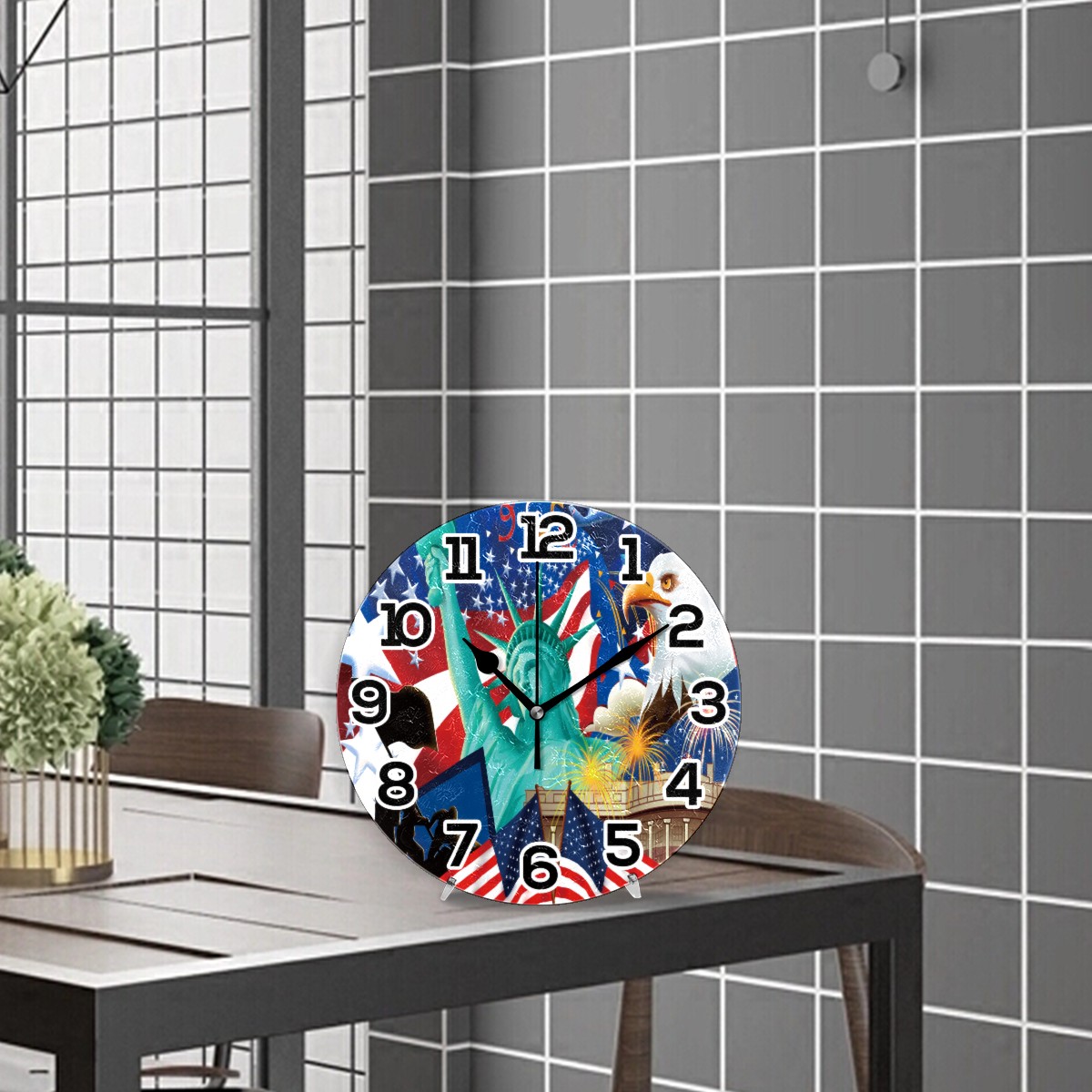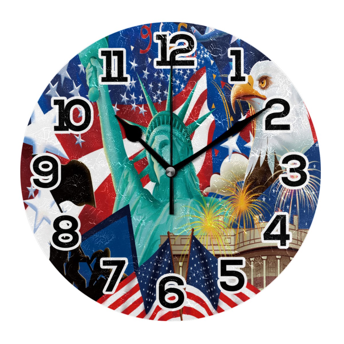 Statue Of Liberty American Flag Eagle Clock Wall Decor Acrylic Decorative Round Battery Operated Wall Clocks for Home Bedroom Living Room Decor Silent Non Ticking