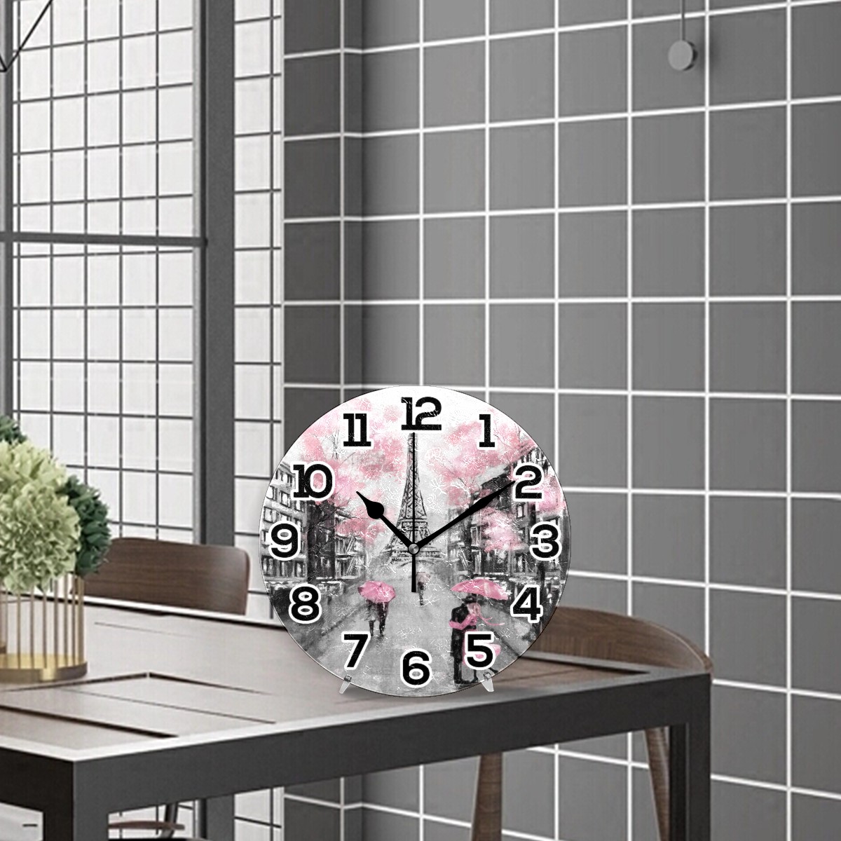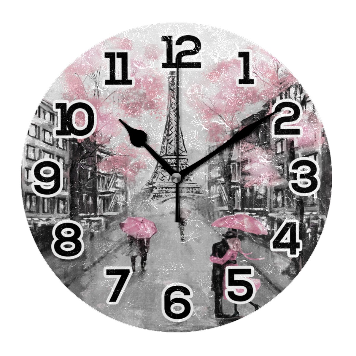 Paris Eiffel Tower Valentines Lover Clock Wall Decor Acrylic Decorative Round Battery Operated Wall Clocks for Home Bedroom Living Room Decor Silent Non Ticking