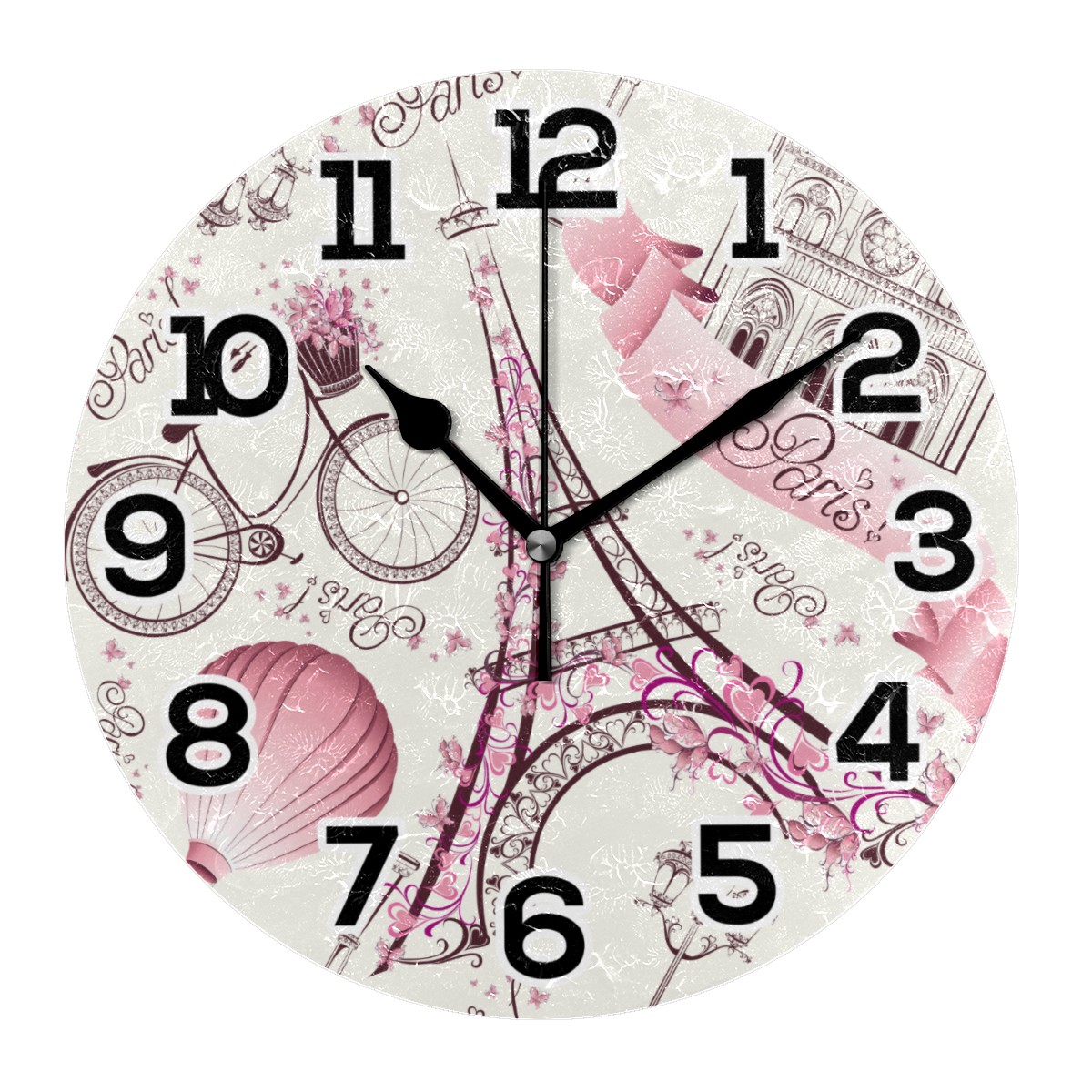 Paris Eiffel Tower Pink Retro Love Bike Hot Balloon Clock Wall Decor Acrylic Decorative Round Battery Operated Wall Clocks for Home Bedroom Living Room Decor Silent Non Ticking