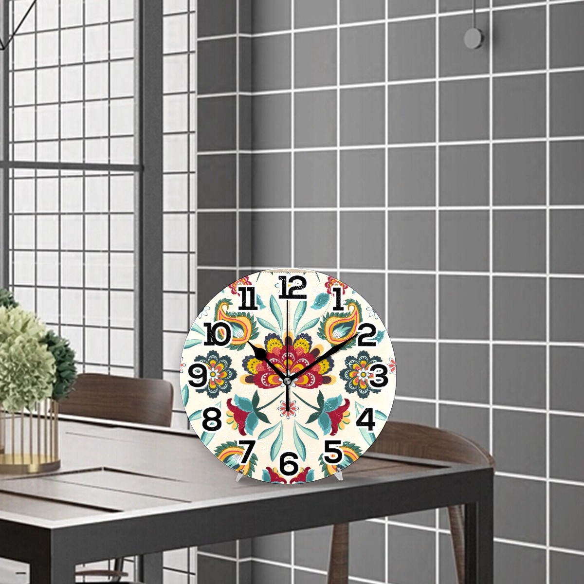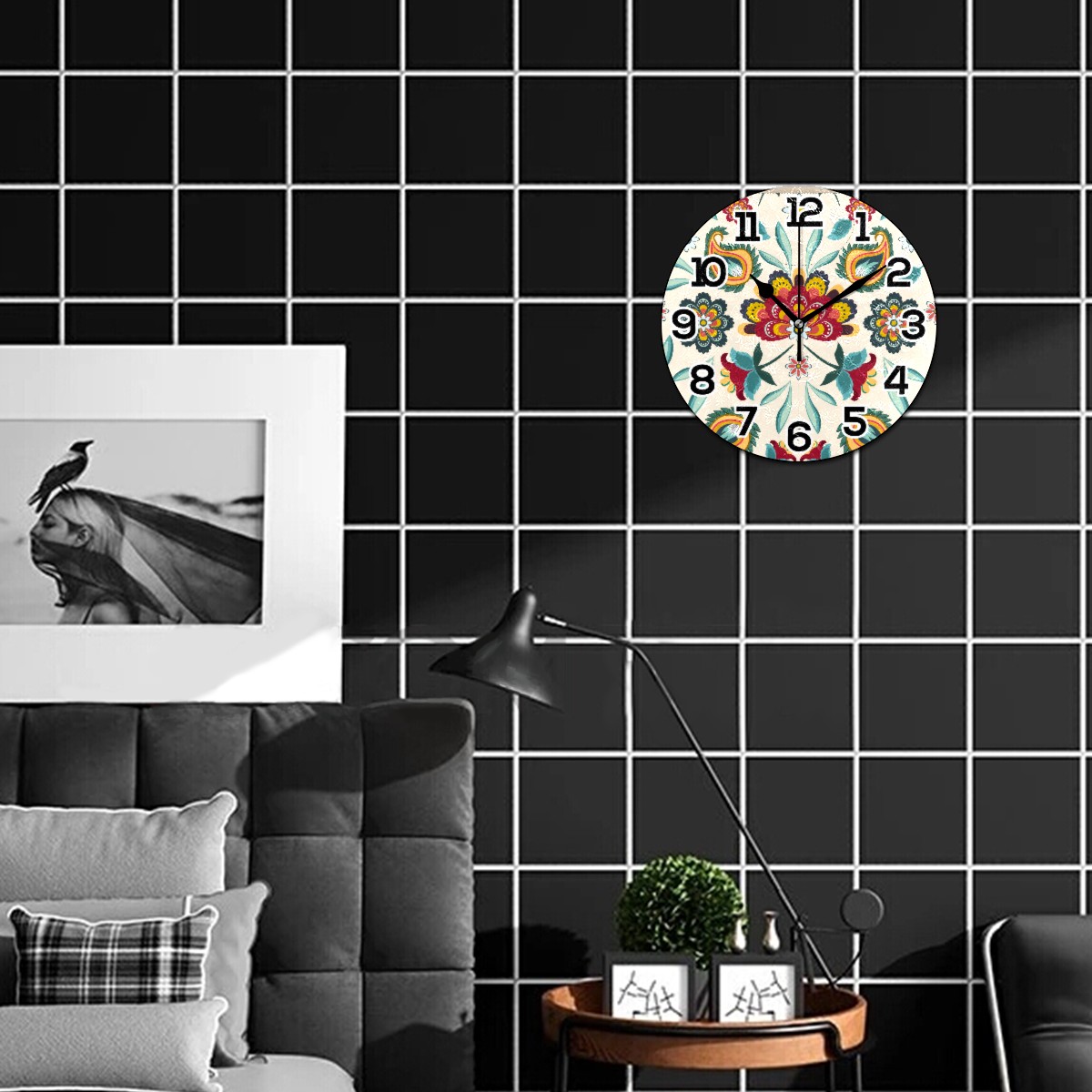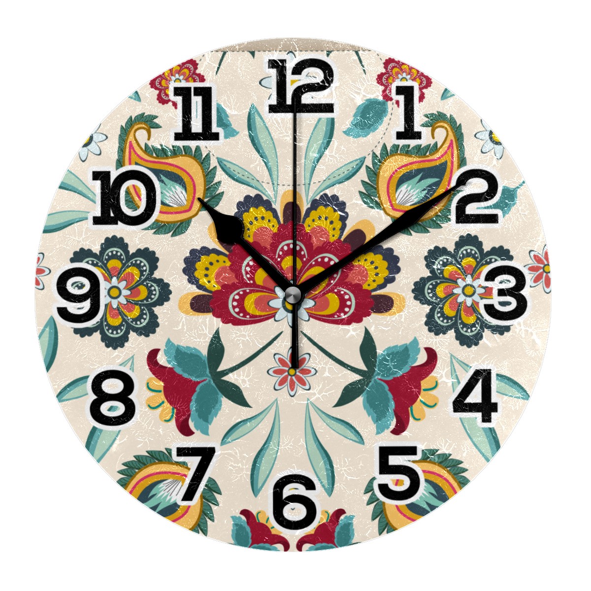 Vintage Retro Ethnic Boho Floral Print Clock Wall Decor Acrylic Decorative Round Battery Operated Wall Clocks for Home Bedroom Living Room Decor Silent Non Ticking