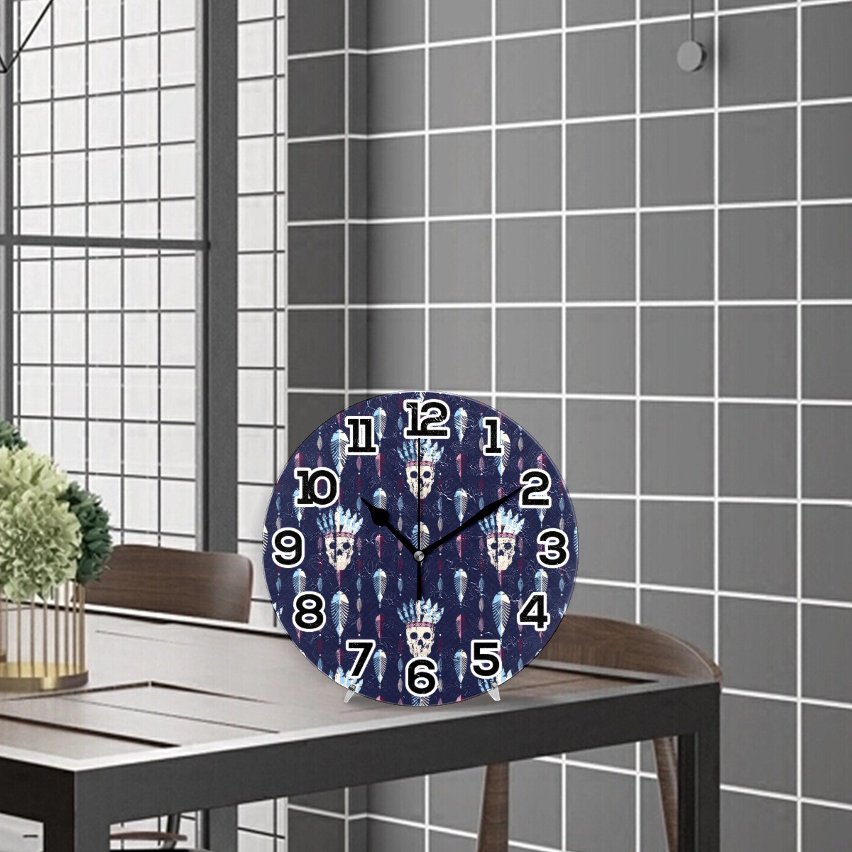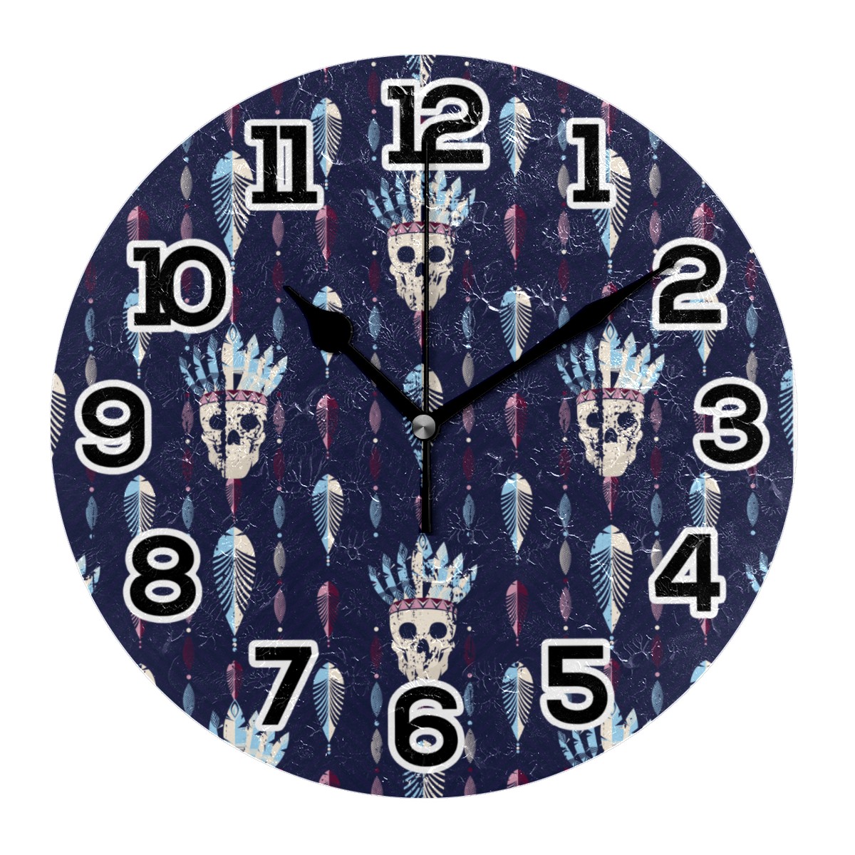 Tribal Indian Skull Pattern Clock Wall Decor Acrylic Decorative Round Battery Operated Wall Clocks for Home Bedroom Living Room Decor Silent Non Ticking