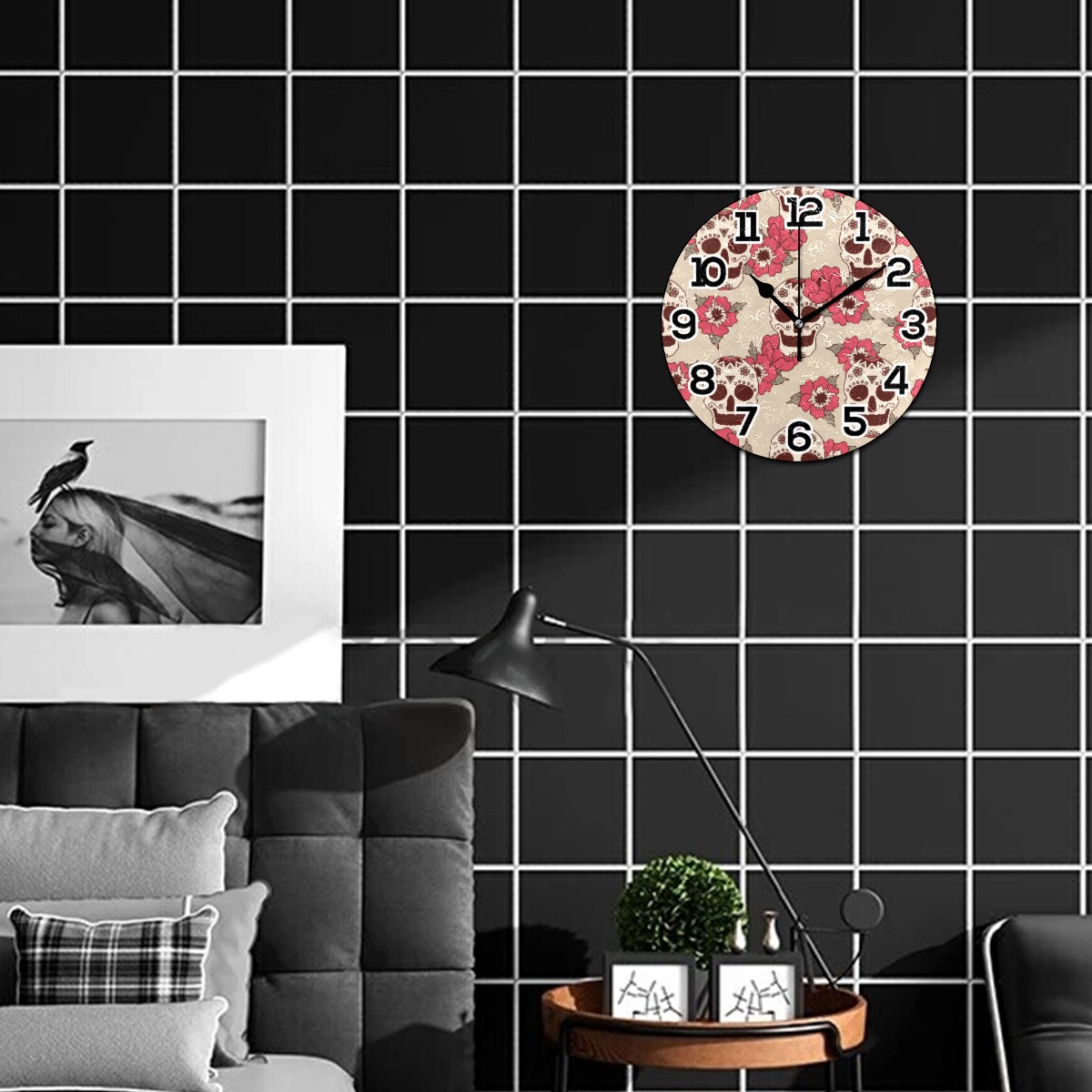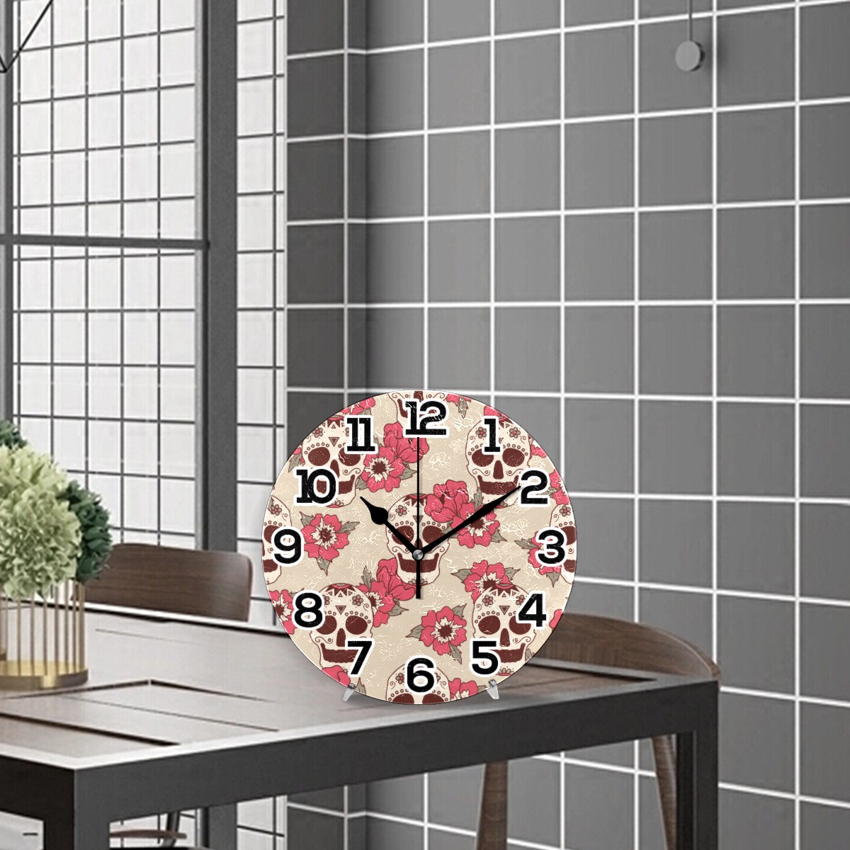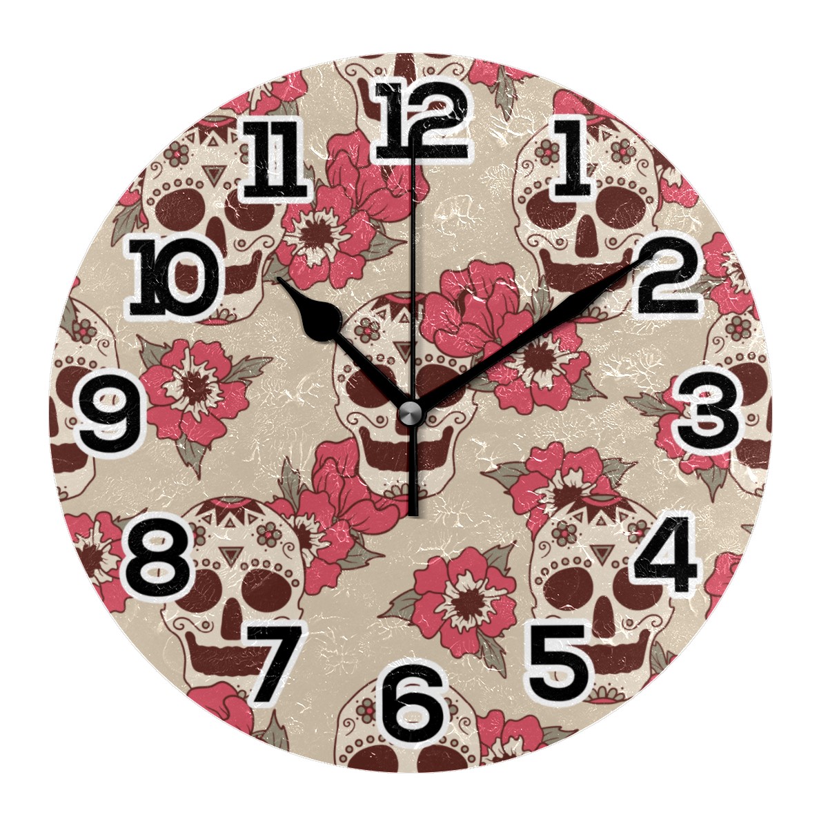 Rose Sugar Skull Pattern Clock Wall Decor Acrylic Decorative Round Battery Operated Wall Clocks for Home Bedroom Living Room Decor Silent Non Ticking