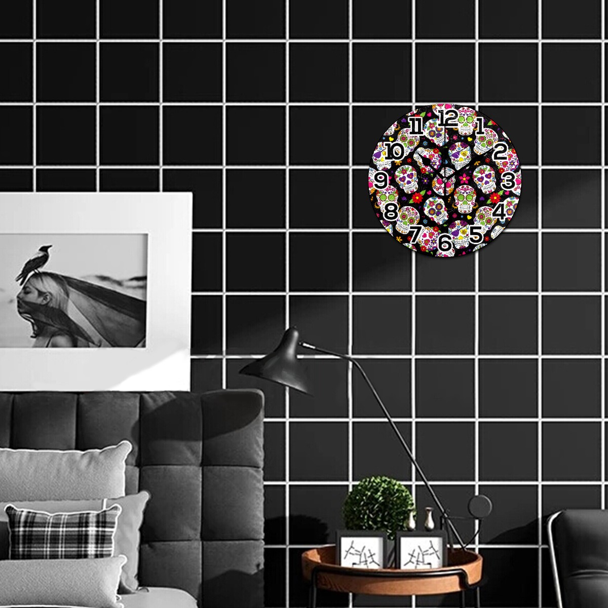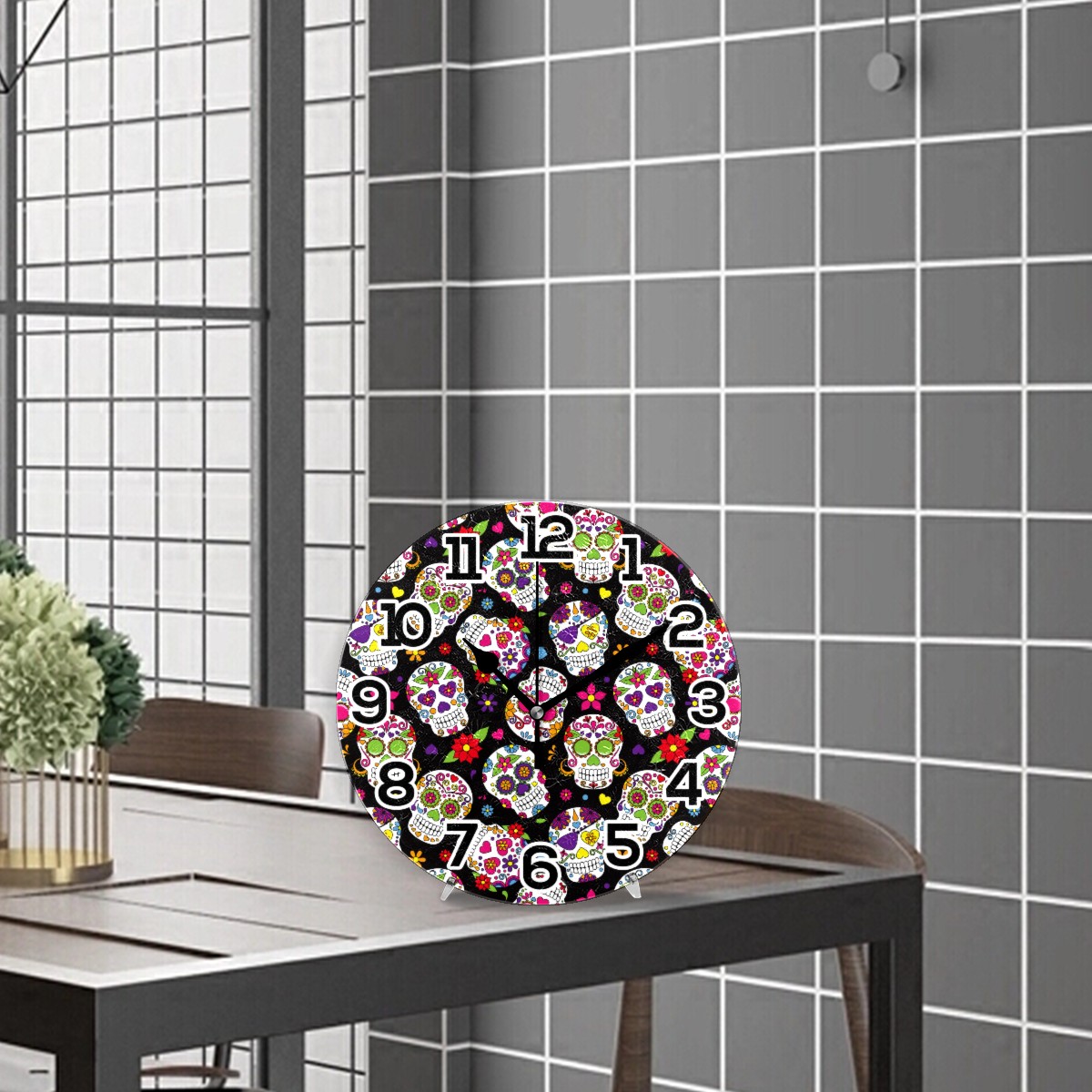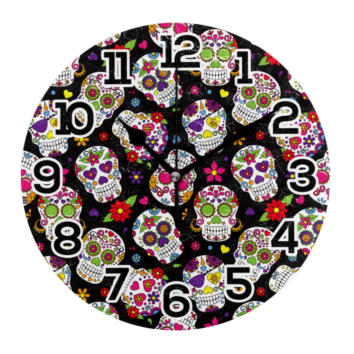 Mexico Sugar Skull Floral Pattern Clock Wall Decor Acrylic Decorative Round Battery Operated Wall Clocks for Home Bedroom Living Room Decor Silent Non Ticking