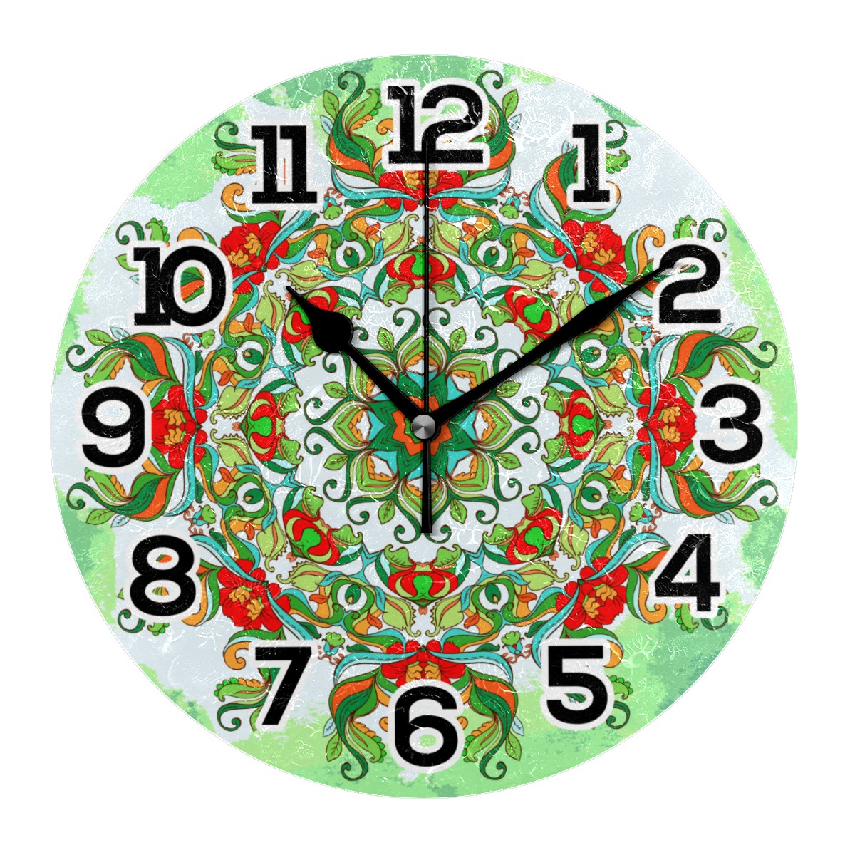 Green Trippy Mandala Floral Clock Wall Decor Acrylic Decorative Round Battery Operated Wall Clocks for Home Bedroom Living Room Decor Silent Non Ticking