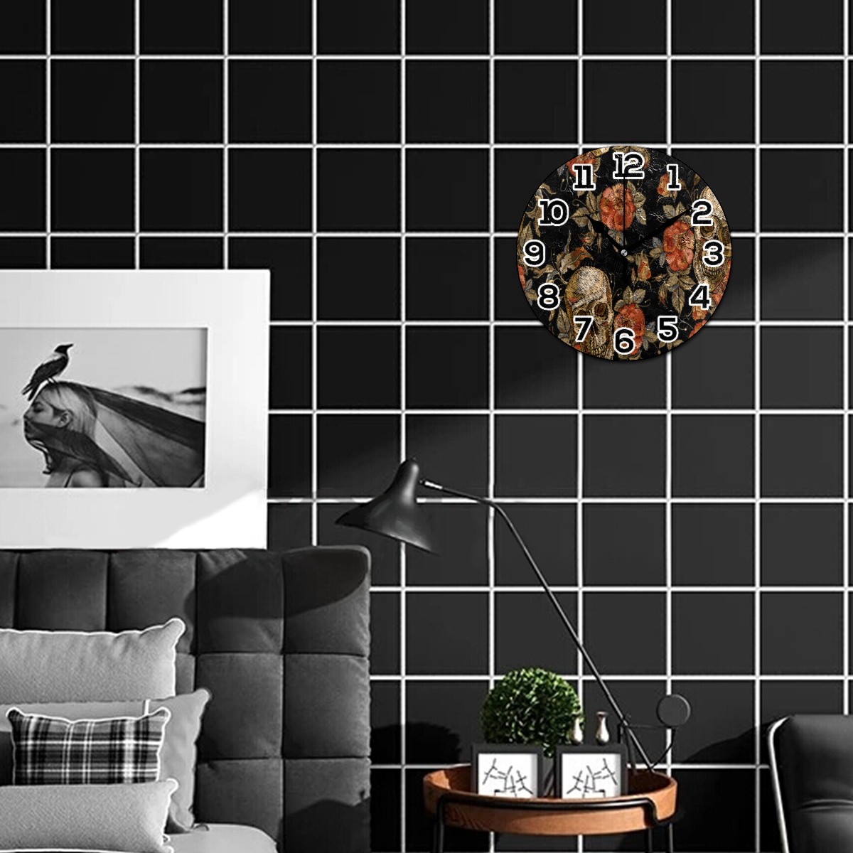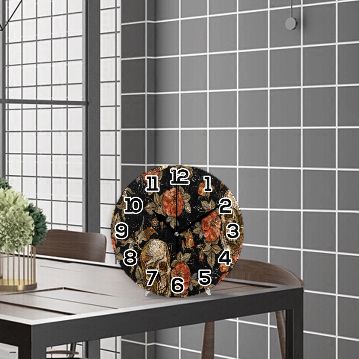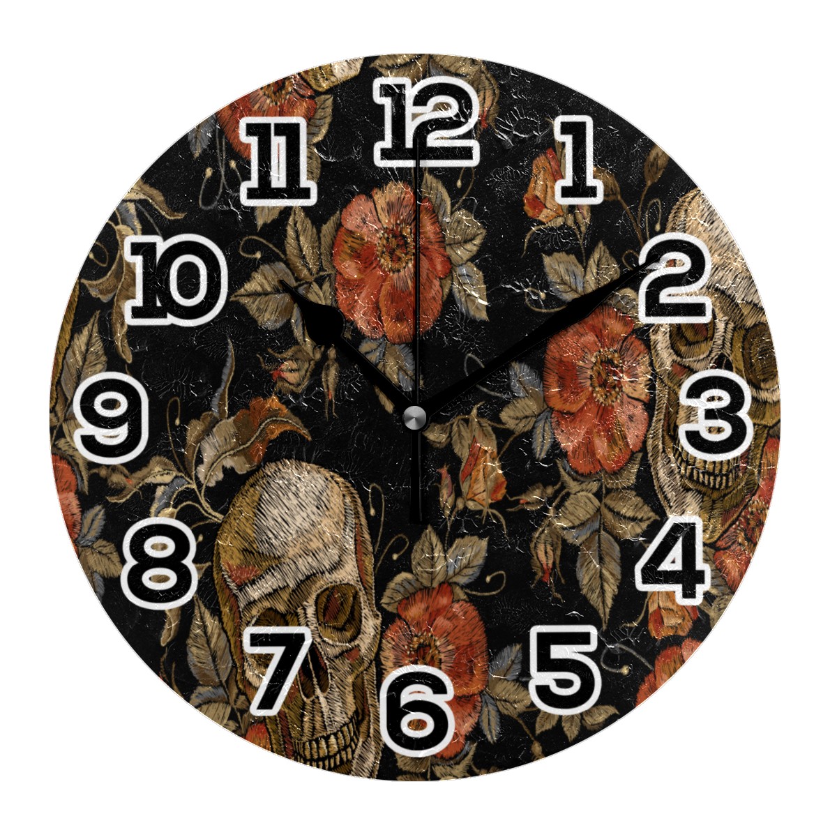 Embroidery Sugar Skull Rose Print Clock Wall Decor Acrylic Decorative Round Battery Operated Wall Clocks for Home Bedroom Living Room Decor Silent Non Ticking