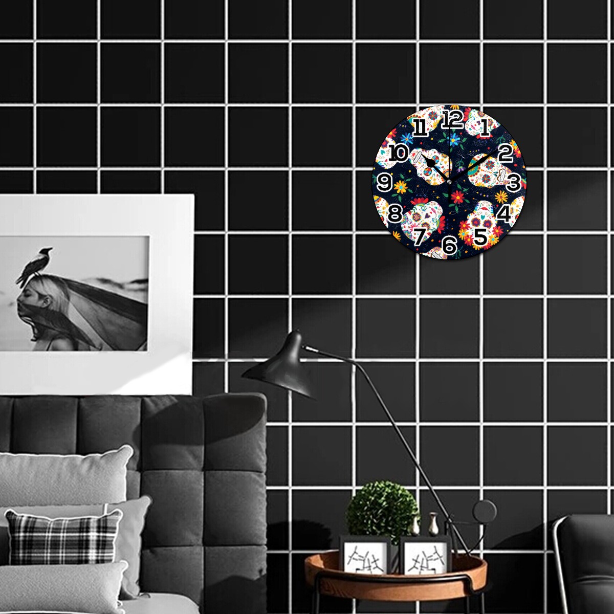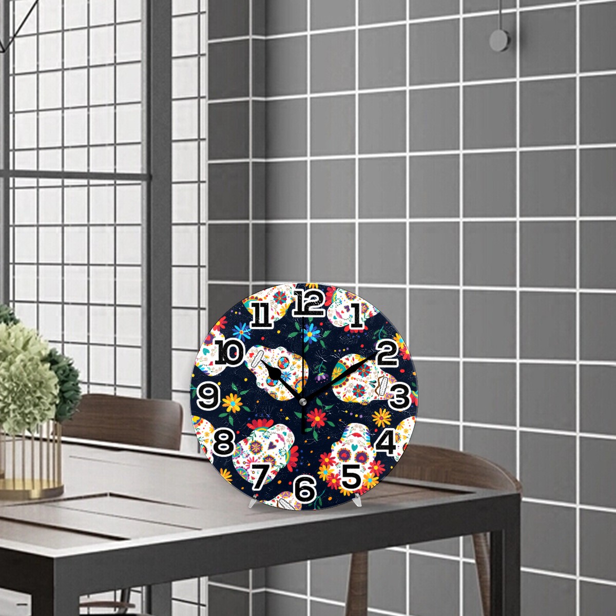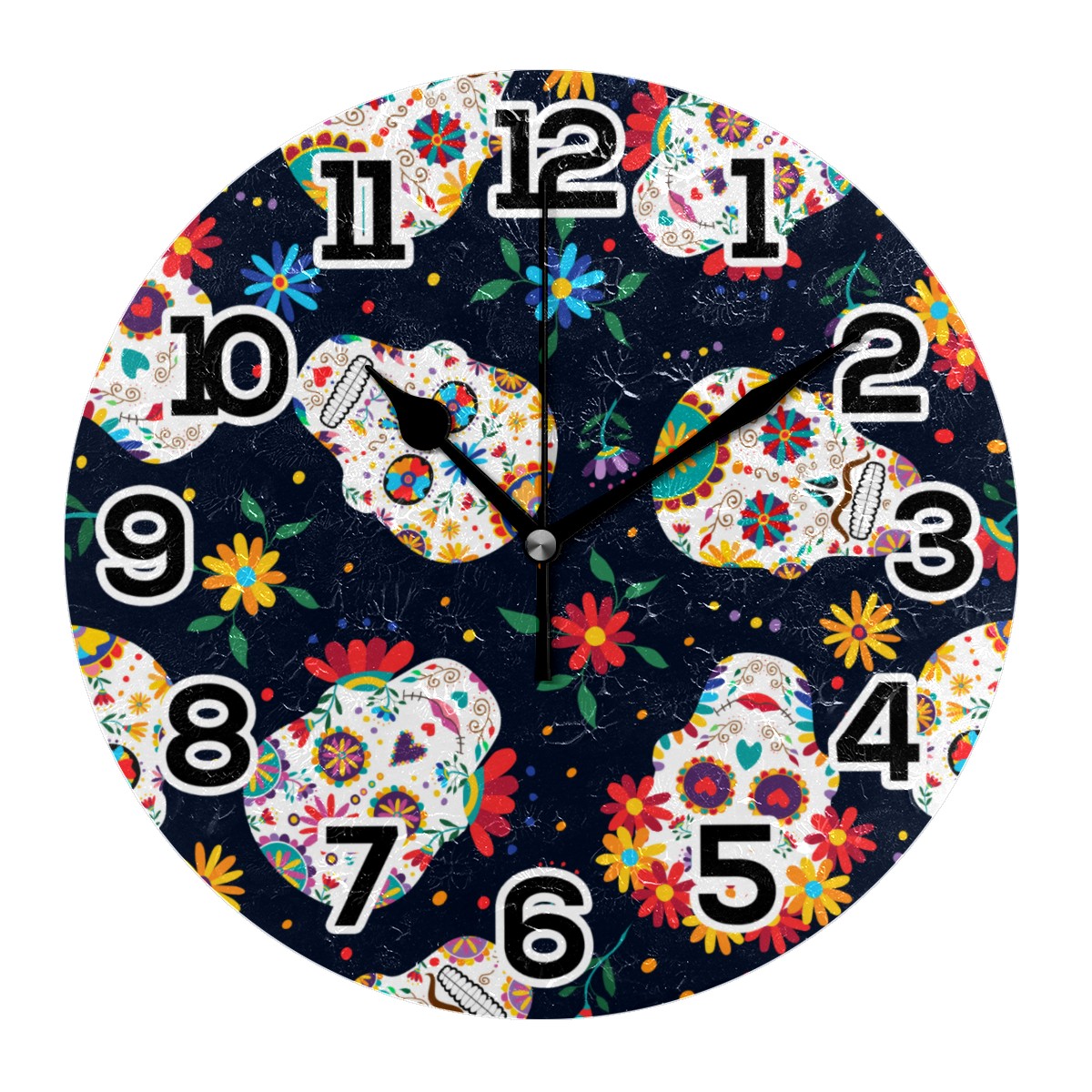Colorful Sugar Skull Floral Pattern Clock Wall Decor Acrylic Decorative Round Battery Operated Wall Clocks for Home Bedroom Living Room Decor Silent Non Ticking