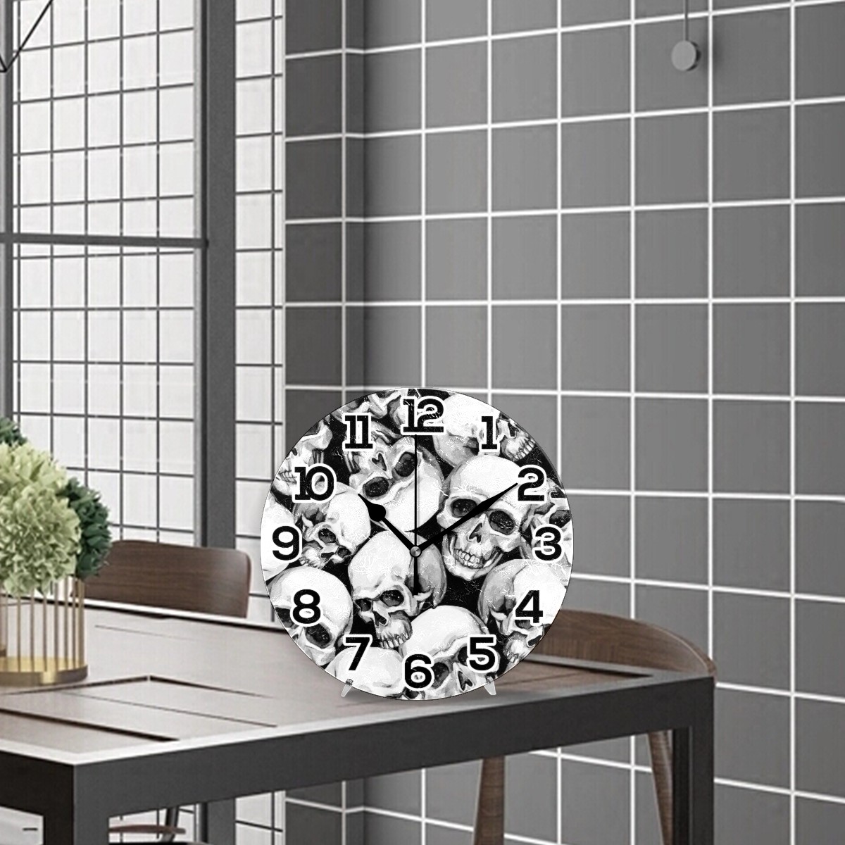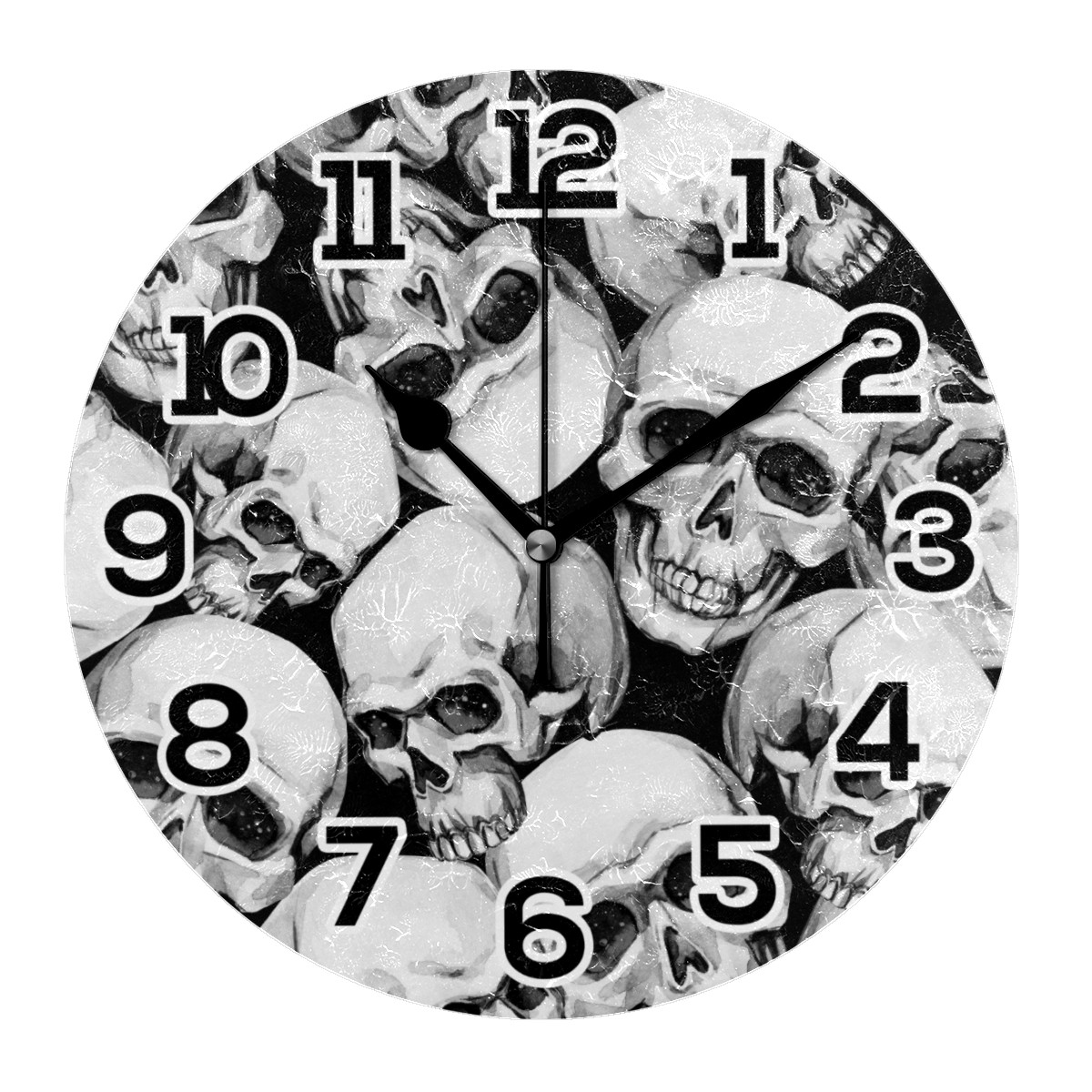 Black White Skull Pattern Clock Wall Decor Acrylic Decorative Round Battery Operated Wall Clocks for Home Bedroom Living Room Decor Silent Non Ticking
