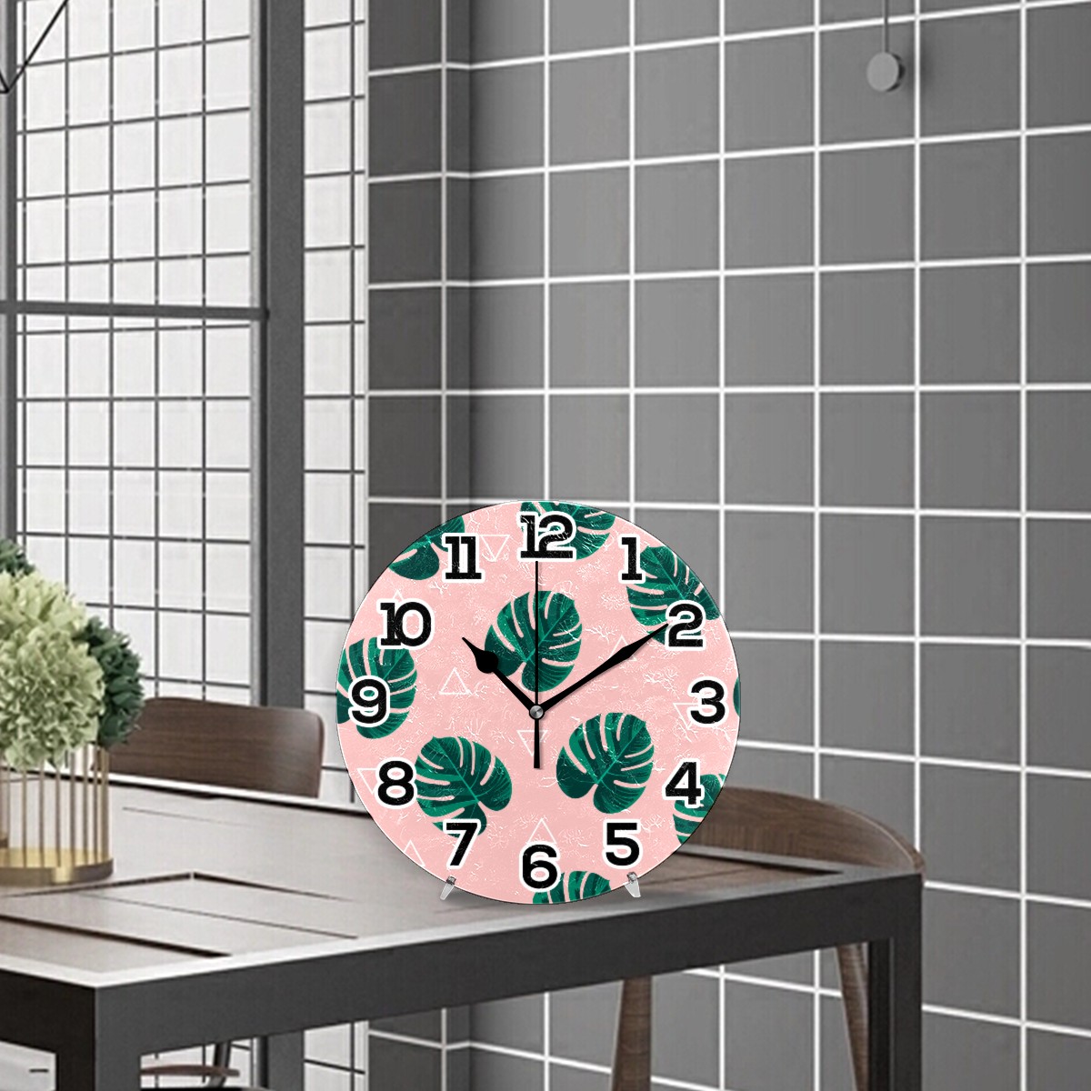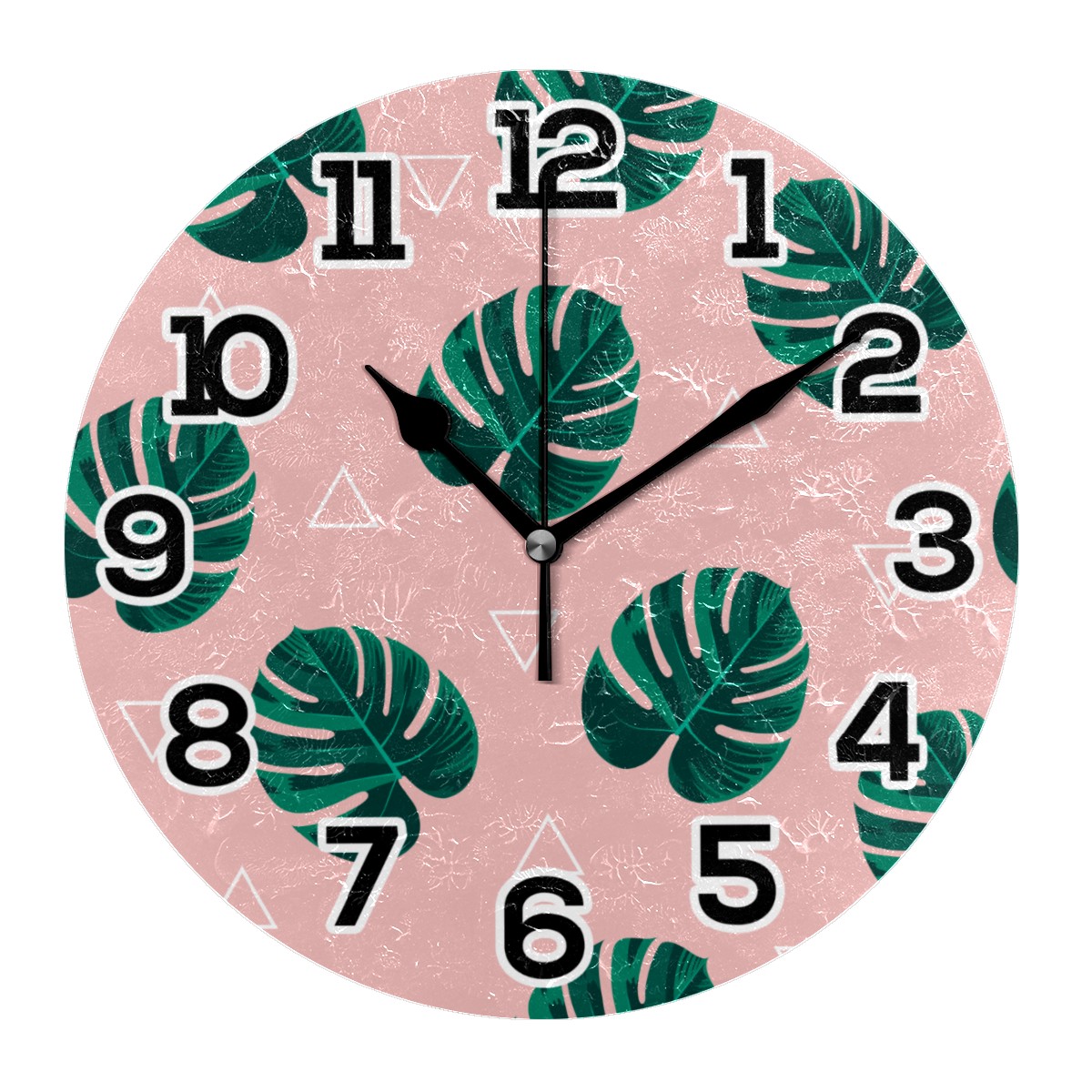 Tropical Palm Triangle Pattern Clock Wall Decor Acrylic Decorative Round Battery Operated Wall Clocks for Home Bedroom Living Room Decor Silent Non Ticking