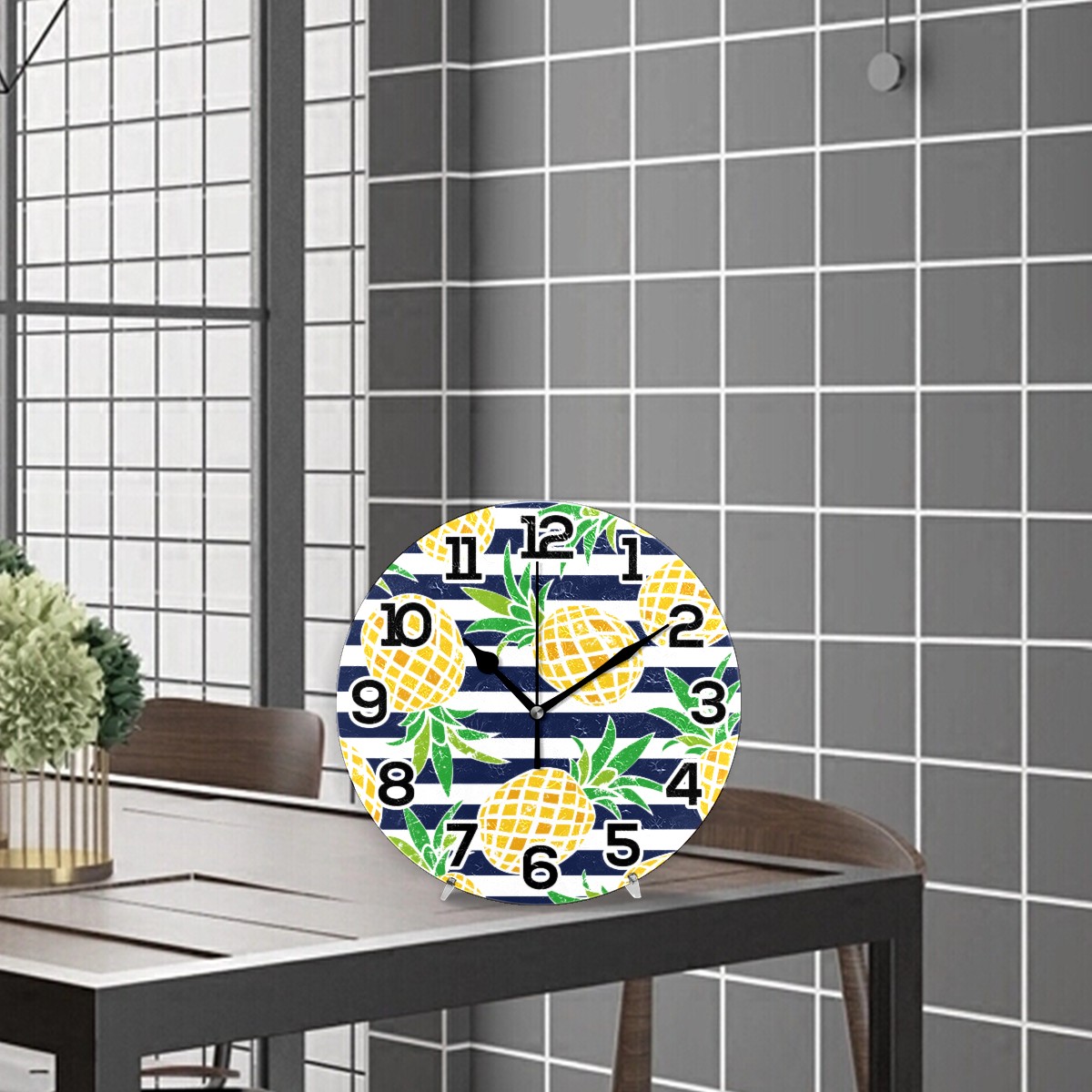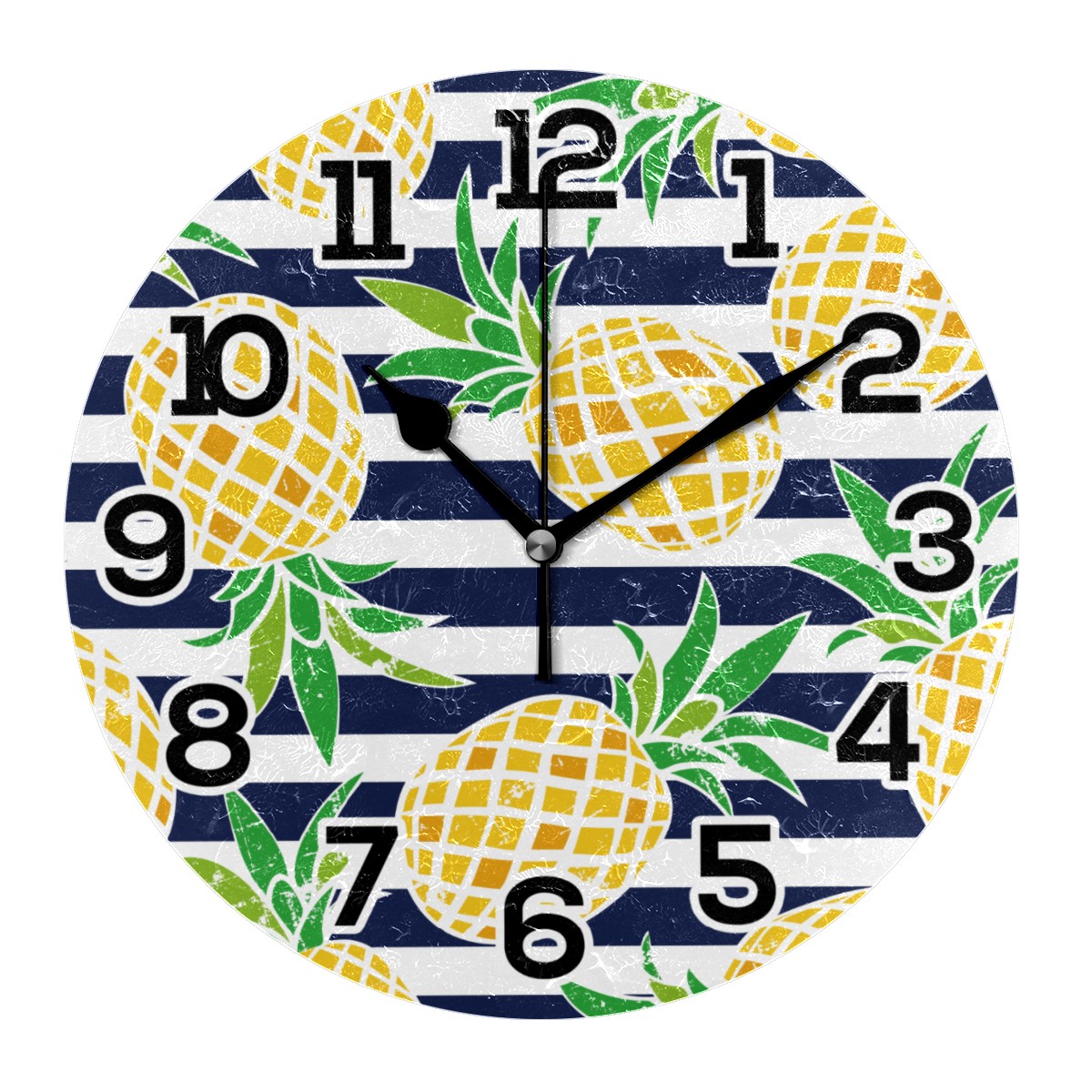 Pineapple Stripes Pattern Clock Wall Decor Acrylic Decorative Round Battery Operated Wall Clocks for Home Bedroom Living Room Decor Silent Non Ticking