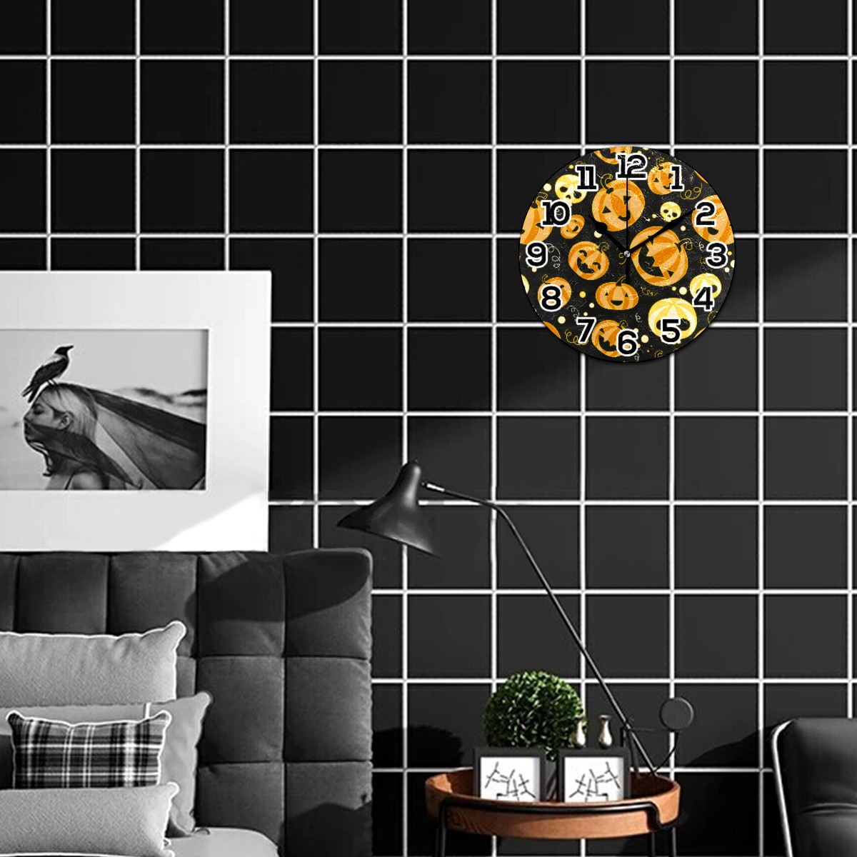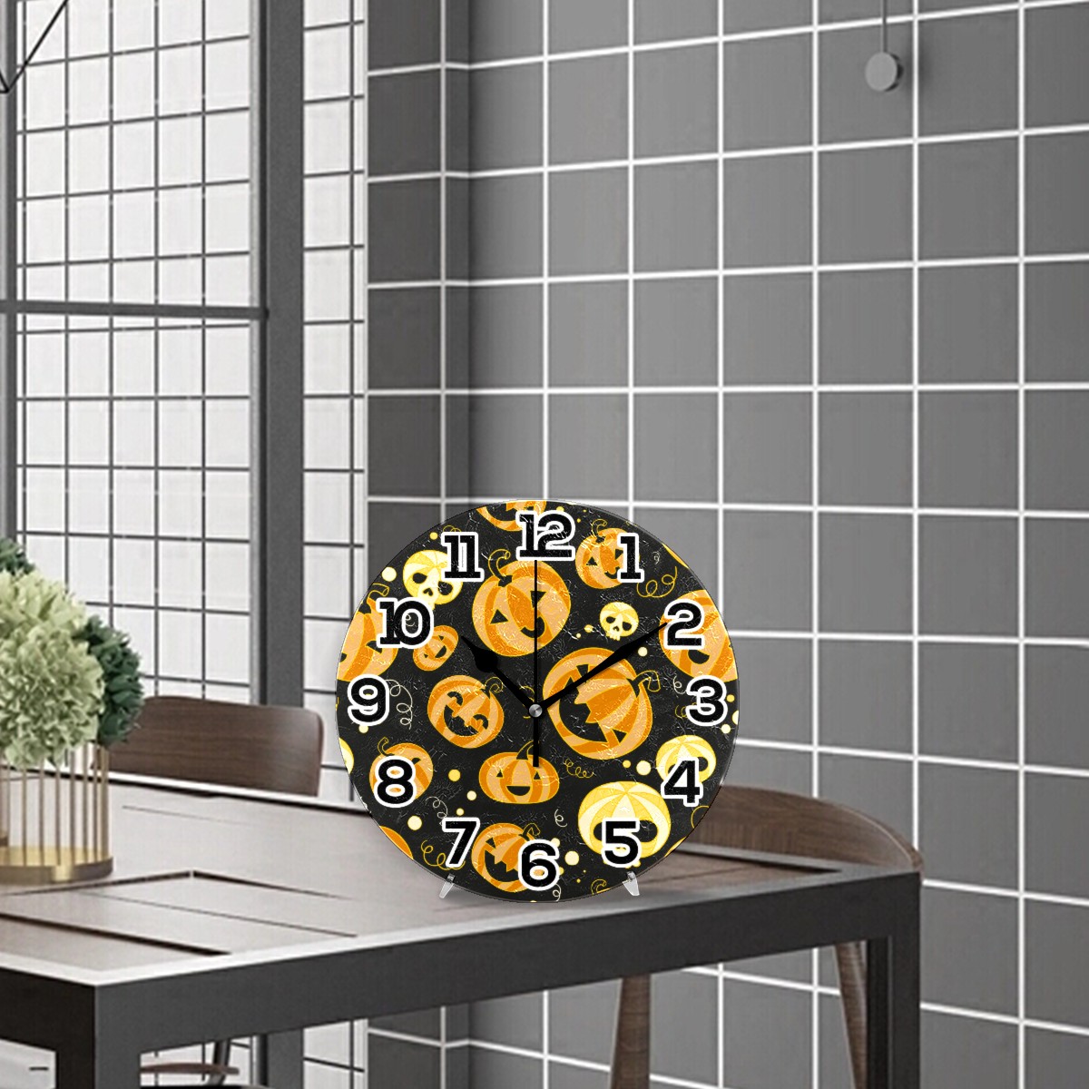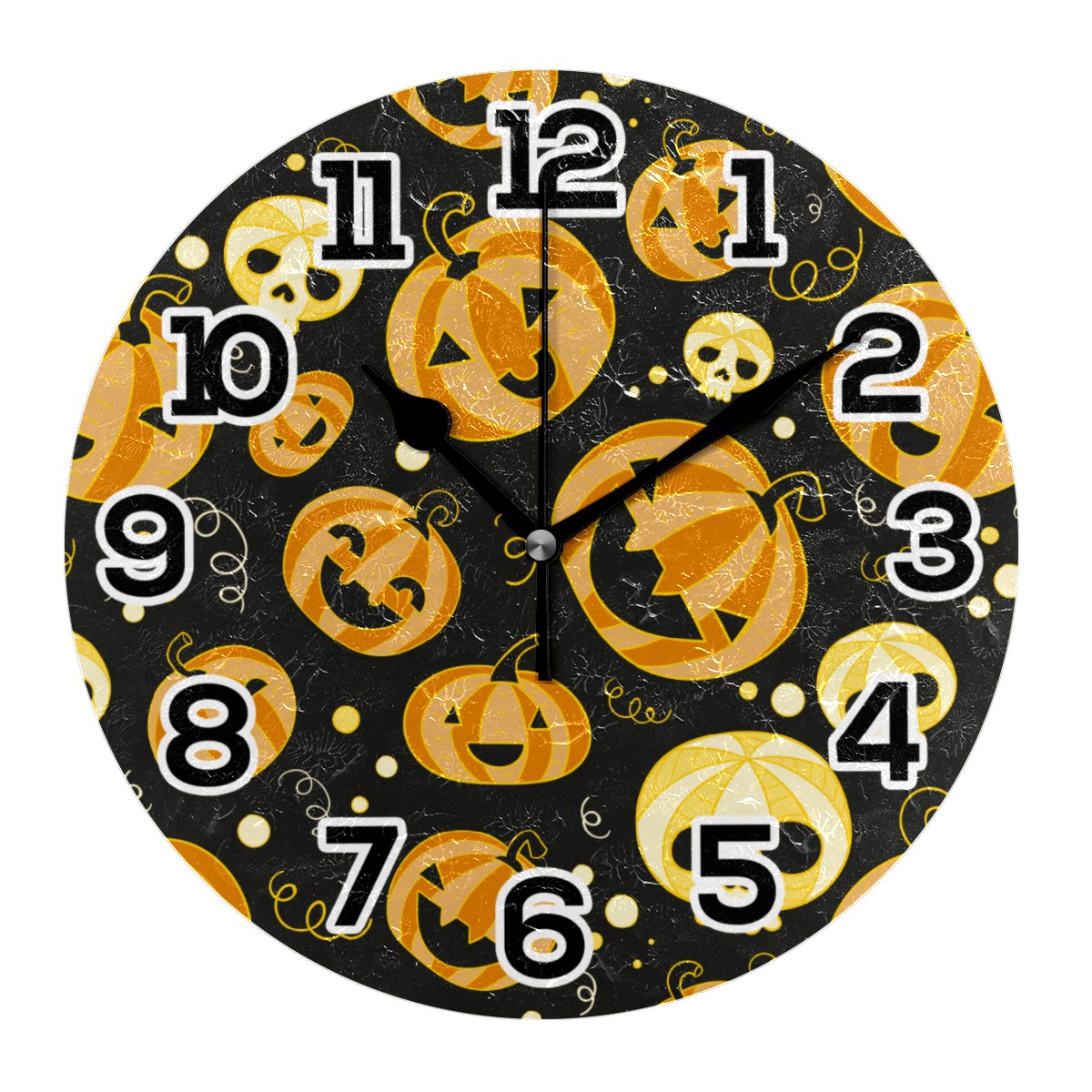 Halloween Funny Pumpkin Skull Pattern Clock Wall Decor Acrylic Decorative Round Battery Operated Wall Clocks for Home Bedroom Living Room Decor Silent Non Ticking