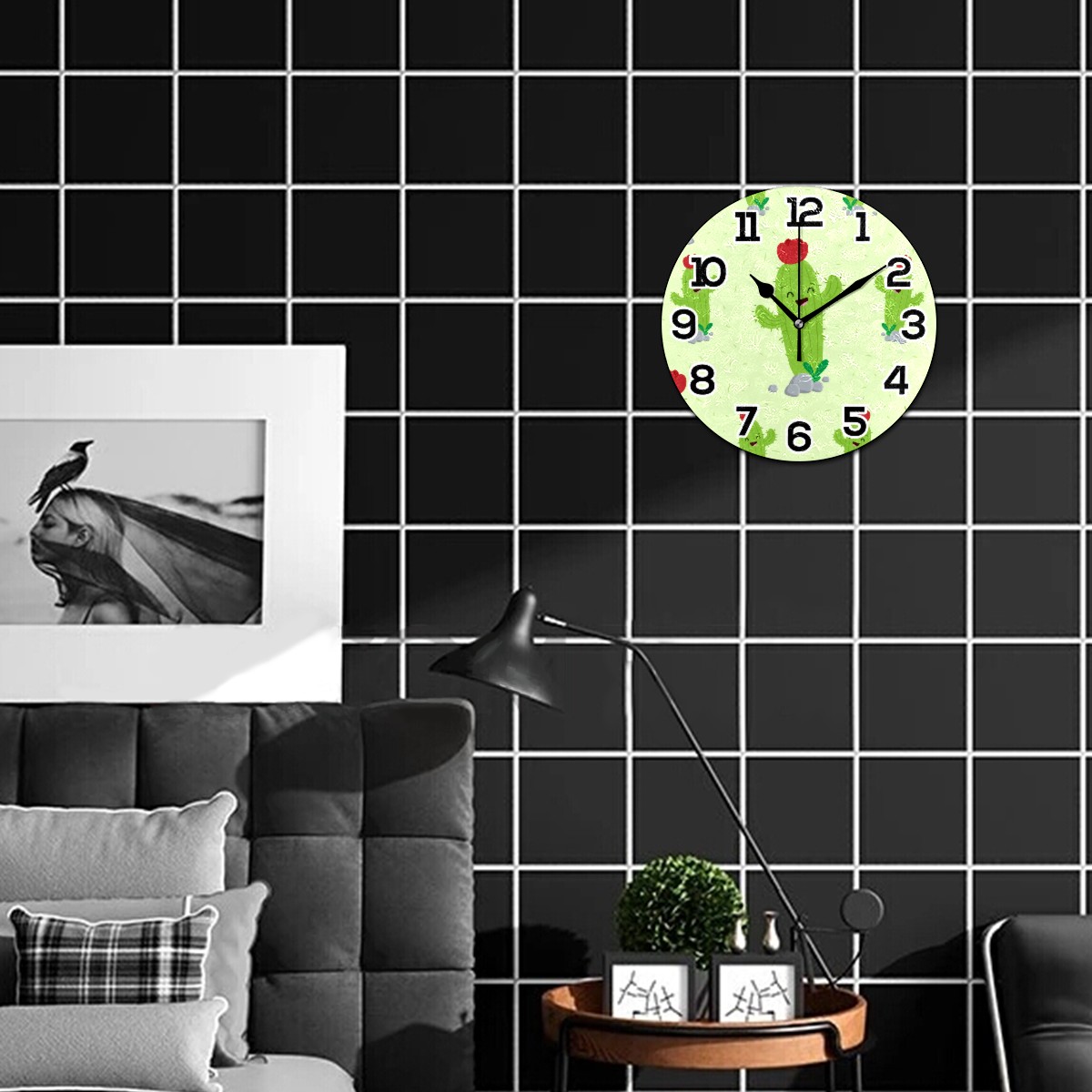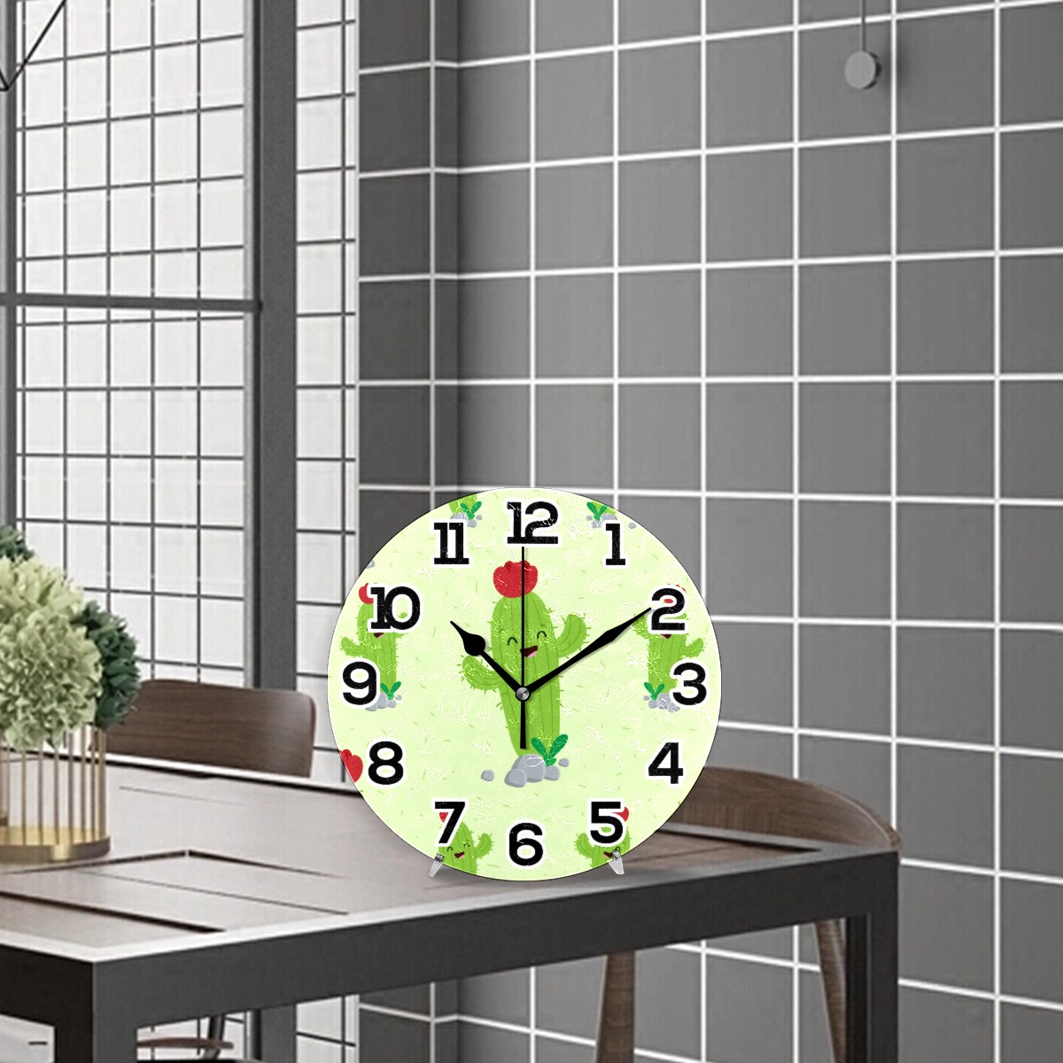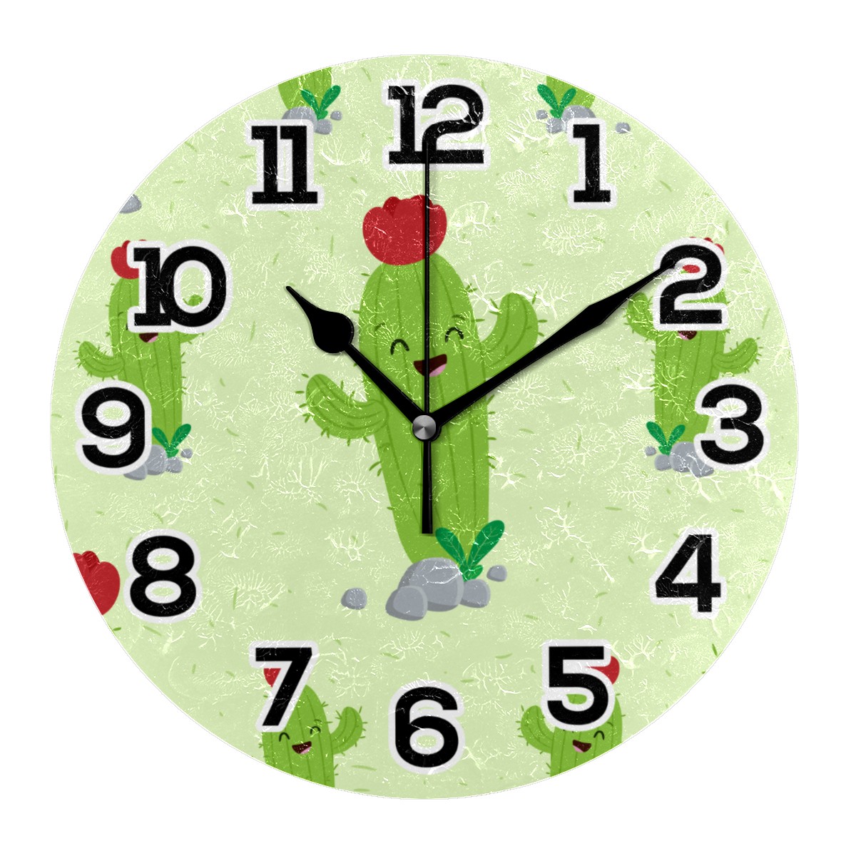 Cute Funny Cartoon Cactus Clock Wall Decor Acrylic Decorative Round Battery Operated Wall Clocks for Home Bedroom Living Room Decor Silent Non Ticking