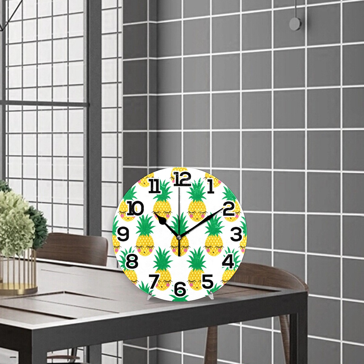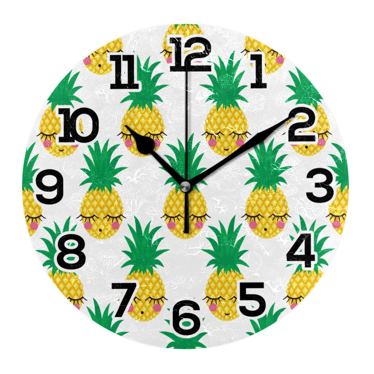 Cute Pineapple Pattern Clock Wall Decor Acrylic Decorative Round Battery Operated Wall Clocks for Home Bedroom Living Room Decor Silent Non Ticking