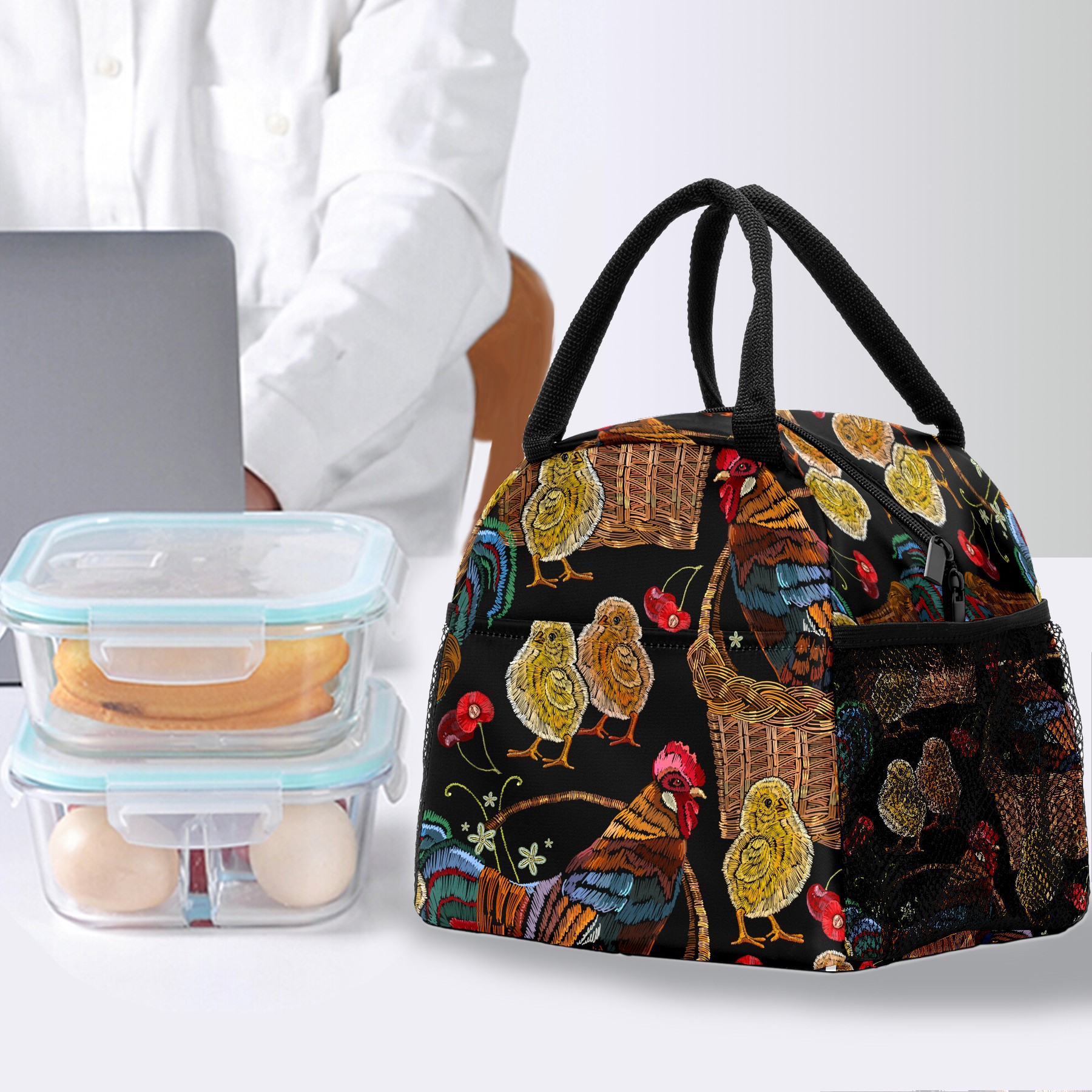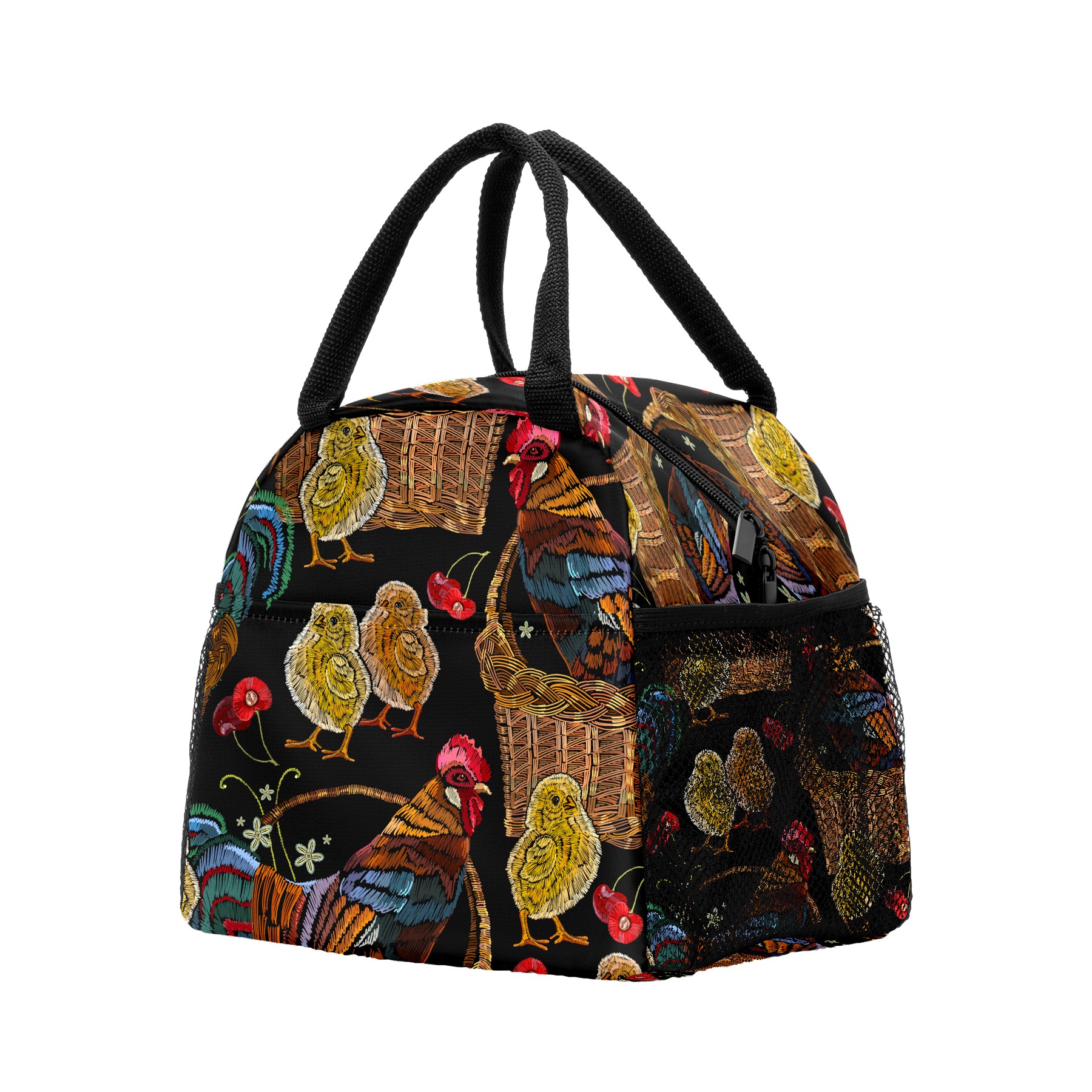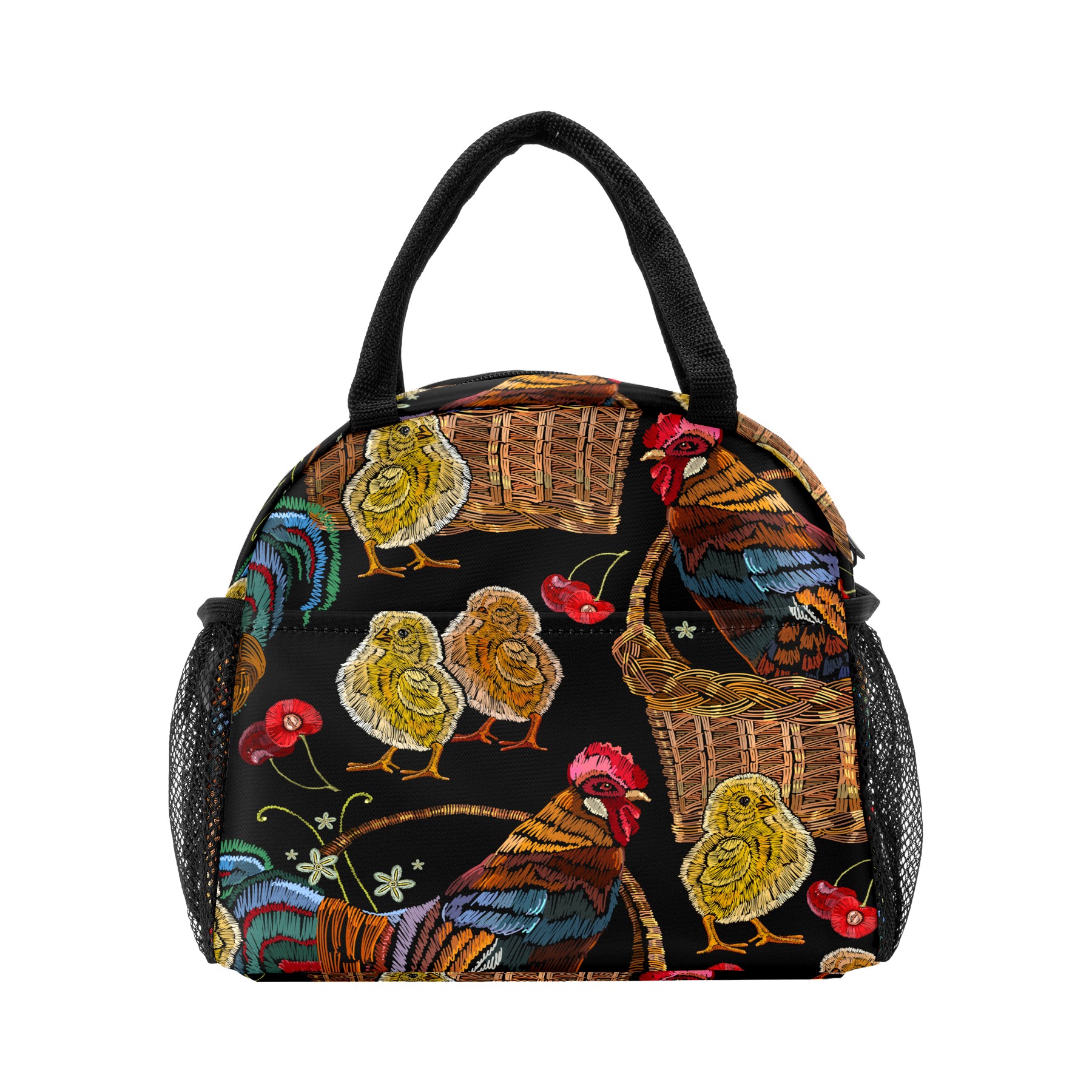 Lunch Bag for Women Men, Retro Colorful Rooster Chicken Floral Pattern Insulated Reusable Lunch Box Thermal Cooler Tote Bag for Work Picnic Hiking Travel Beach