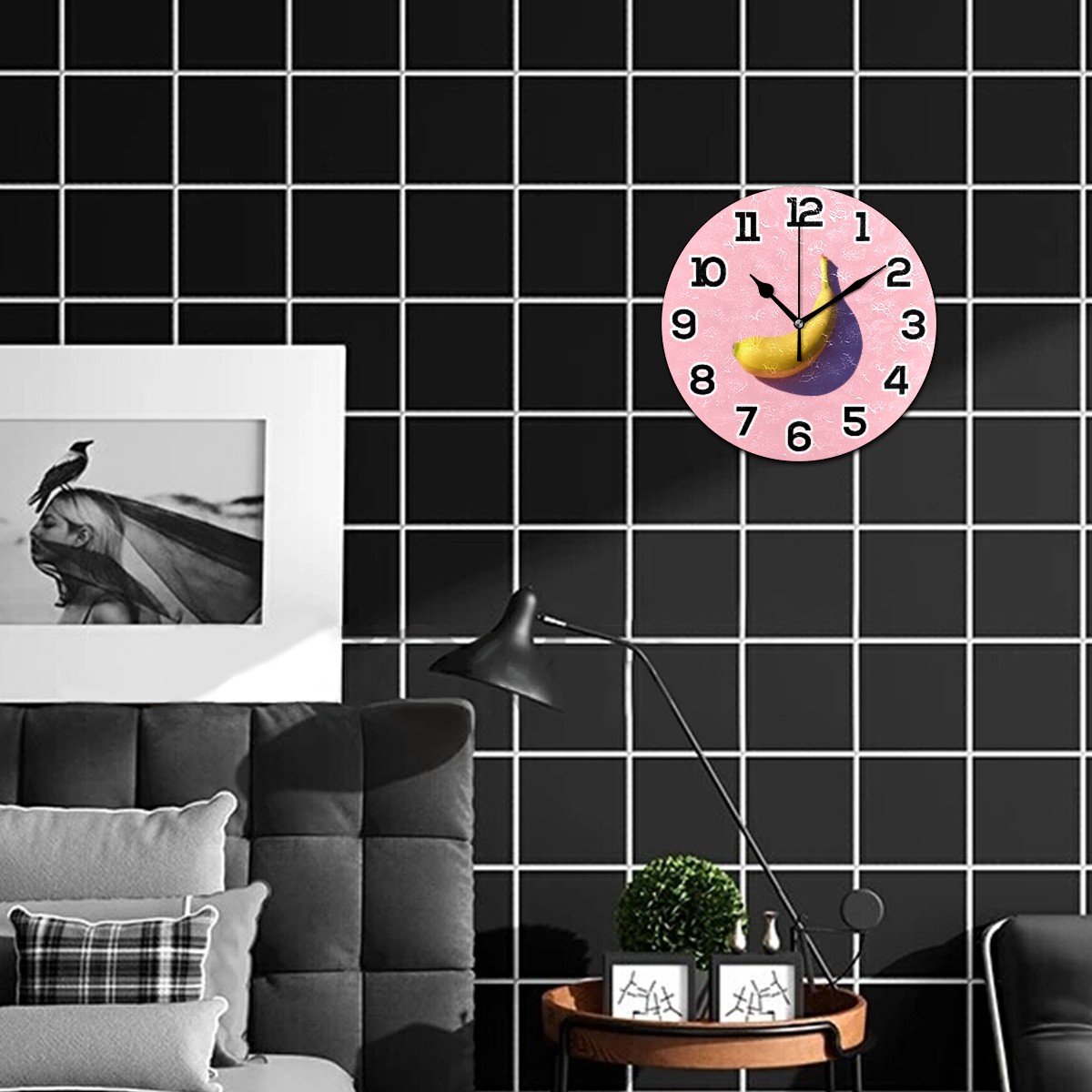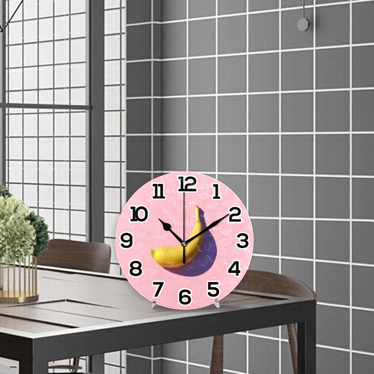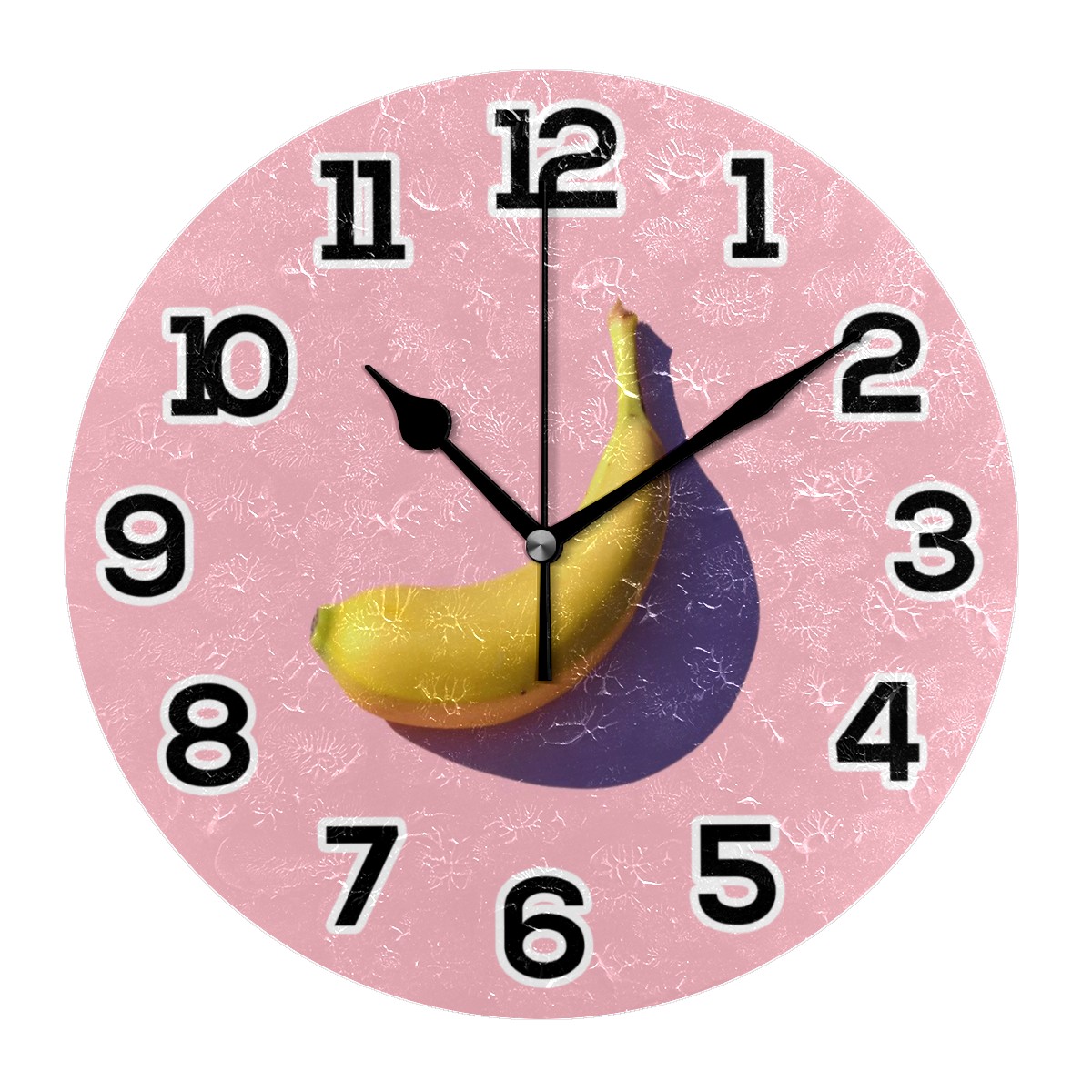 Funny Pink Fruit Banana Clock Wall Decor Acrylic Decorative Round Battery Operated Wall Clocks for Home Bedroom Living Room Decor Silent Non Ticking