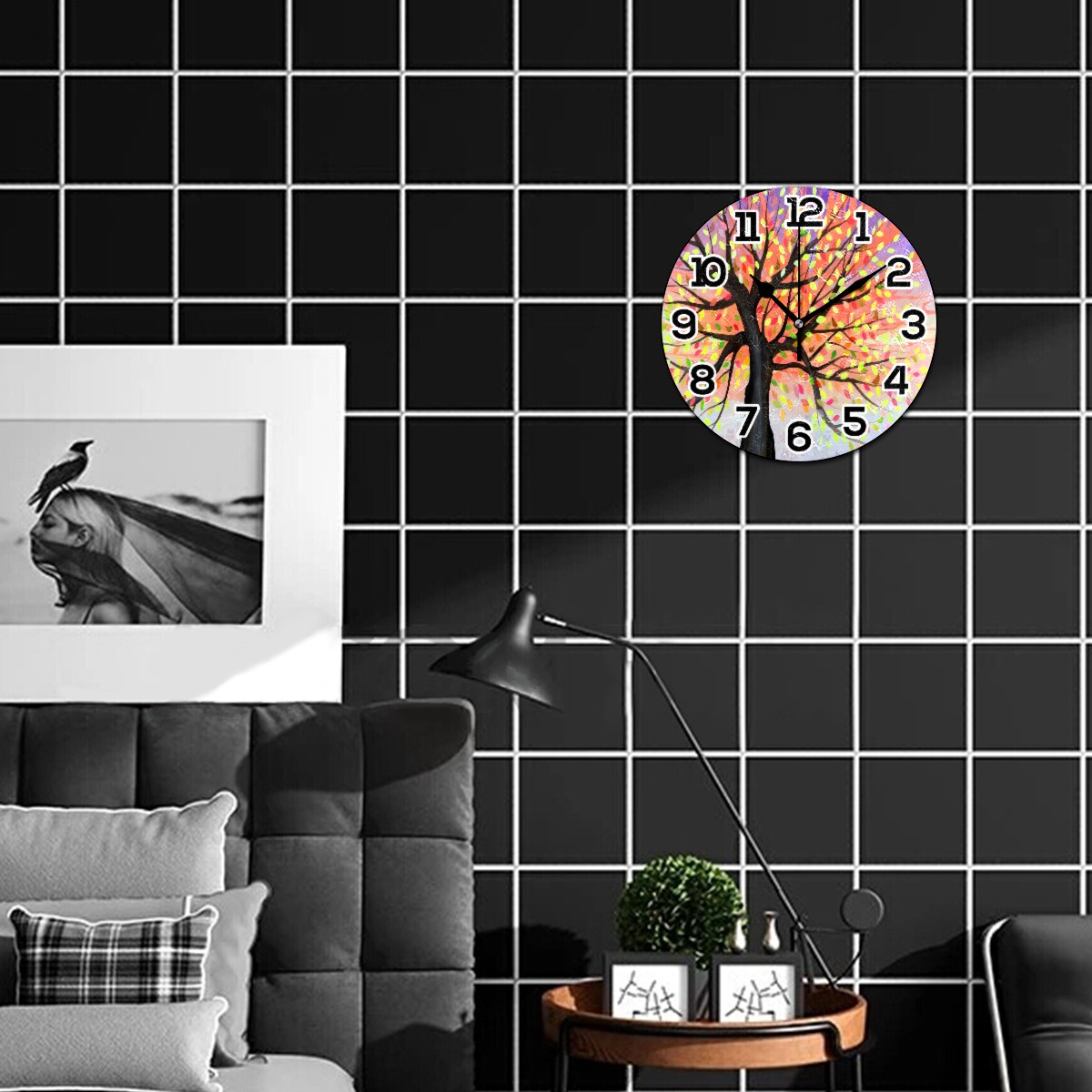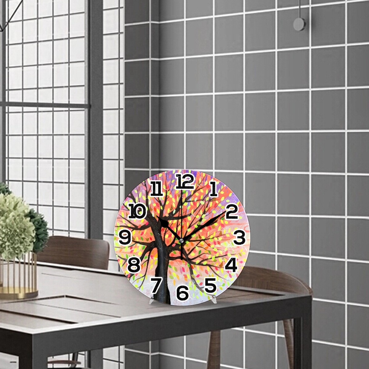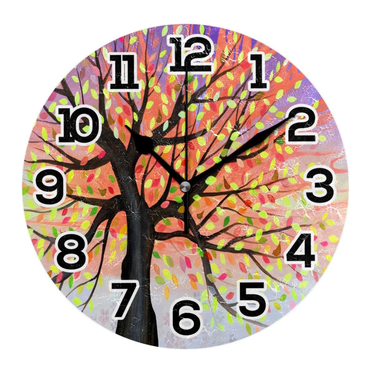 Colorful Tree Watercolor Clock Wall Decor Acrylic Decorative Round Battery Operated Wall Clocks for Home Bedroom Living Room Decor Silent Non Ticking