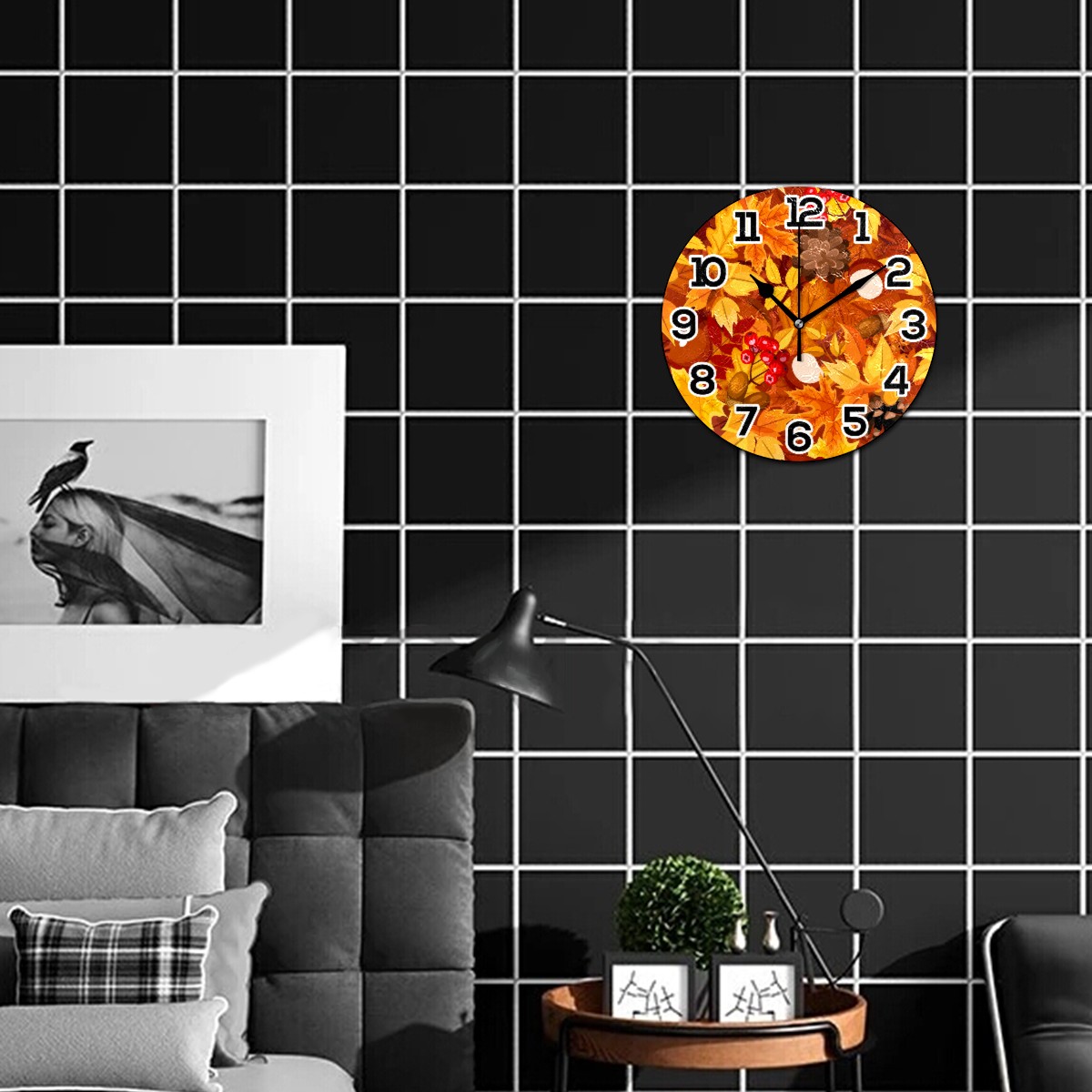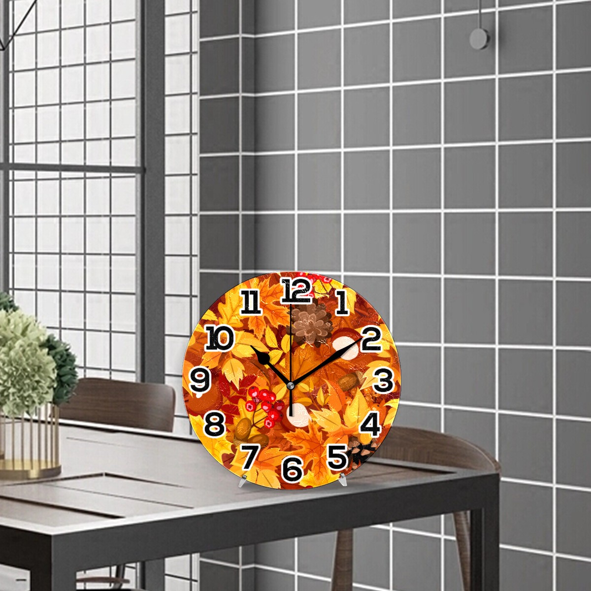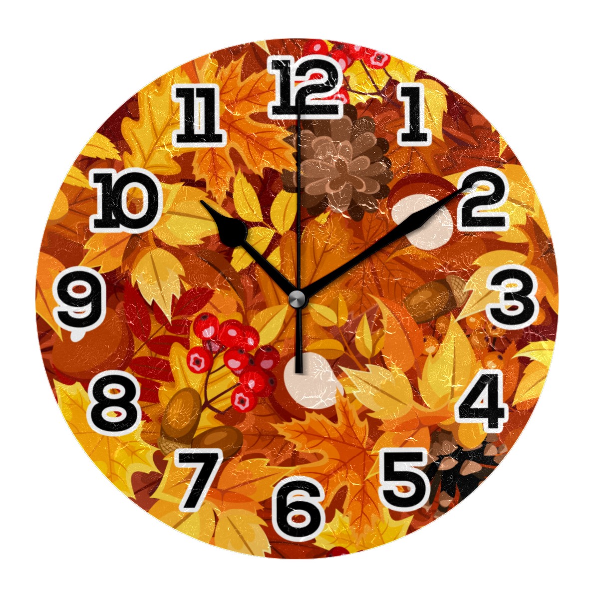 Autumn Maple Leaf Pattern Clock Wall Decor Acrylic Decorative Round Battery Operated Wall Clocks for Home Bedroom Living Room Decor Silent Non Ticking