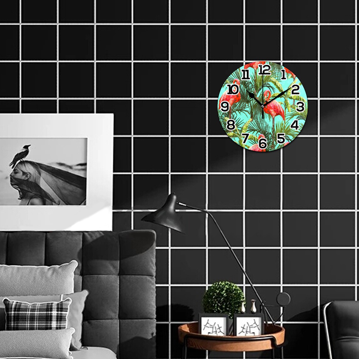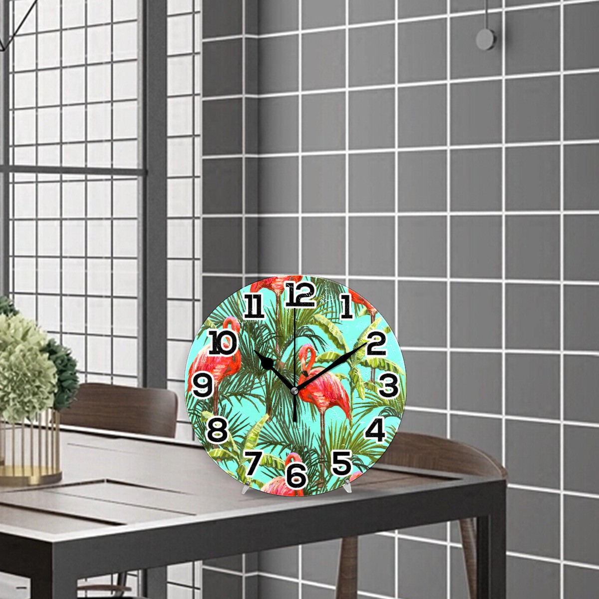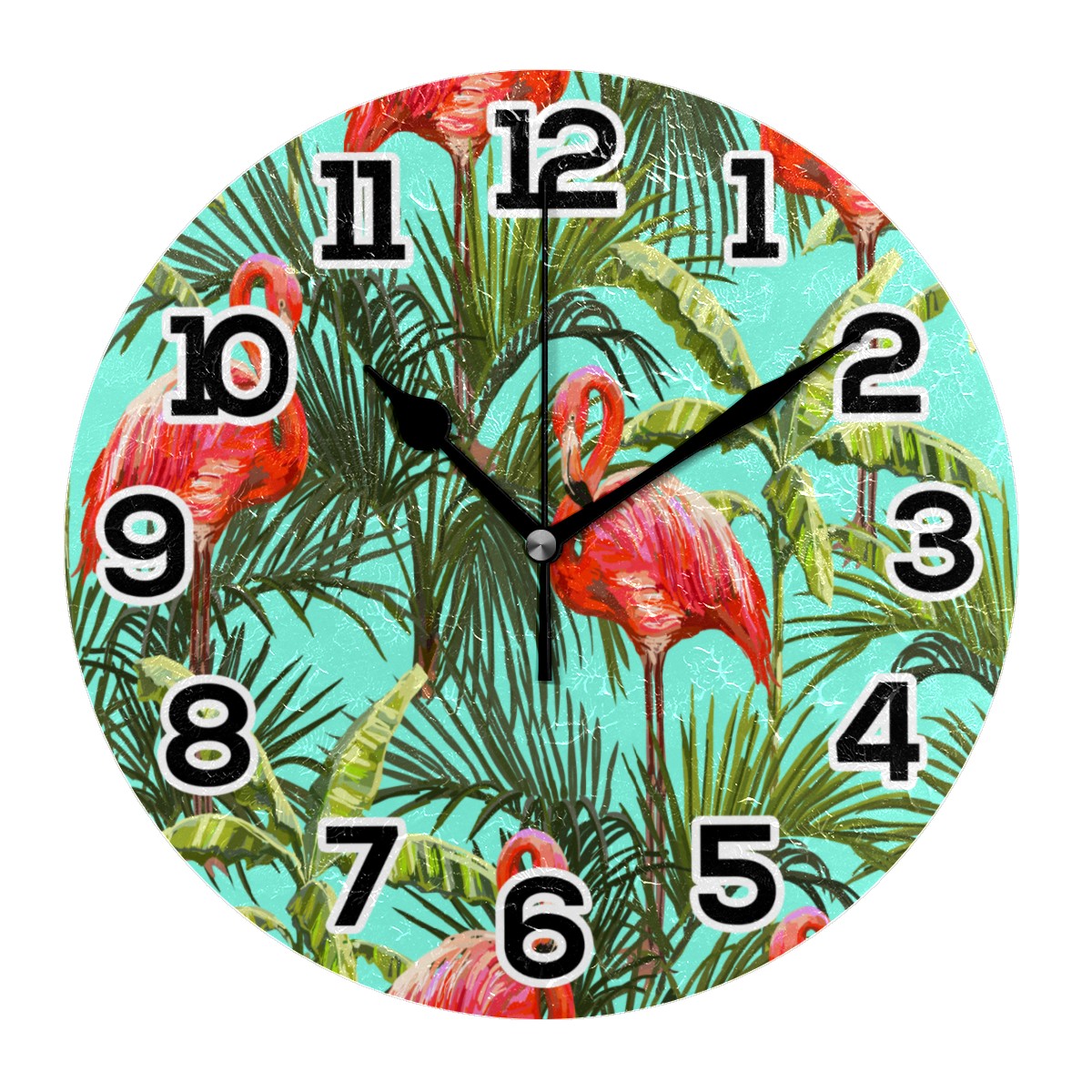 Tropiacal Flamingo Green Leaves Clock Wall Decor Acrylic Decorative Round Battery Operated Wall Clocks for Home Bedroom Living Room Decor Silent Non Ticking