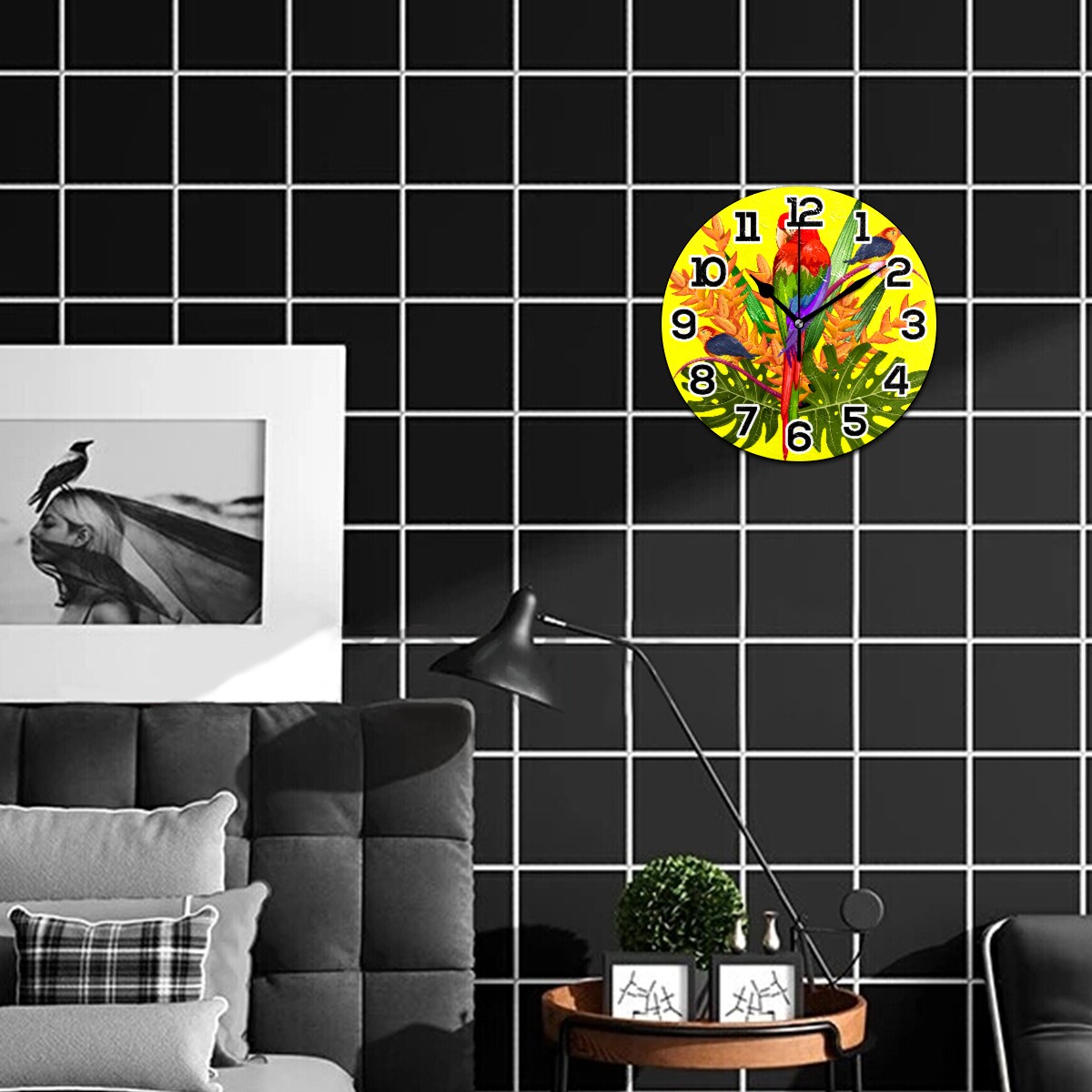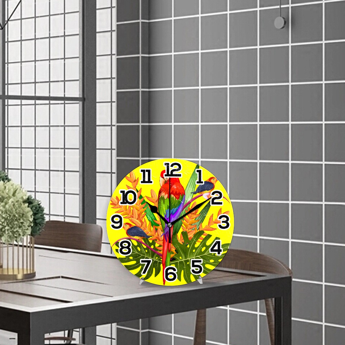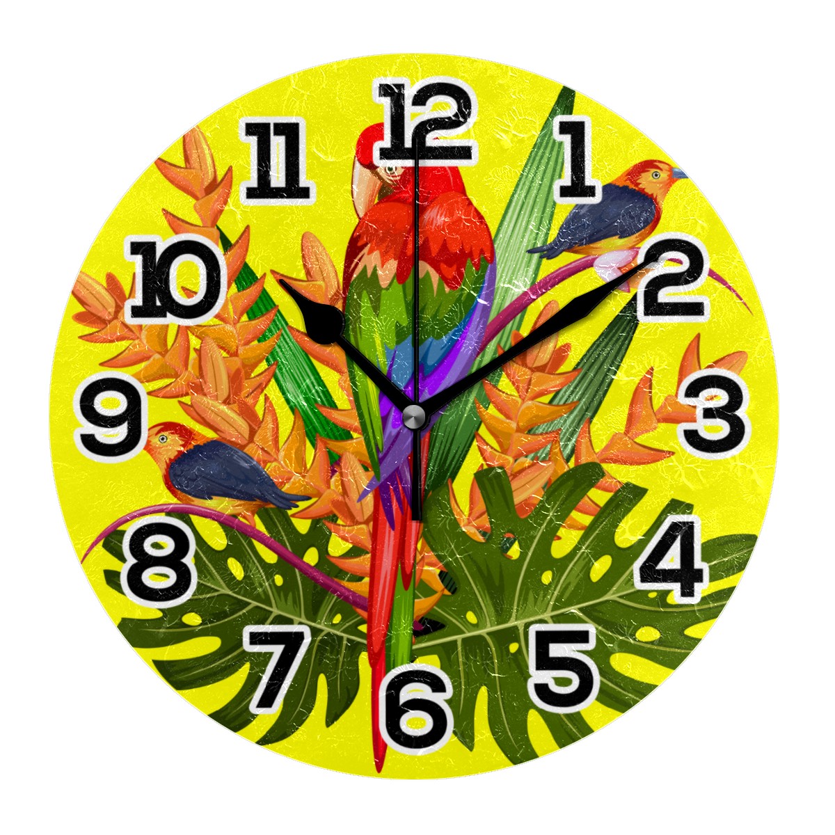 Tropical Parrot Bird With Plam Clock Wall Decor Acrylic Decorative Round Battery Operated Wall Clocks for Home Bedroom Living Room Decor Silent Non Ticking
