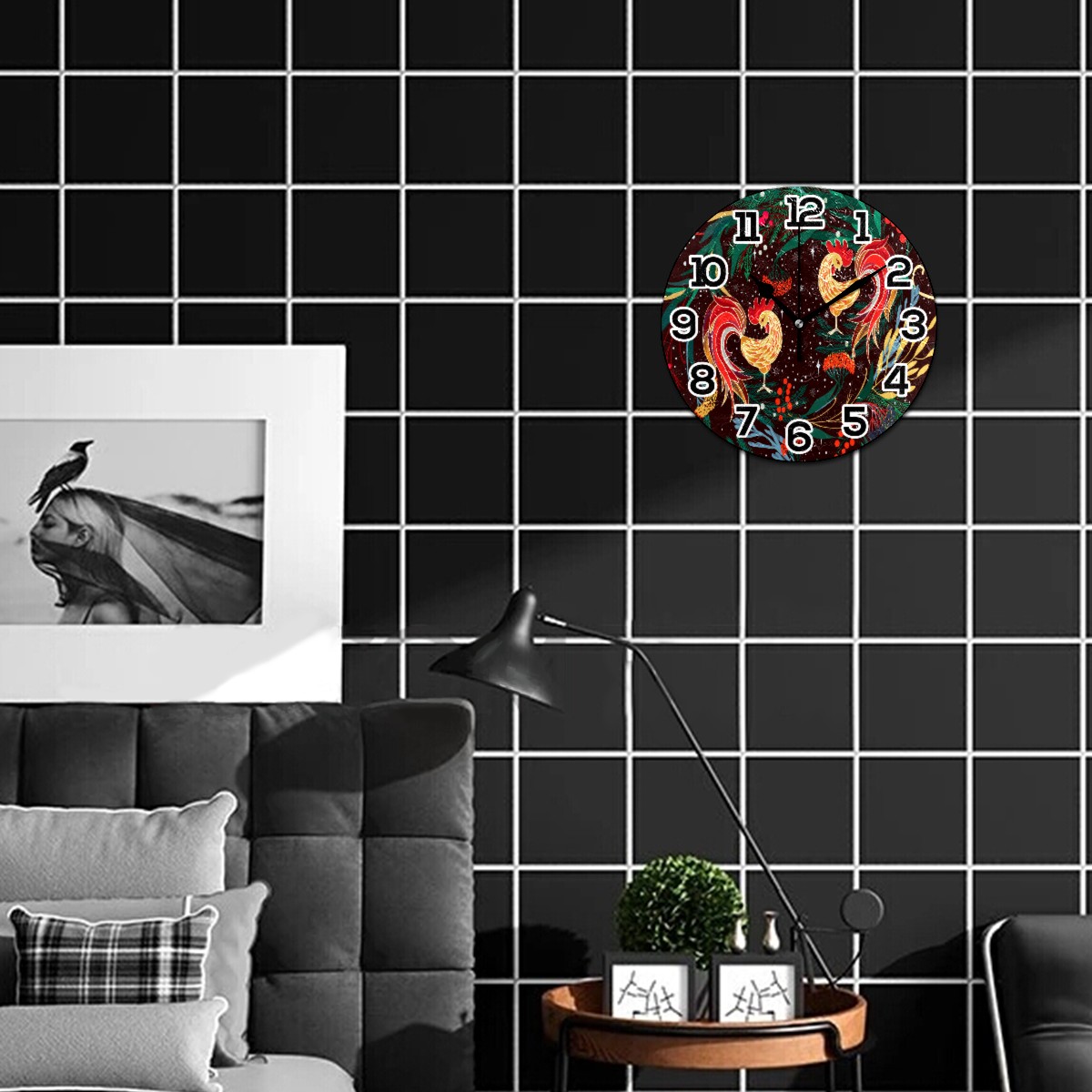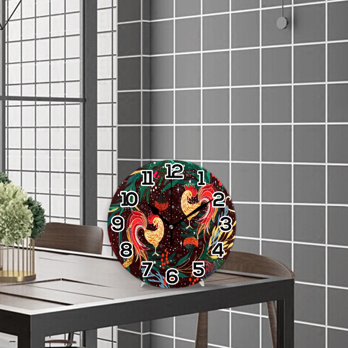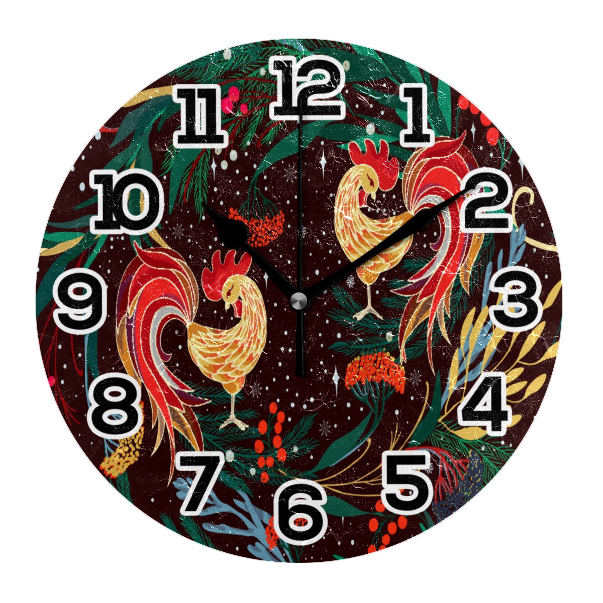 Valentine's Day Lover Rooster Chicken Clock Wall Decor Acrylic Decorative Round Battery Operated Wall Clocks for Home Bedroom Living Room Decor Silent Non Ticking