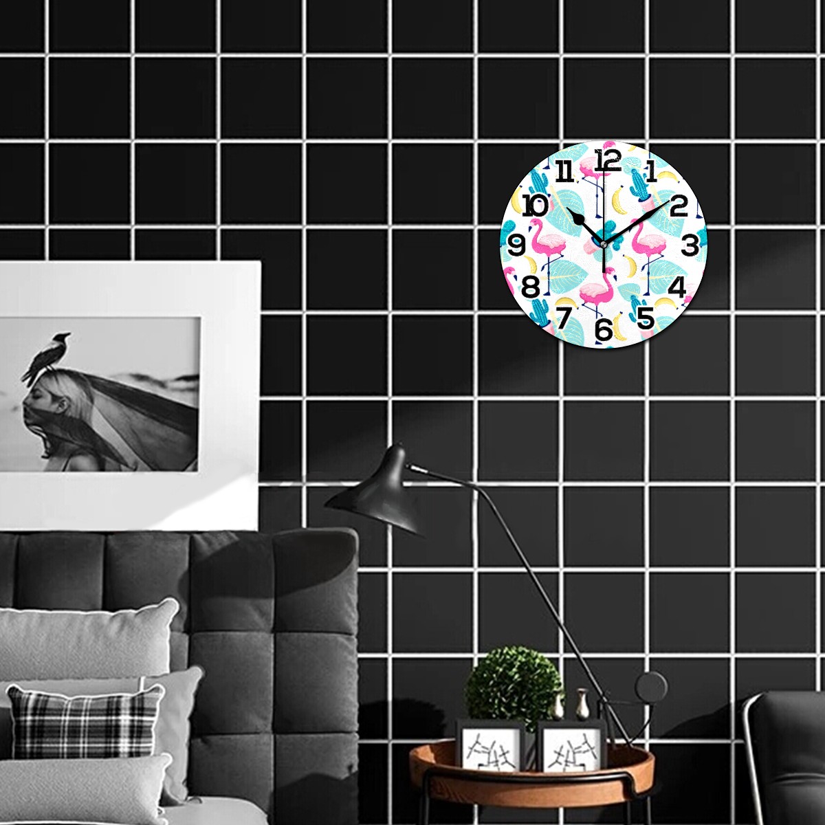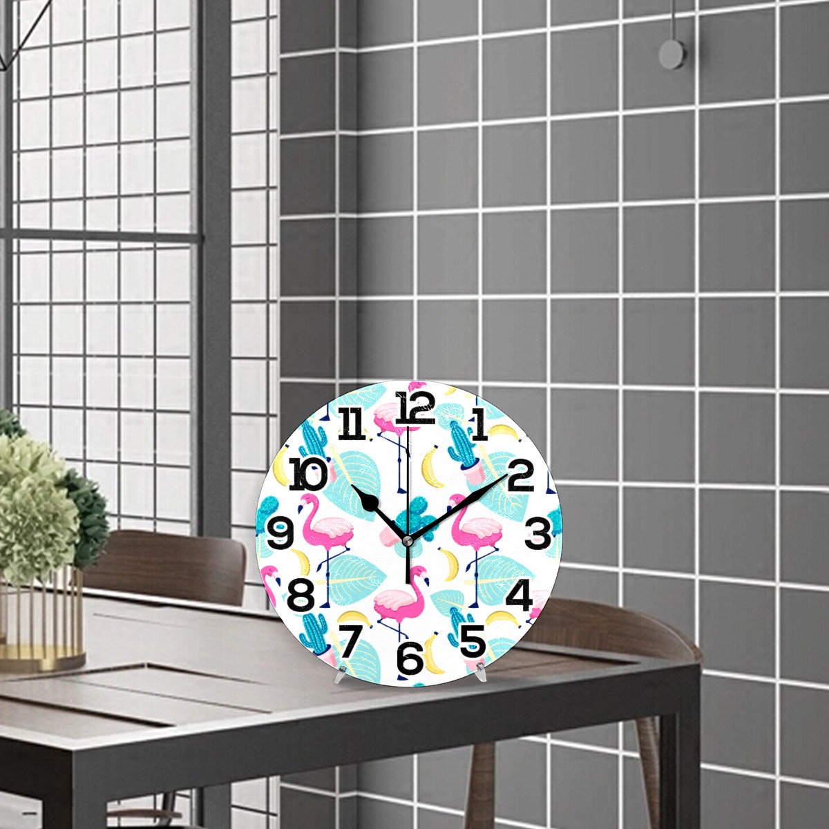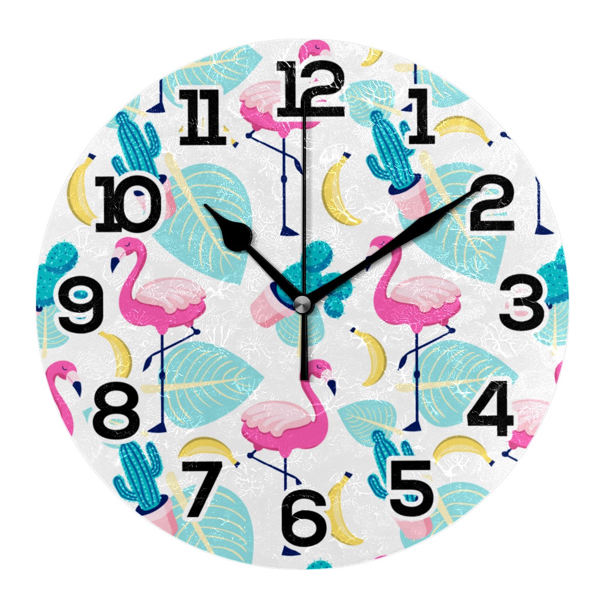 Tropical Flamingo Palm Cactus Banana Clock Wall Decor Acrylic Decorative Round Battery Operated Wall Clocks for Home Bedroom Living Room Decor Silent Non Ticking