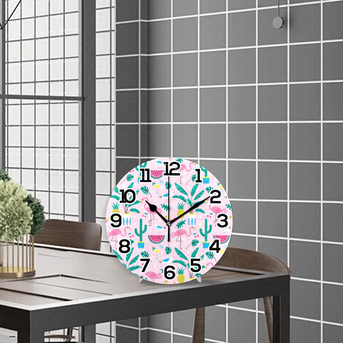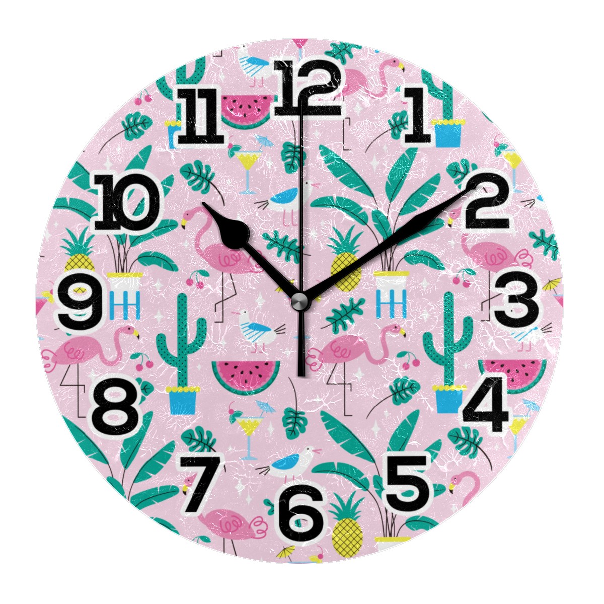 Summer Pink Flamingo Pineapple Watermelon Pattern Clock Wall Decor Acrylic Decorative Round Battery Operated Wall Clocks for Home Bedroom Living Room Decor Silent Non Ticking