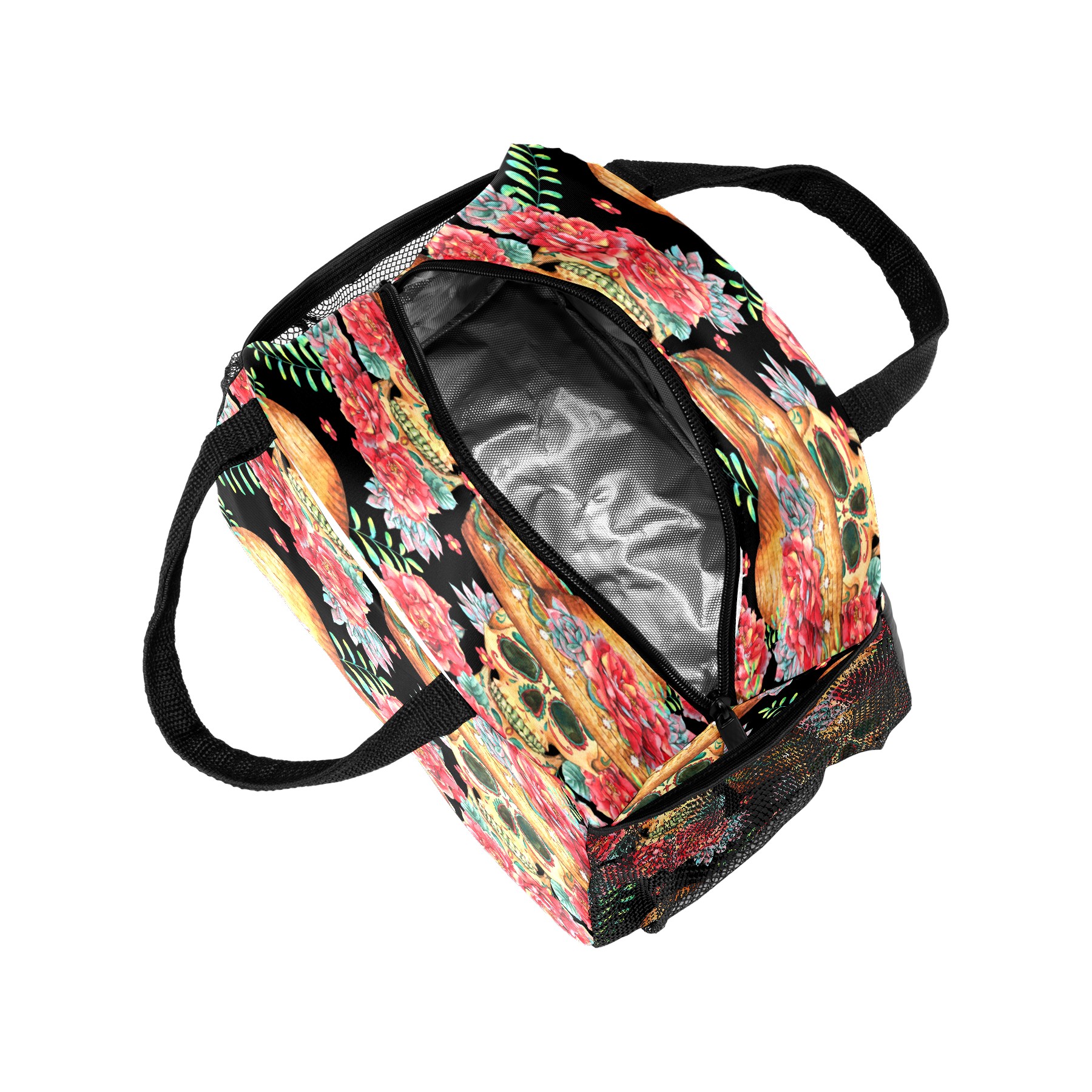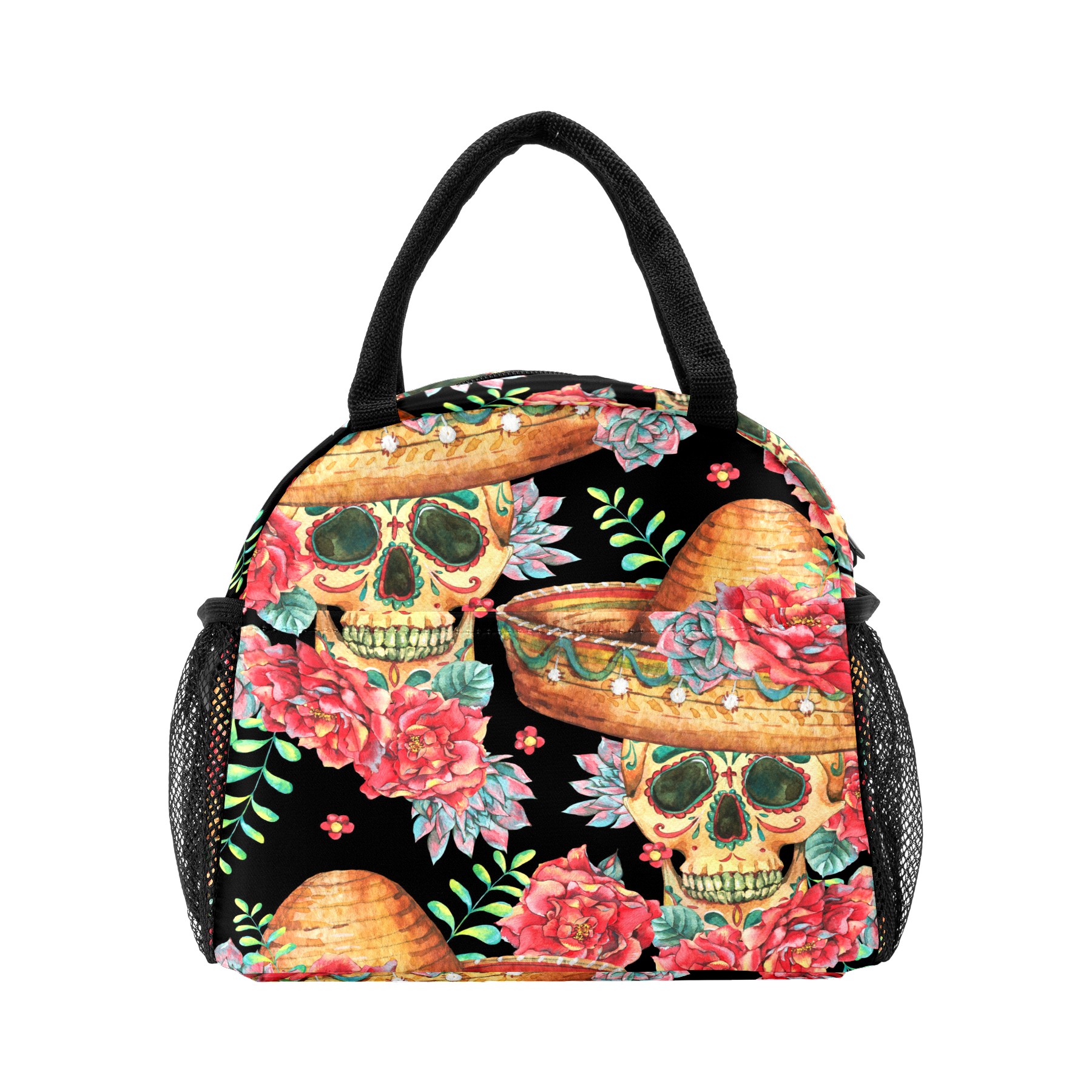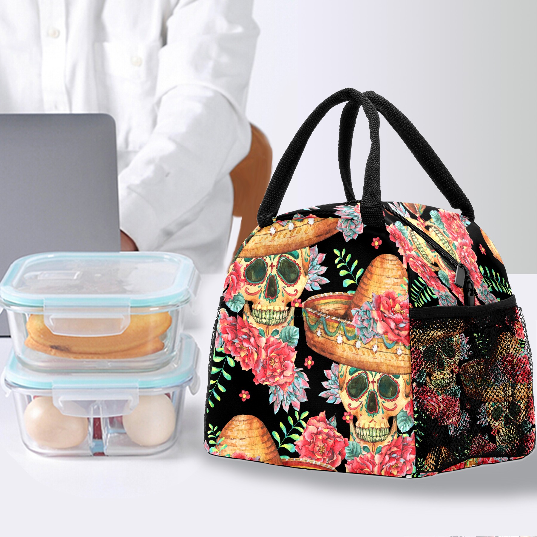 Lunch Bag for Women Men, Mexico Sugar Skull Rose Pattern Insulated Reusable Lunch Box Thermal Cooler Tote Bag for Work Picnic Hiking Travel Beach