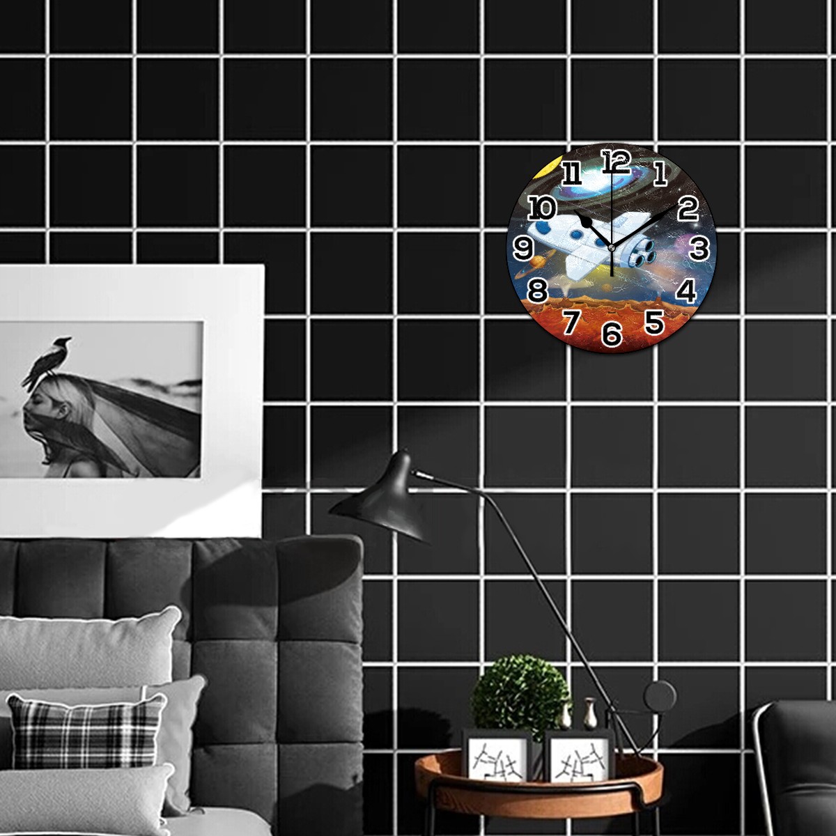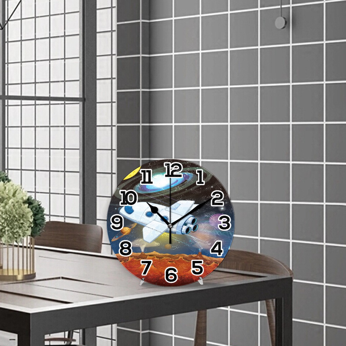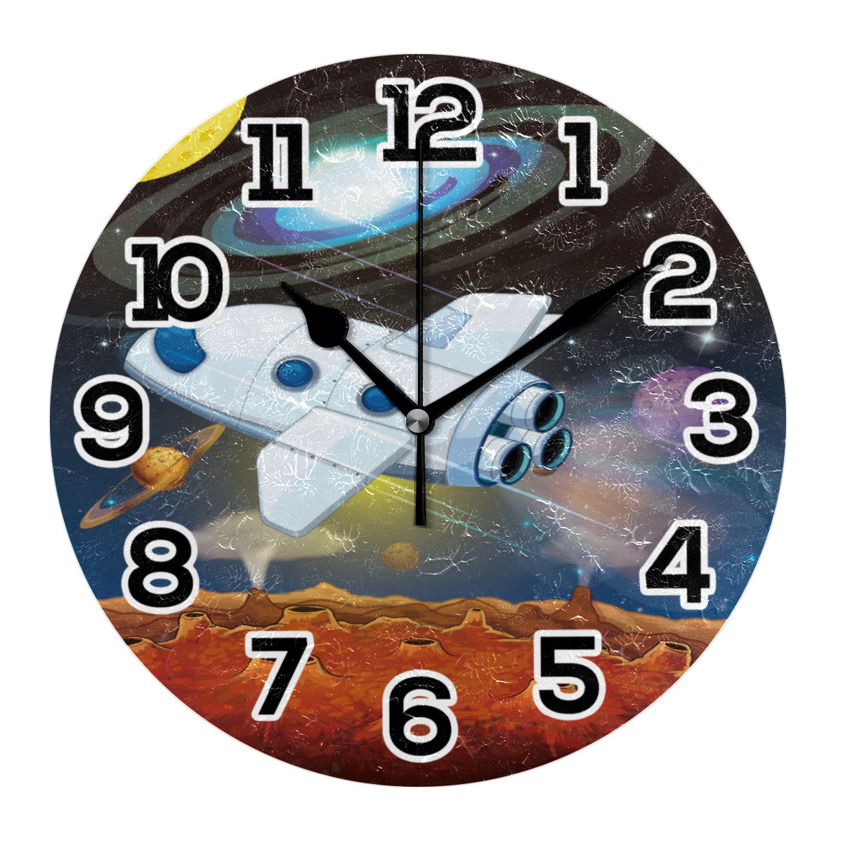 Space Stars Planets With Spaceship Clock Wall Decor Acrylic Decorative Round Battery Operated Wall Clocks for Home Bedroom Living Room Decor Silent Non Ticking