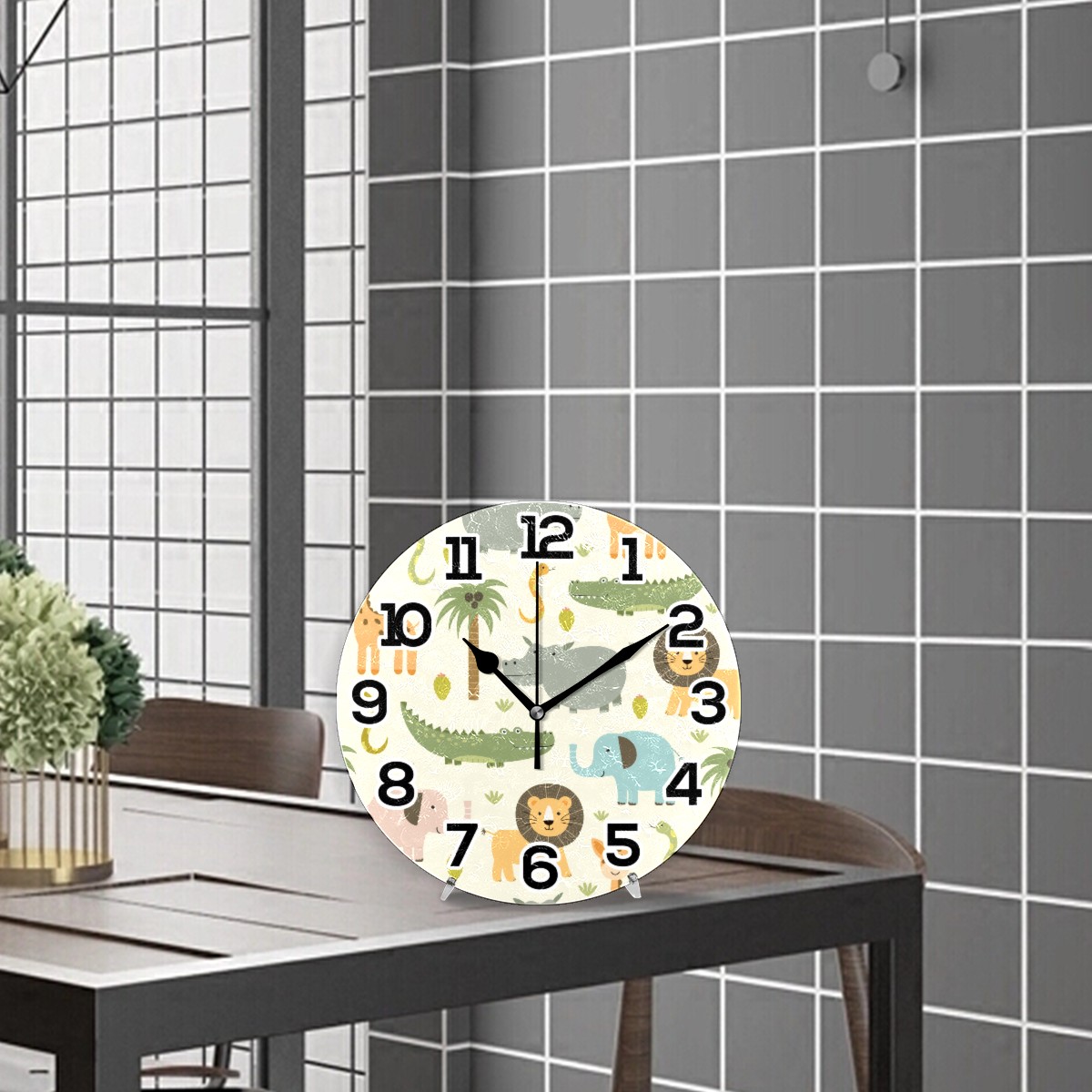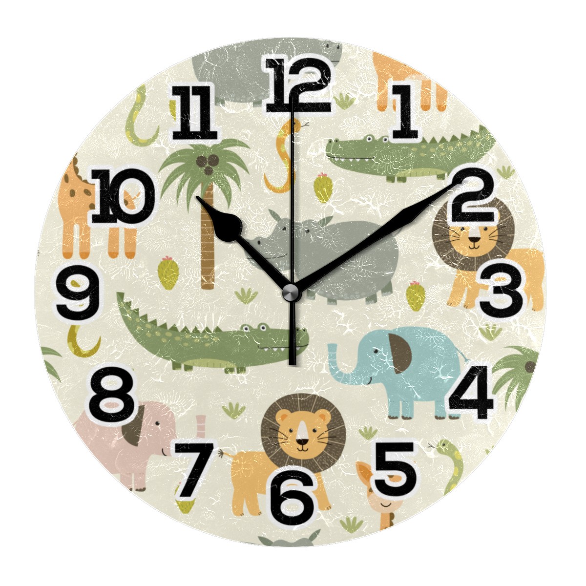 Retro Cartoon Crocodile Lion Elephant Dear Clock Wall Decor Acrylic Decorative Round Battery Operated Wall Clocks for Home Bedroom Living Room Decor Silent Non Ticking