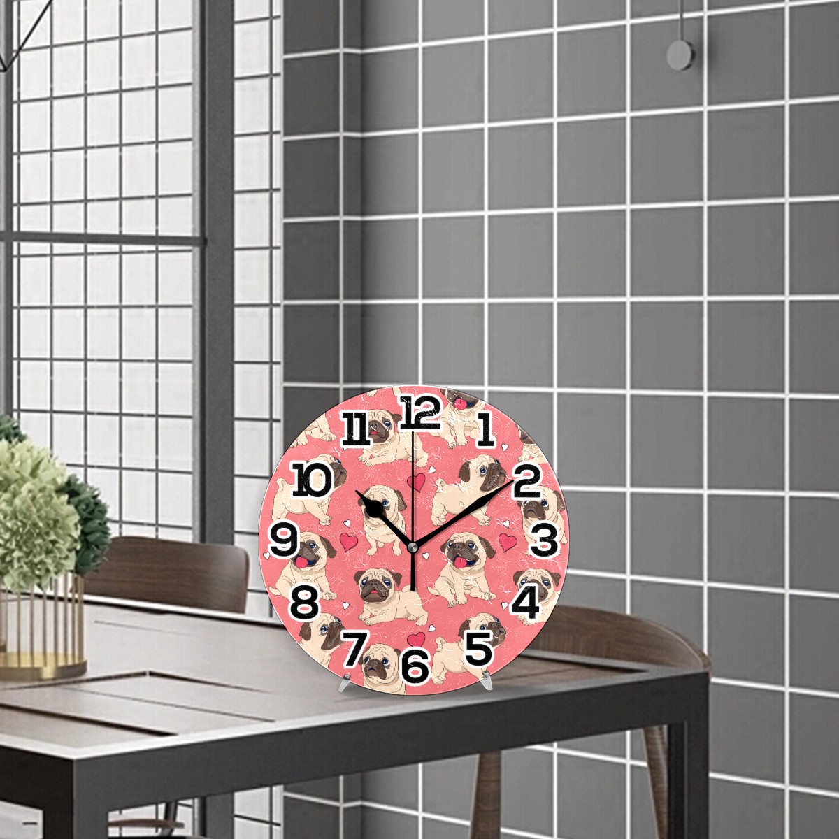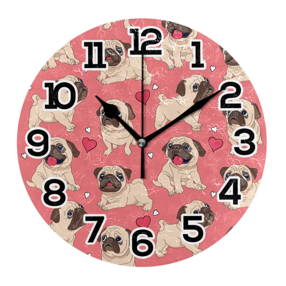 Pink Pug Puppy Dog Heart Love Pattern Clock Wall Decor Acrylic Decorative Round Battery Operated Wall Clocks for Home Bedroom Living Room Decor Silent Non Ticking