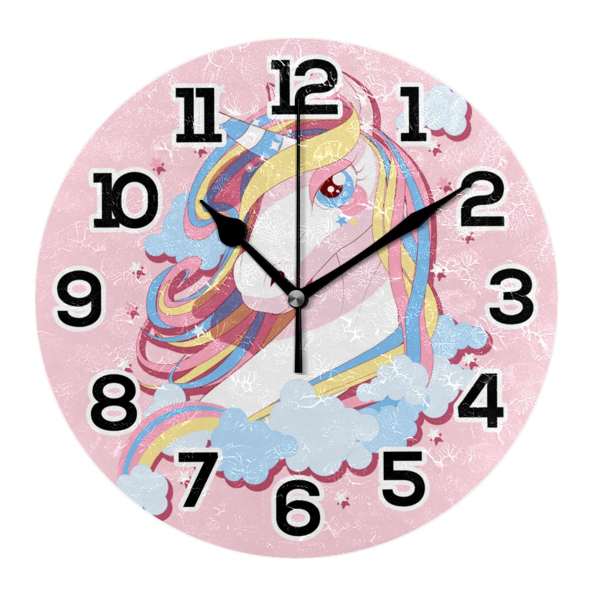 Pink Magical Unicorn Horse Clouds Stars Clock Wall Decor Acrylic Decorative Round Battery Operated Wall Clocks for Home Bedroom Living Room Decor Silent Non Ticking