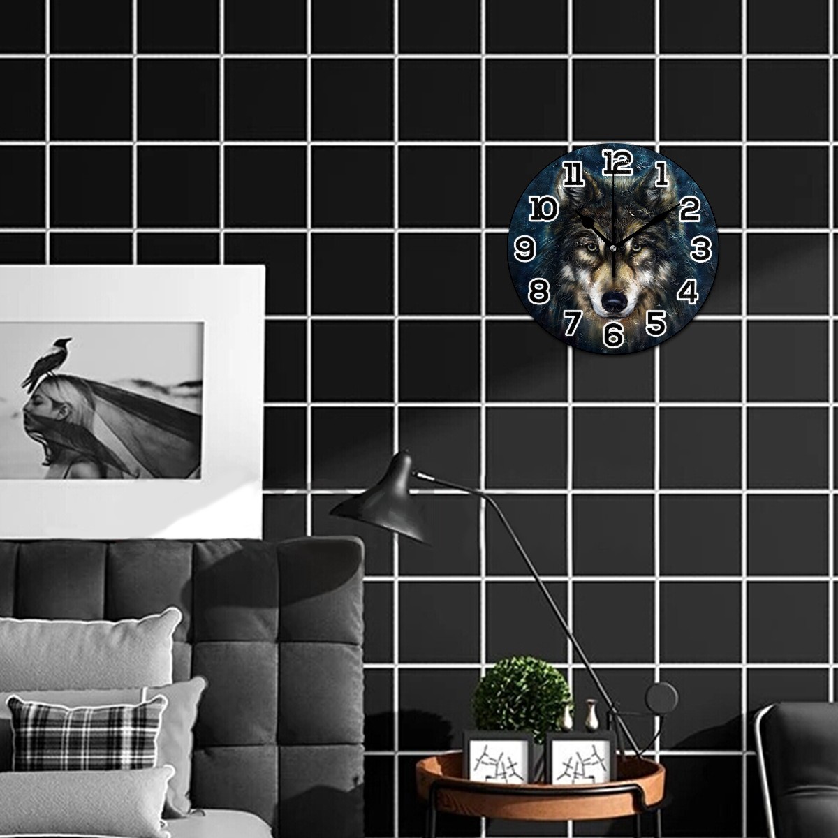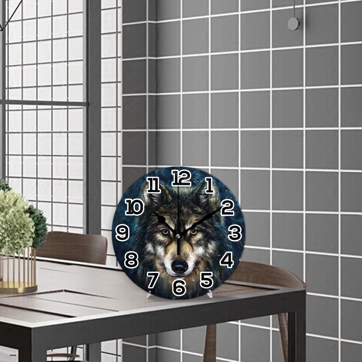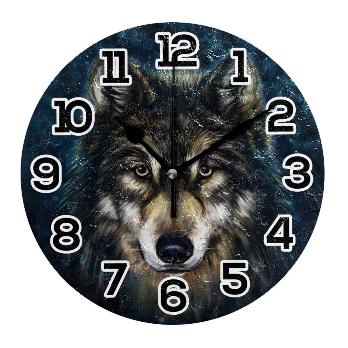 Oil Painting Wolf Hipster Clock Wall Decor Acrylic Decorative Round Battery Operated Wall Clocks for Home Bedroom Living Room Decor Silent Non Ticking