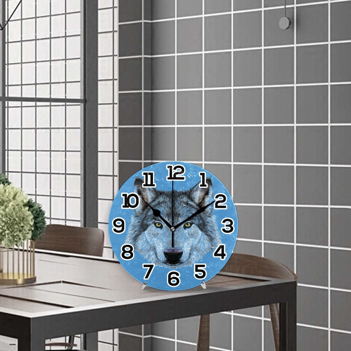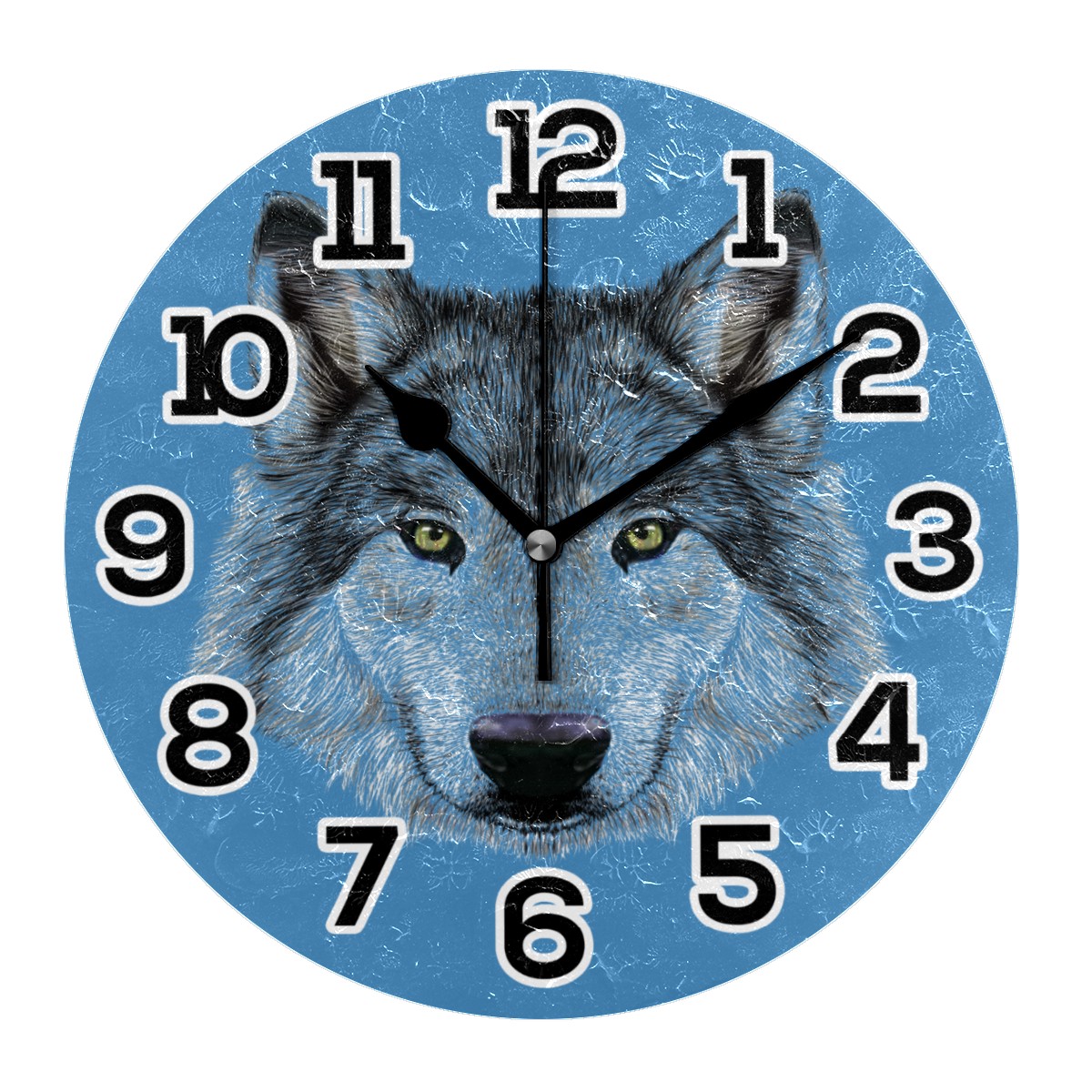 Gray Wolf Clock Wall Decor Acrylic Decorative Round Battery Operated Wall Clocks for Home Bedroom Living Room Decor Silent Non Ticking