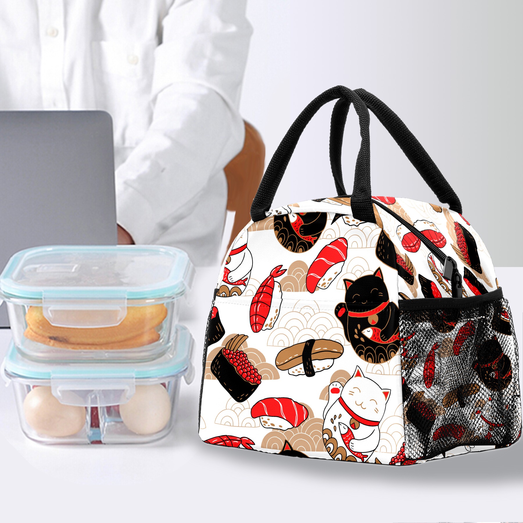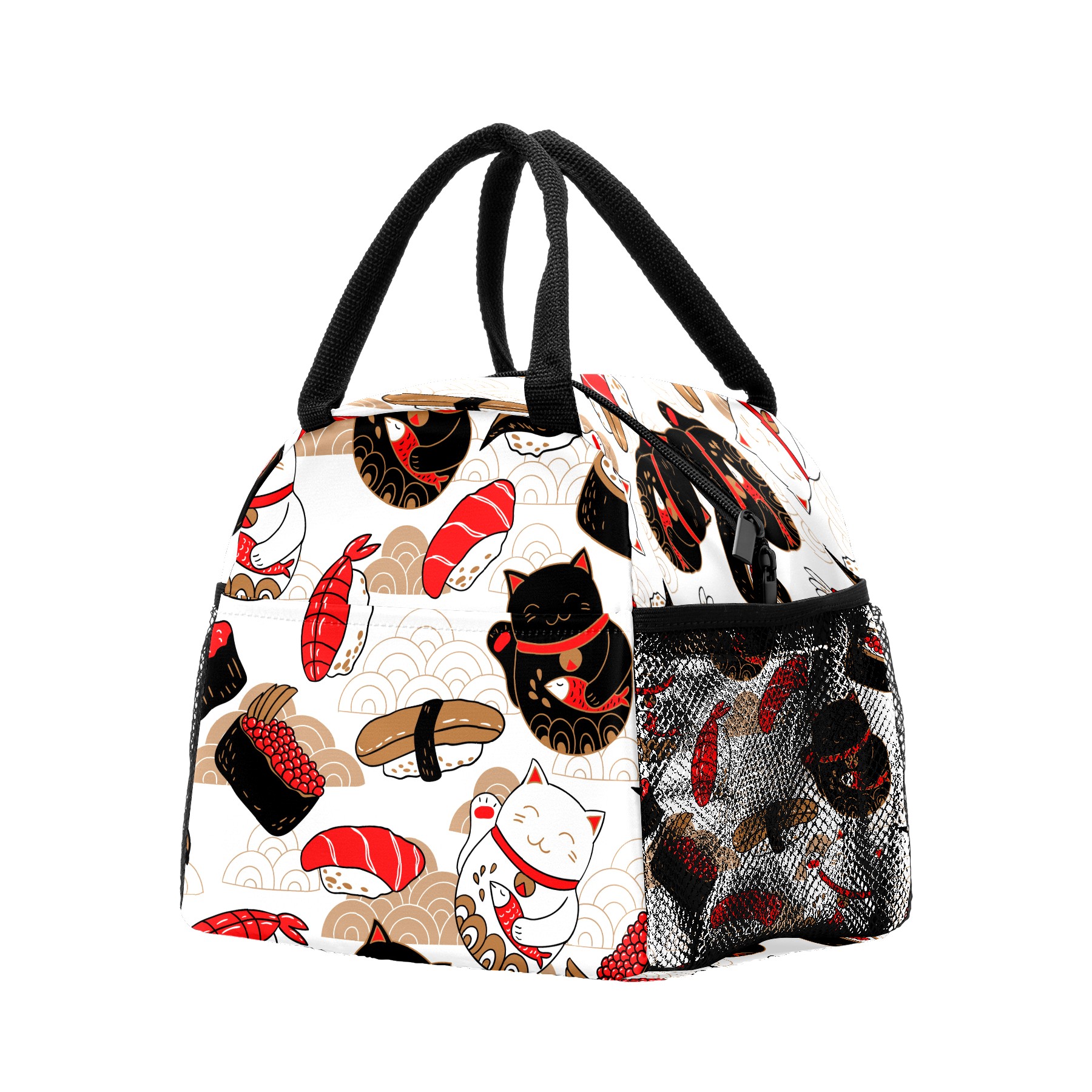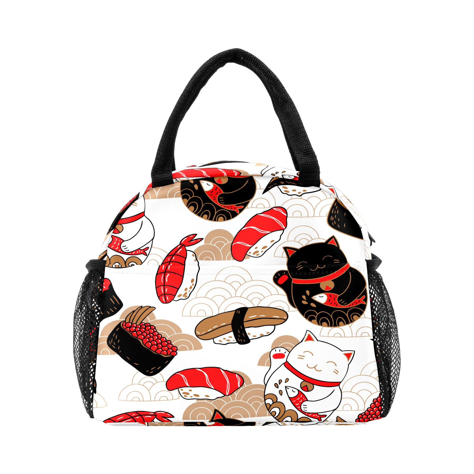 Lunch Bag for Women Men, Japanese Sushi Lucky Cat Pattern Insulated Reusable Lunch Box Thermal Cooler Tote Bag for Work Picnic Hiking Travel Beach