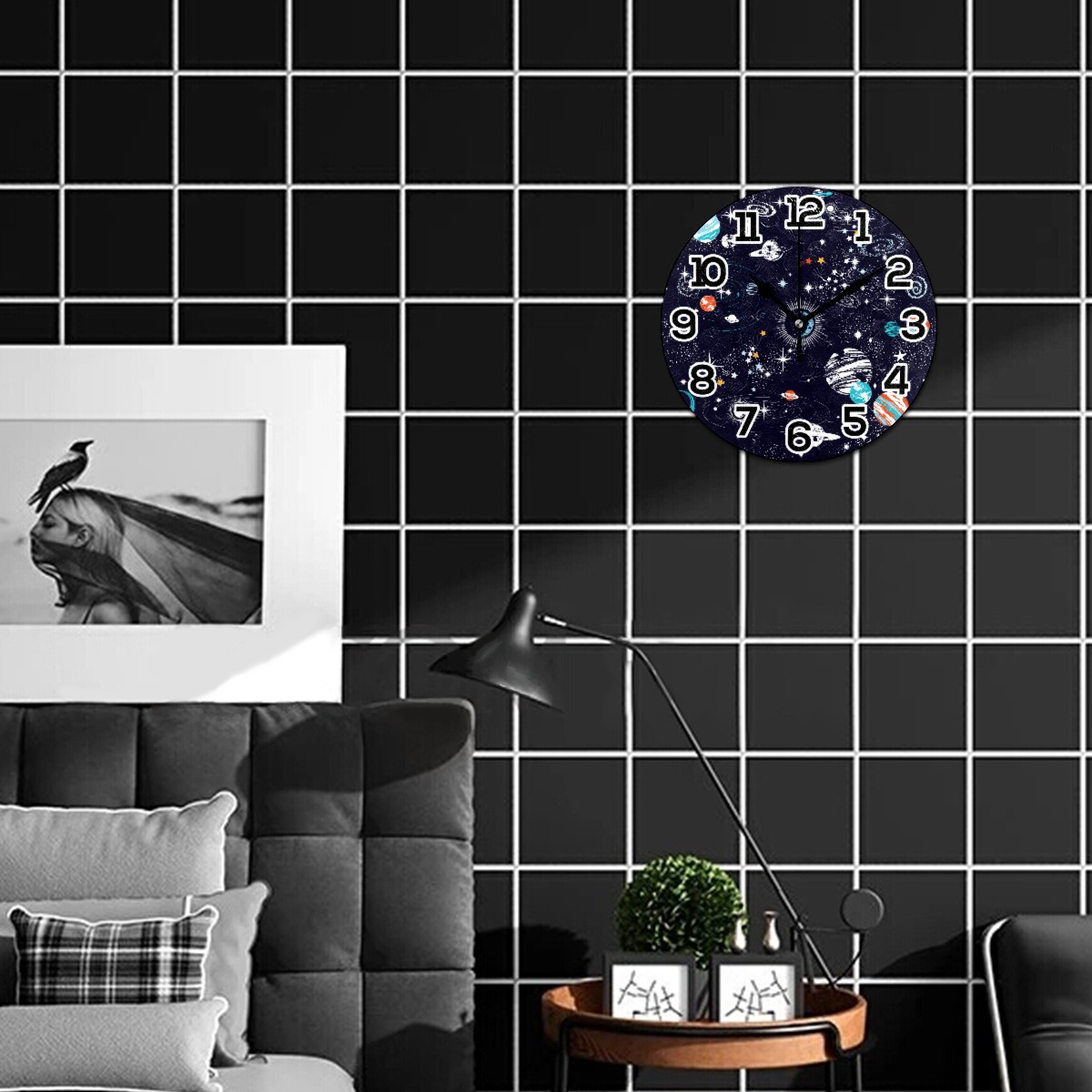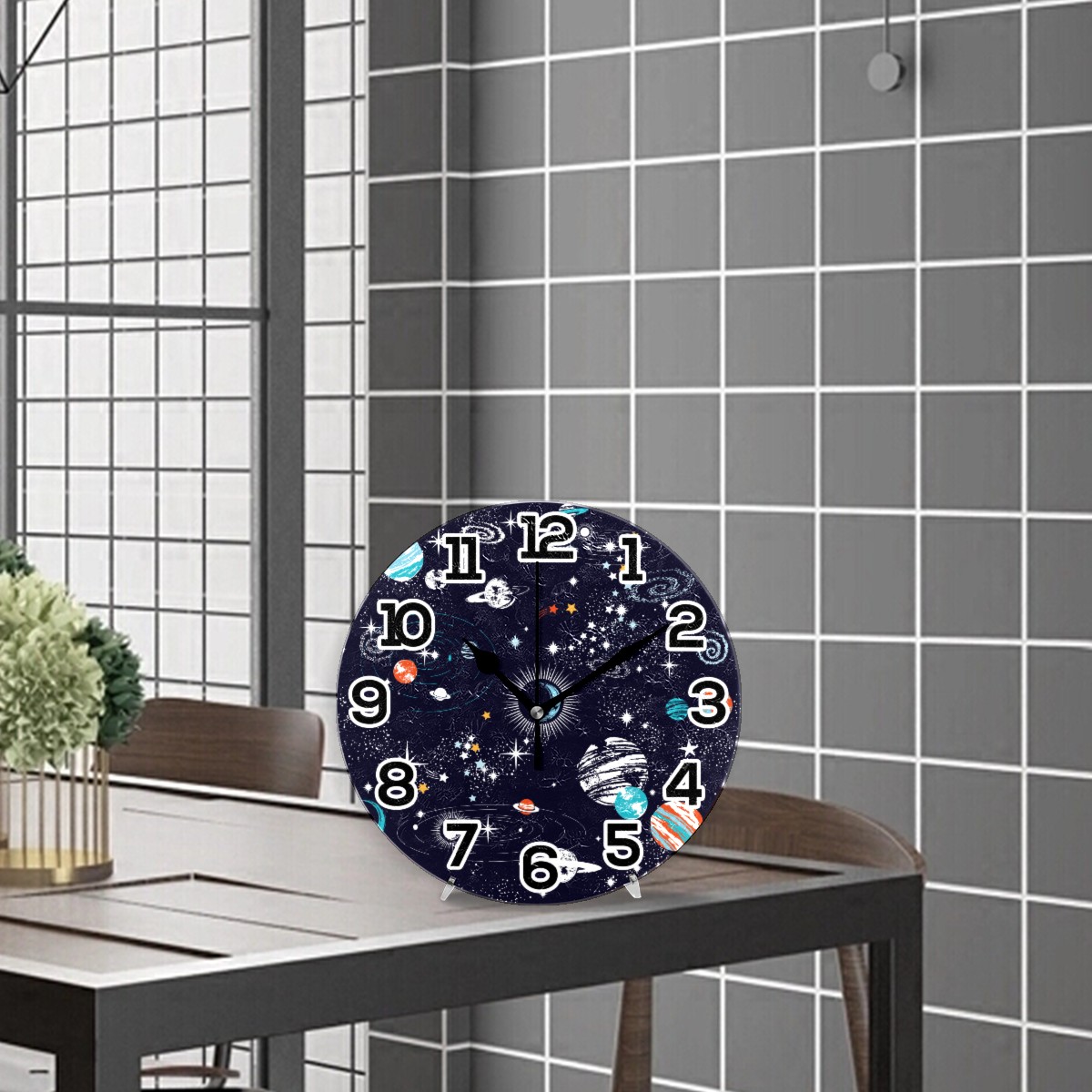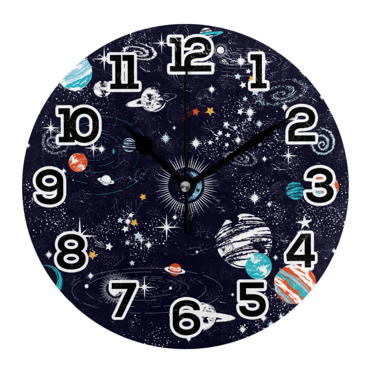 Galaxy Space Stars Planets With Rockets Clock Wall Decor Acrylic Decorative Round Battery Operated Wall Clocks for Home Bedroom Living Room Decor Silent Non Ticking
