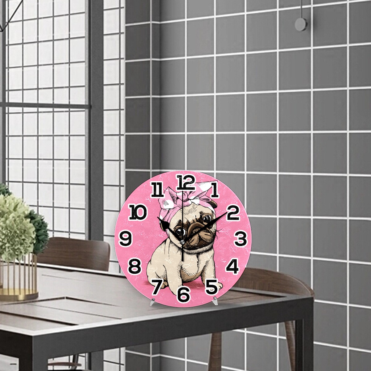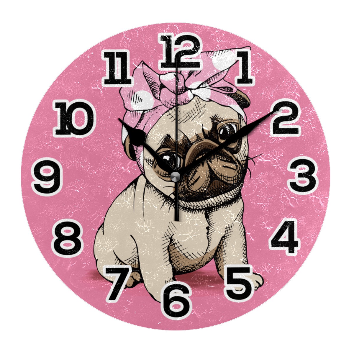Funy Pug Puppy Dog Makeup Clock Wall Decor Acrylic Decorative Round Battery Operated Wall Clocks for Home Bedroom Living Room Decor Silent Non Ticking