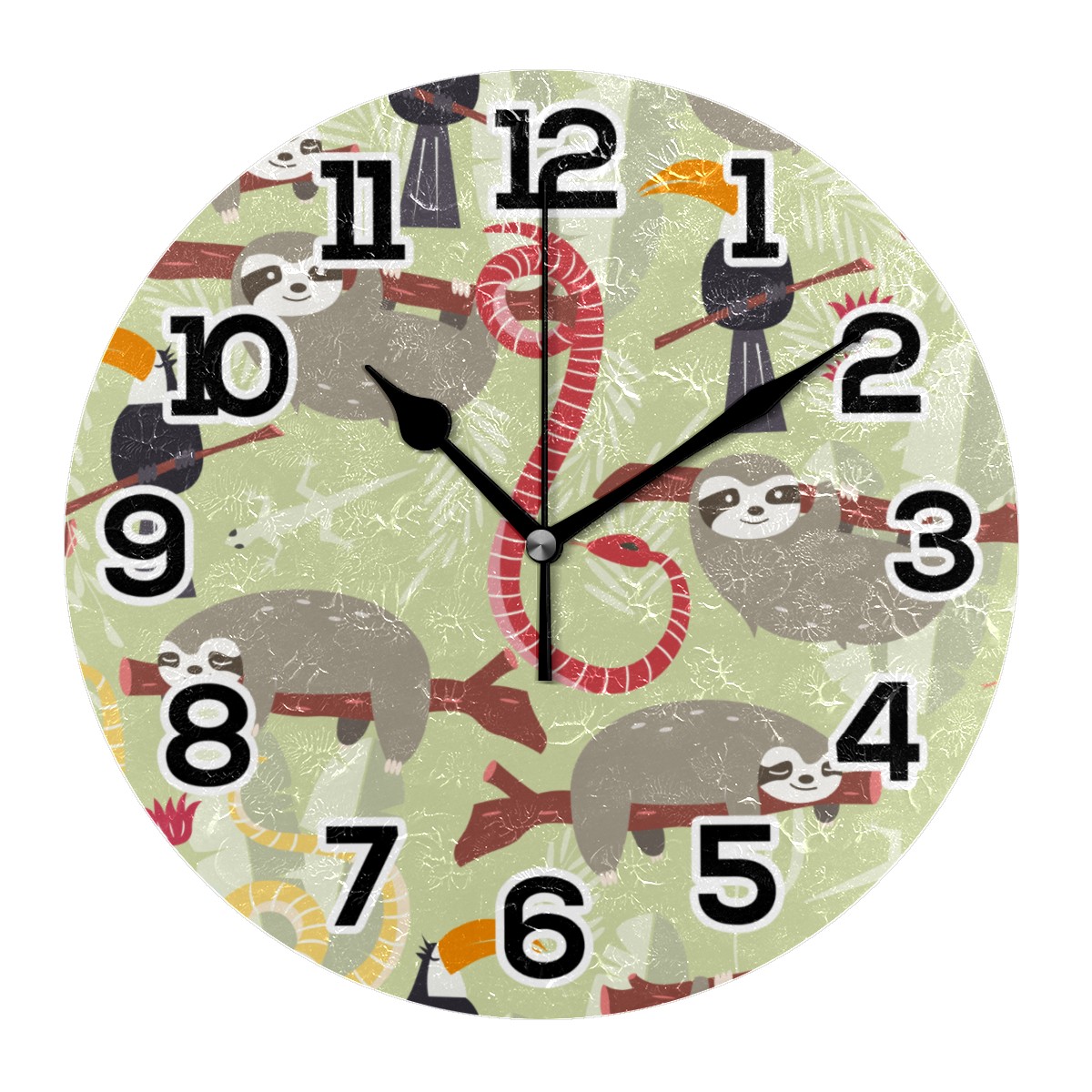 Funny Sloth Toucan Snake Pattern Clock Wall Decor Acrylic Decorative Round Battery Operated Wall Clocks for Home Bedroom Living Room Decor Silent Non Ticking