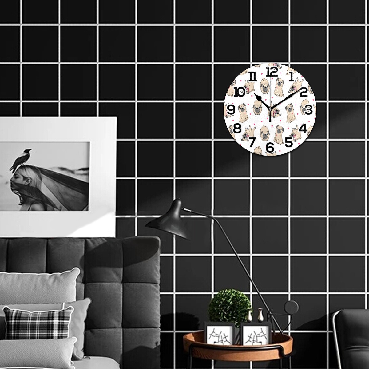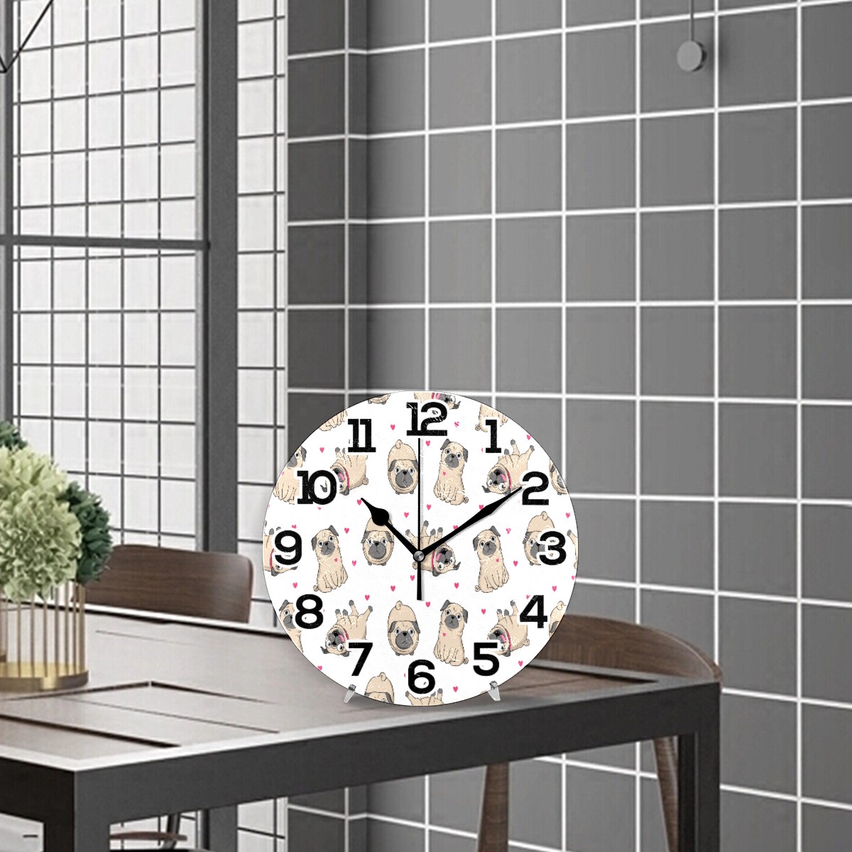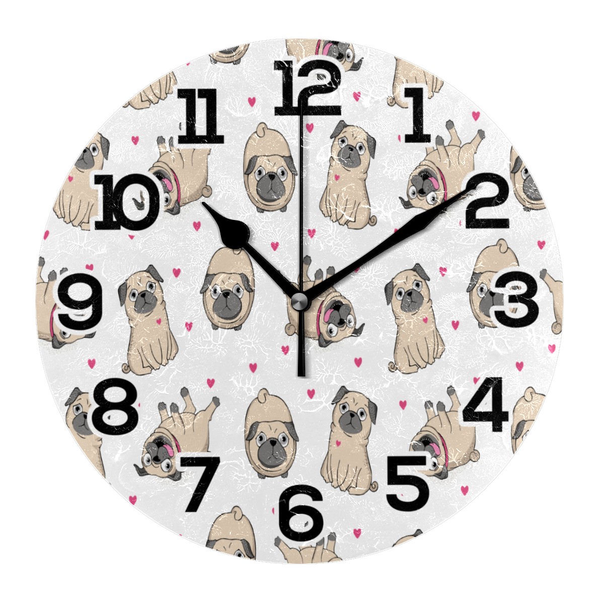 Funny Pug Puppy Dog Heart Pattern Clock Wall Decor Acrylic Decorative Round Battery Operated Wall Clocks for Home Bedroom Living Room Decor Silent Non Ticking