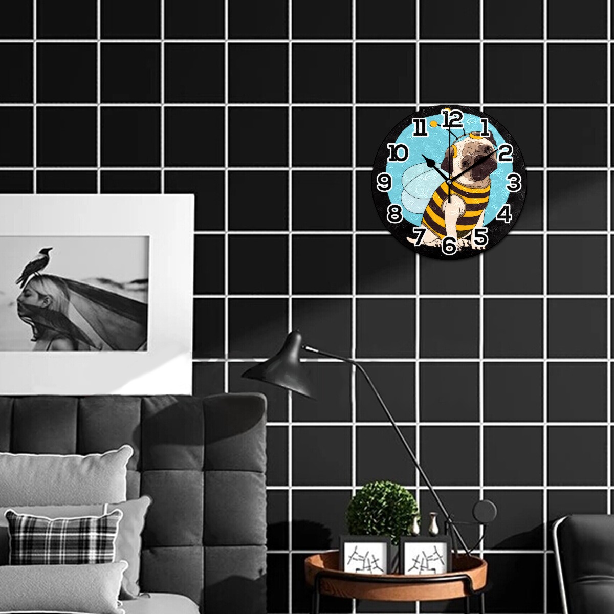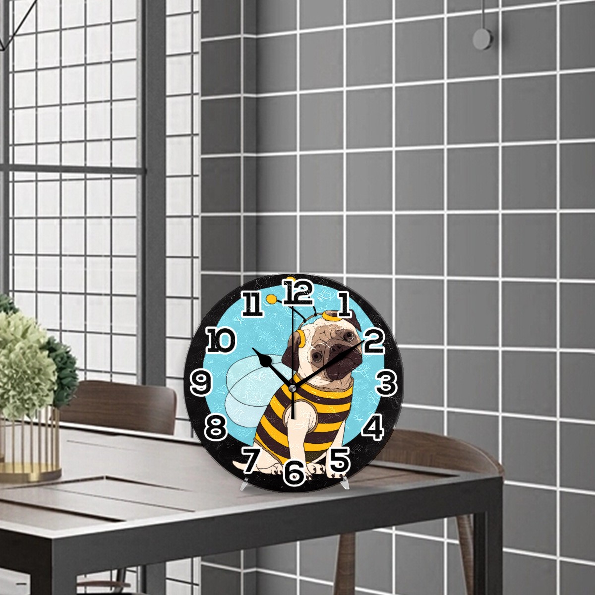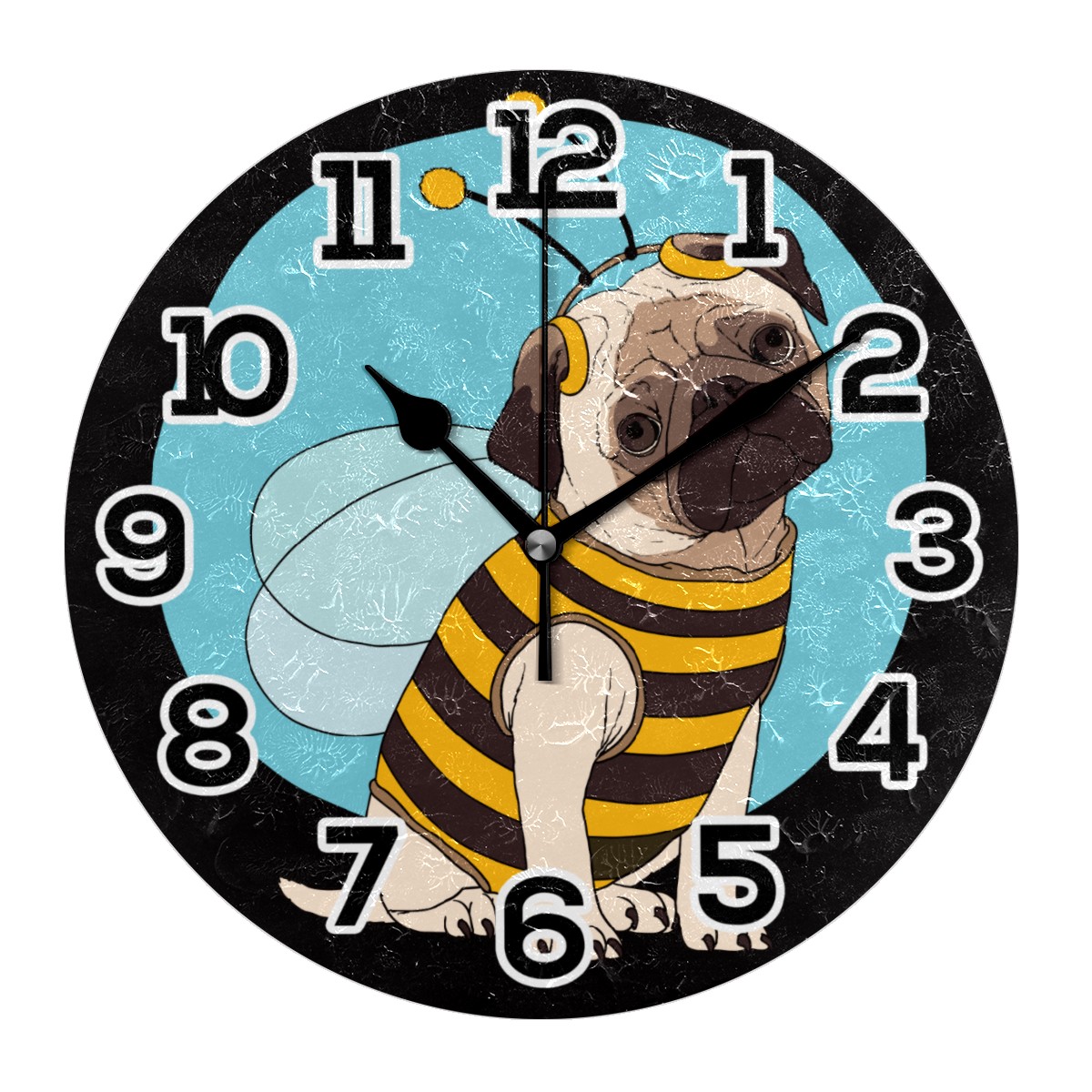 Funny Pug Puppy Dog Bee Clock Wall Decor Acrylic Decorative Round Battery Operated Wall Clocks for Home Bedroom Living Room Decor Silent Non Ticking