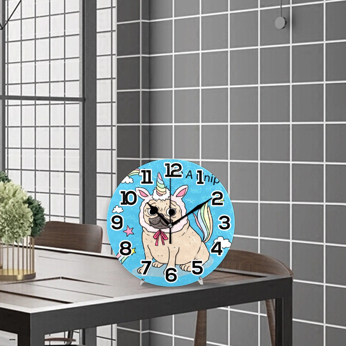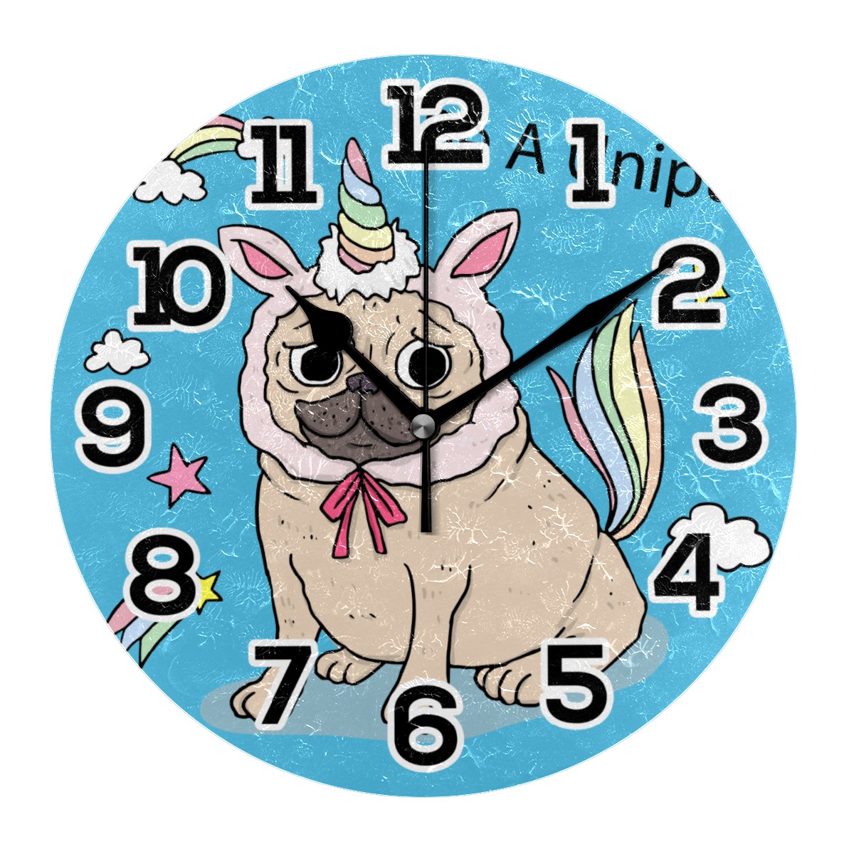 Funny Pug Dog Be A Unicorn Clock Wall Decor Acrylic Decorative Round Battery Operated Wall Clocks for Home Bedroom Living Room Decor Silent Non Ticking