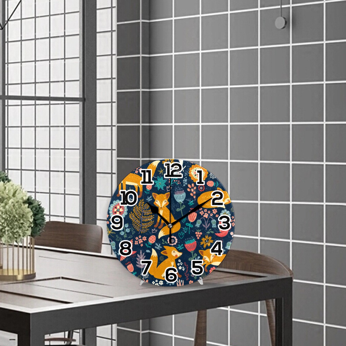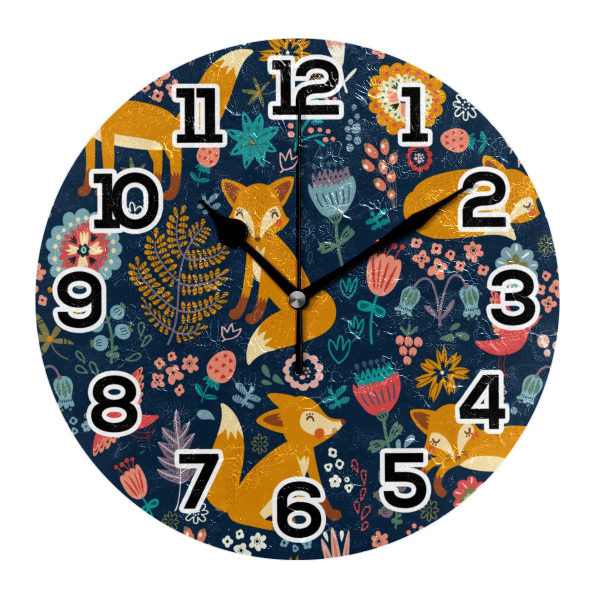 Forest Cartoon Animal Fox Bird Flower Clock Wall Decor Acrylic Decorative Round Battery Operated Wall Clocks for Home Bedroom Living Room Decor Silent Non Ticking
