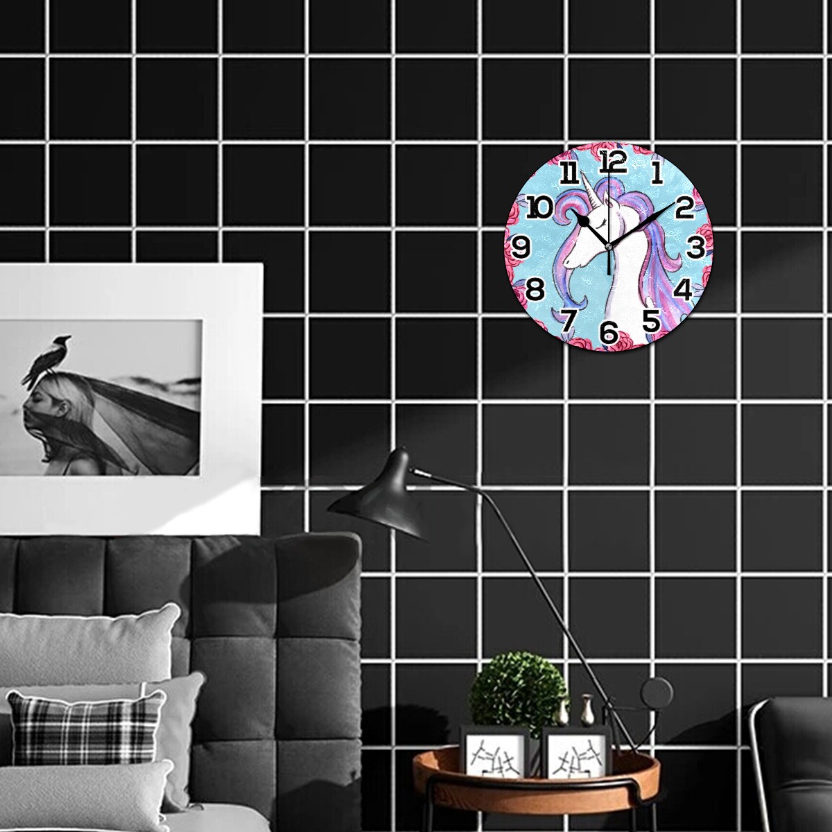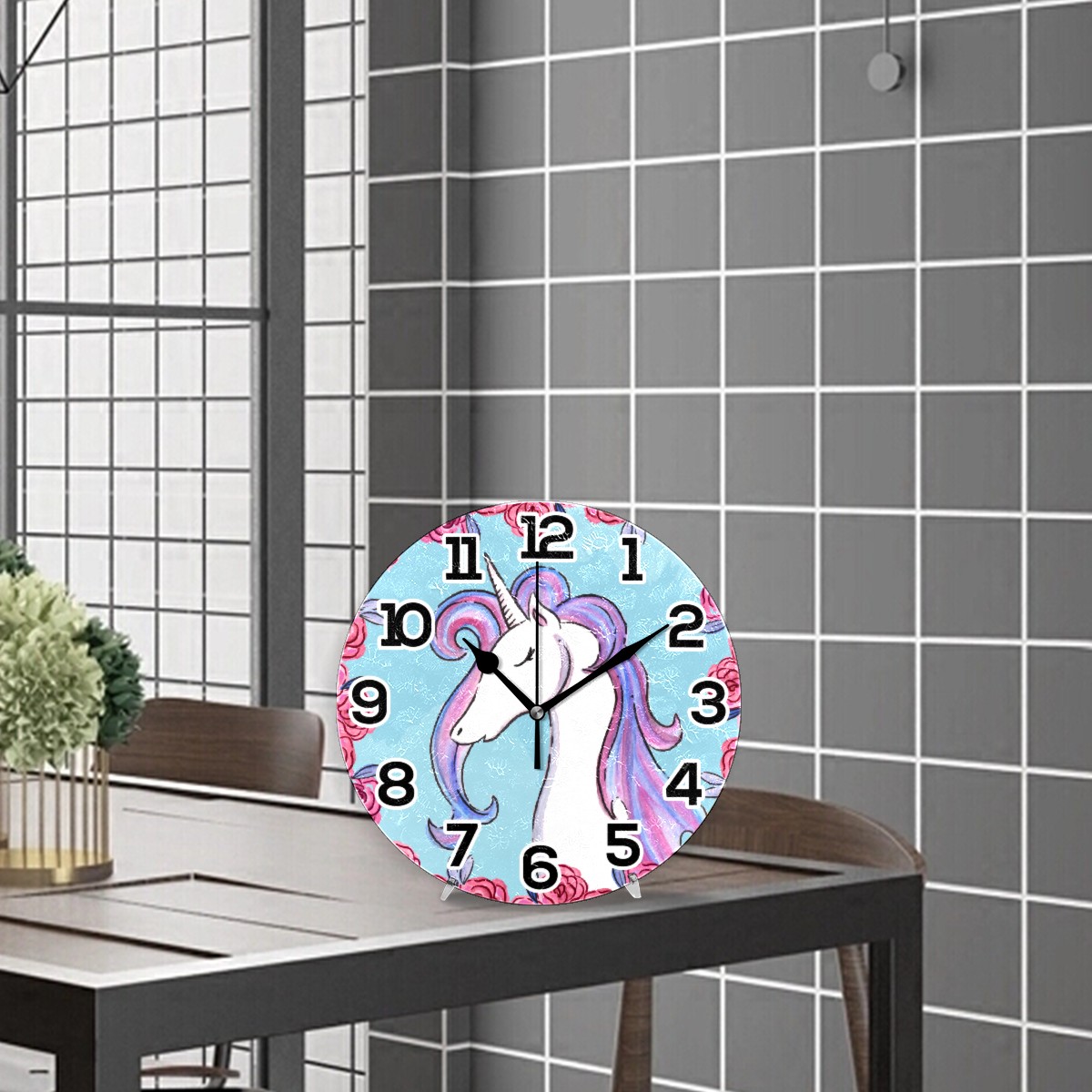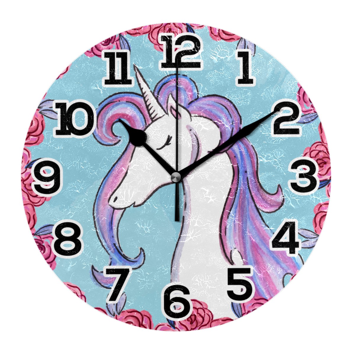 Cute Unicorn Horse Rose Flower Clock Wall Decor Acrylic Decorative Round Battery Operated Wall Clocks for Home Bedroom Living Room Decor Silent Non Ticking