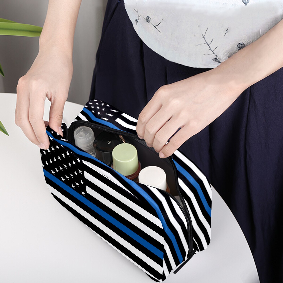 Cosmetic Bag for Women Girls Trave Makeup Bag Toiletry Case Pouch Accessories Organizer Thin Blue Line American Flag