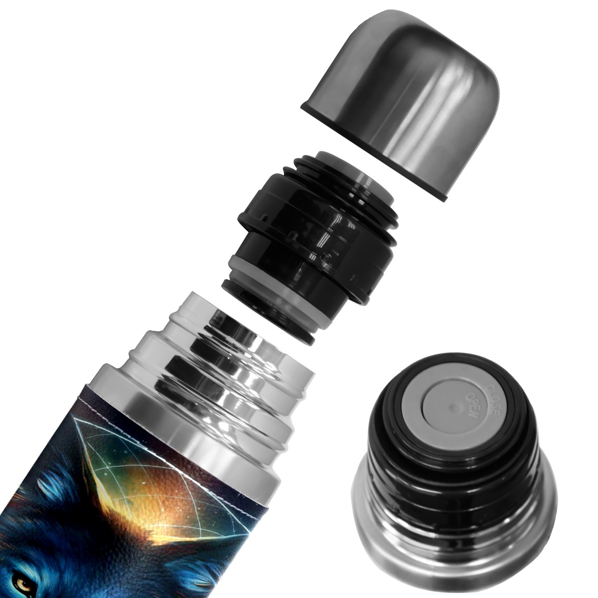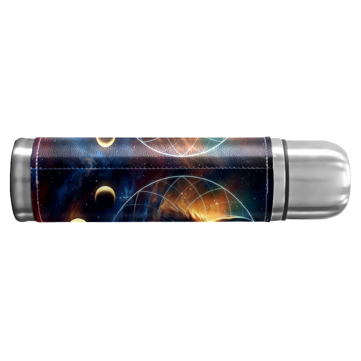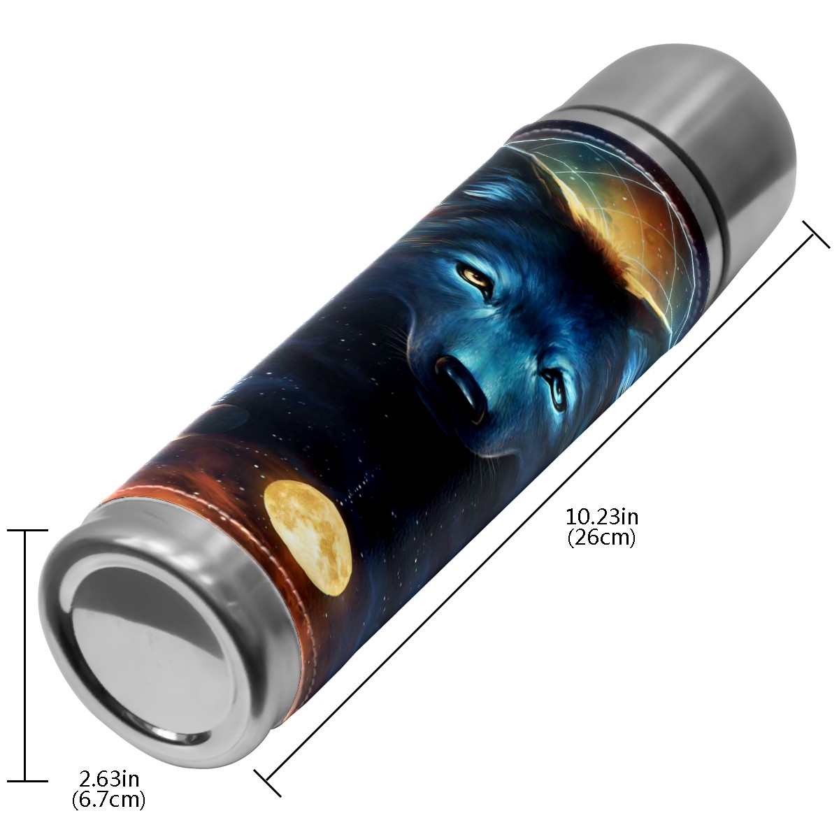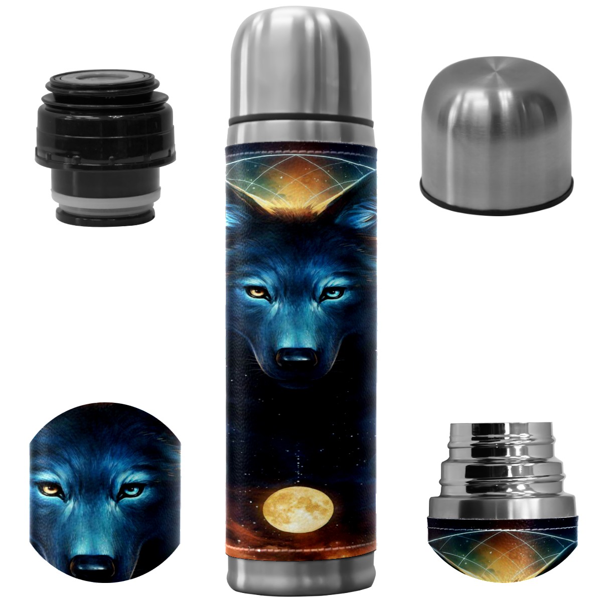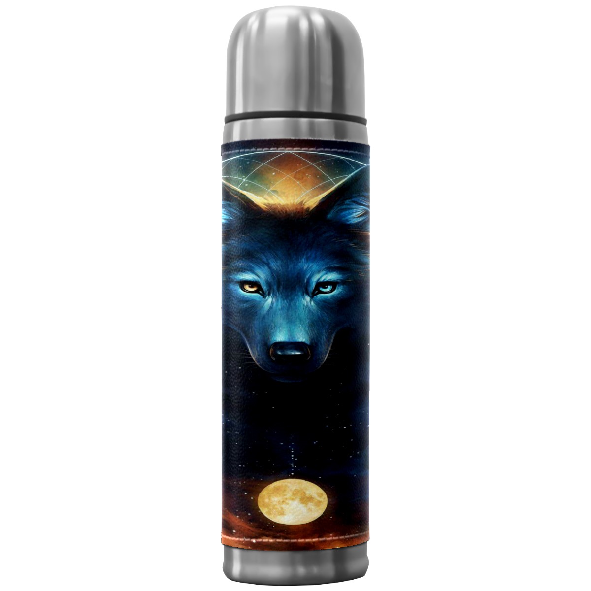 Stainless Steel Coffee Thermos Insulated Water Bottle Dream Catcher Signed Art Print Fantasy Wolf Moon Sports Coffee Travel Mug Thermos Cup Leather Wrapped Cover Double Wall Vacuum Thermos 17 OZ