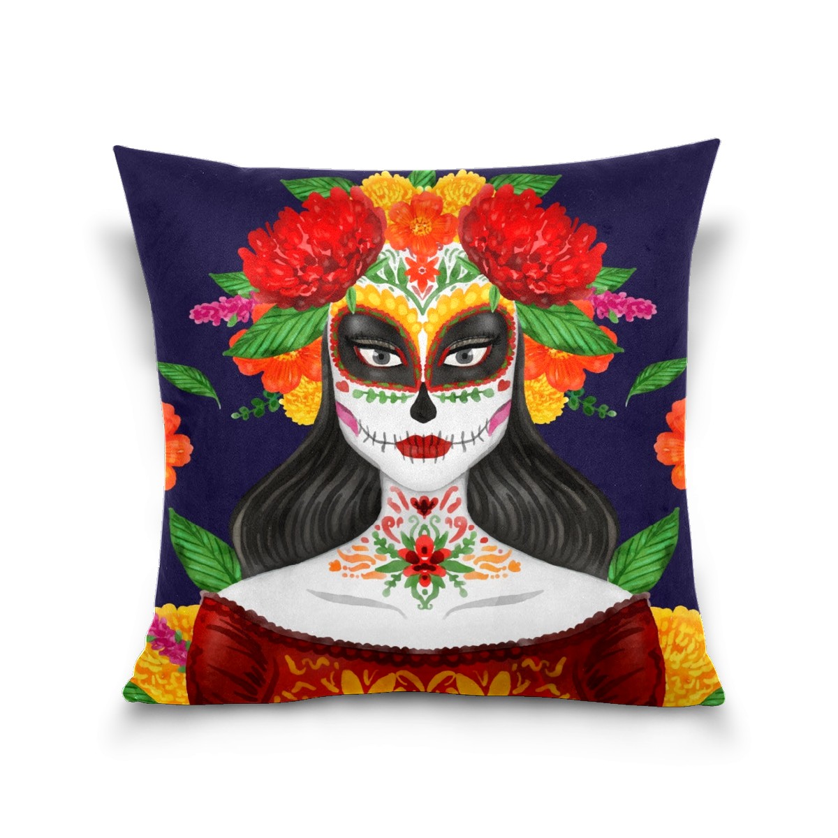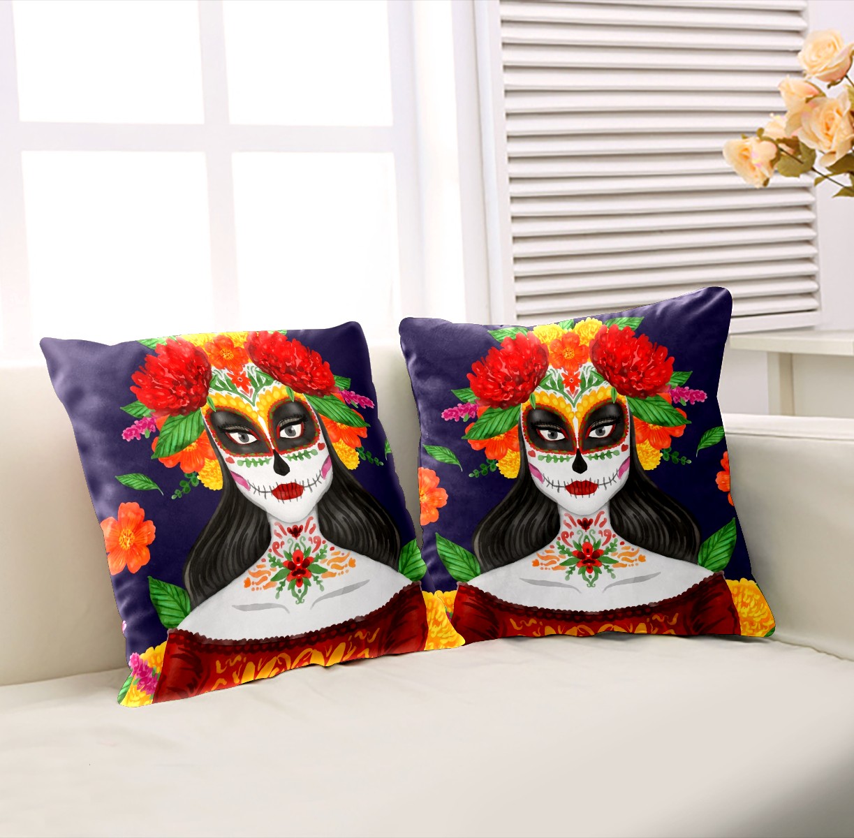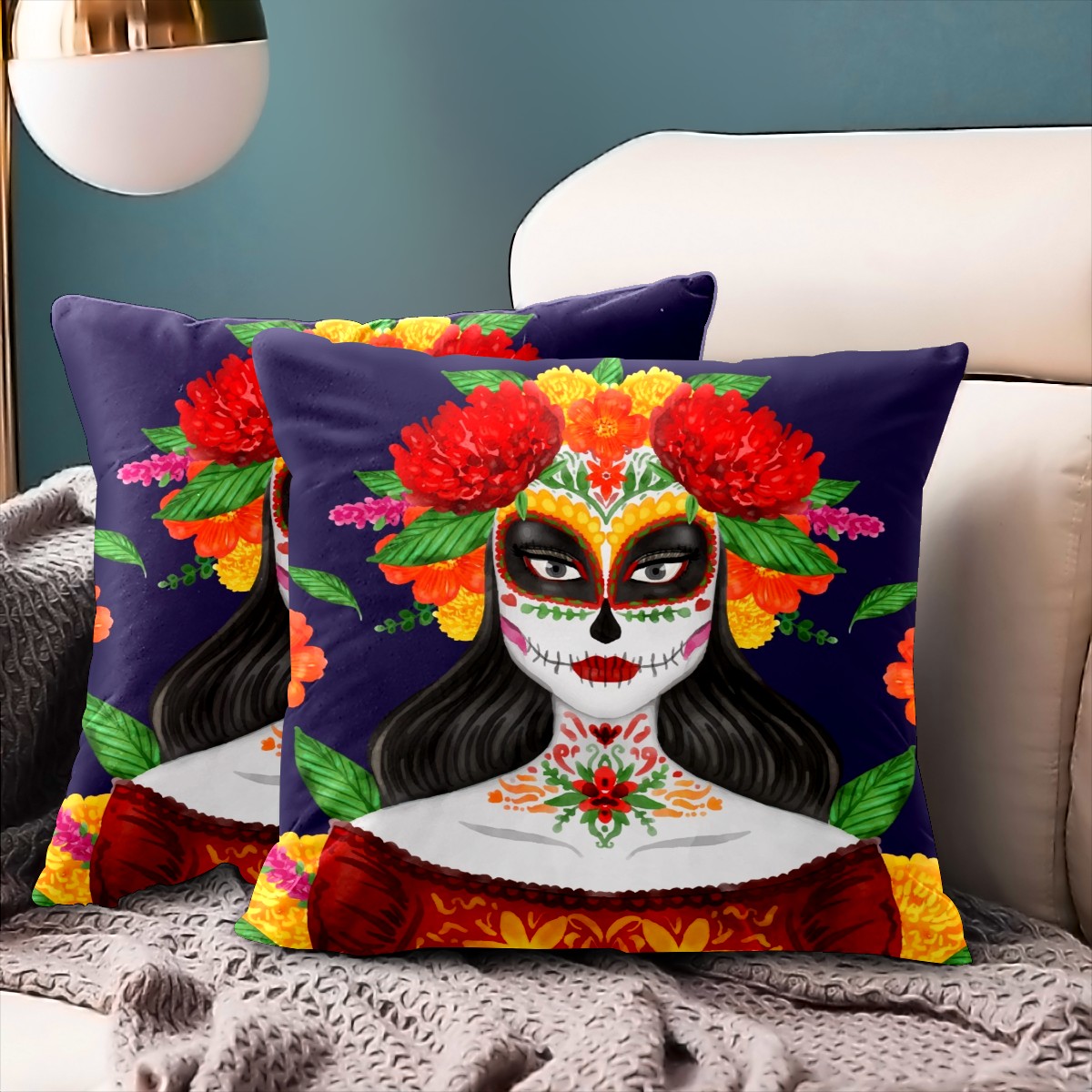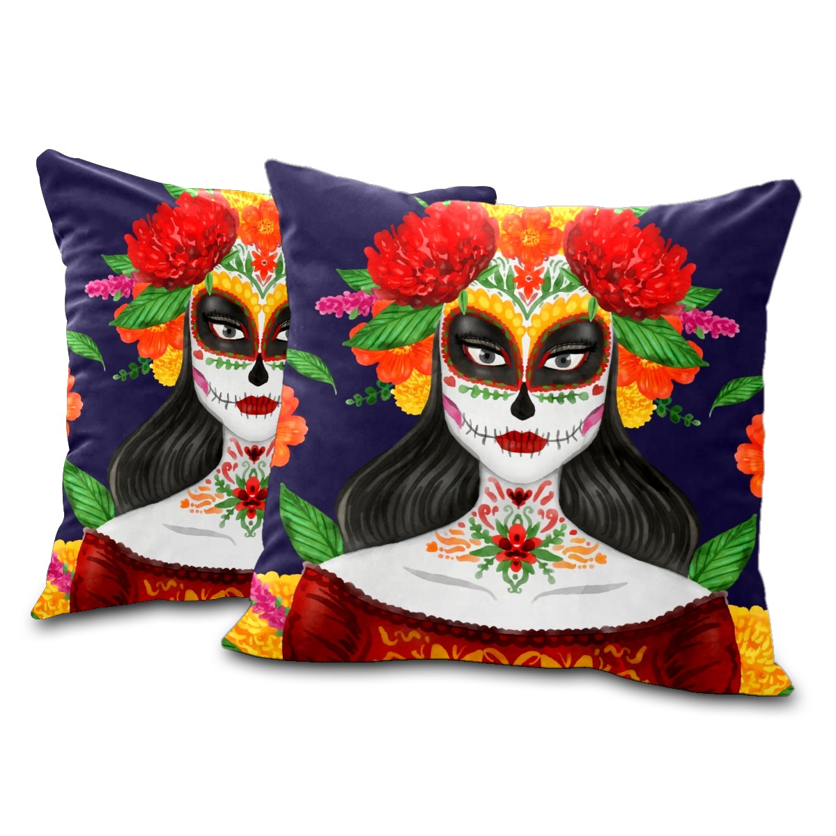 Mexican Skull Dia De Muertos Pillow Covers 16x16 Square Decorative Throw Pillow Cover Case Soft Velvet Cushion Cover for Couch Sofa Bed Living Room Car Home Decoration Set of 2