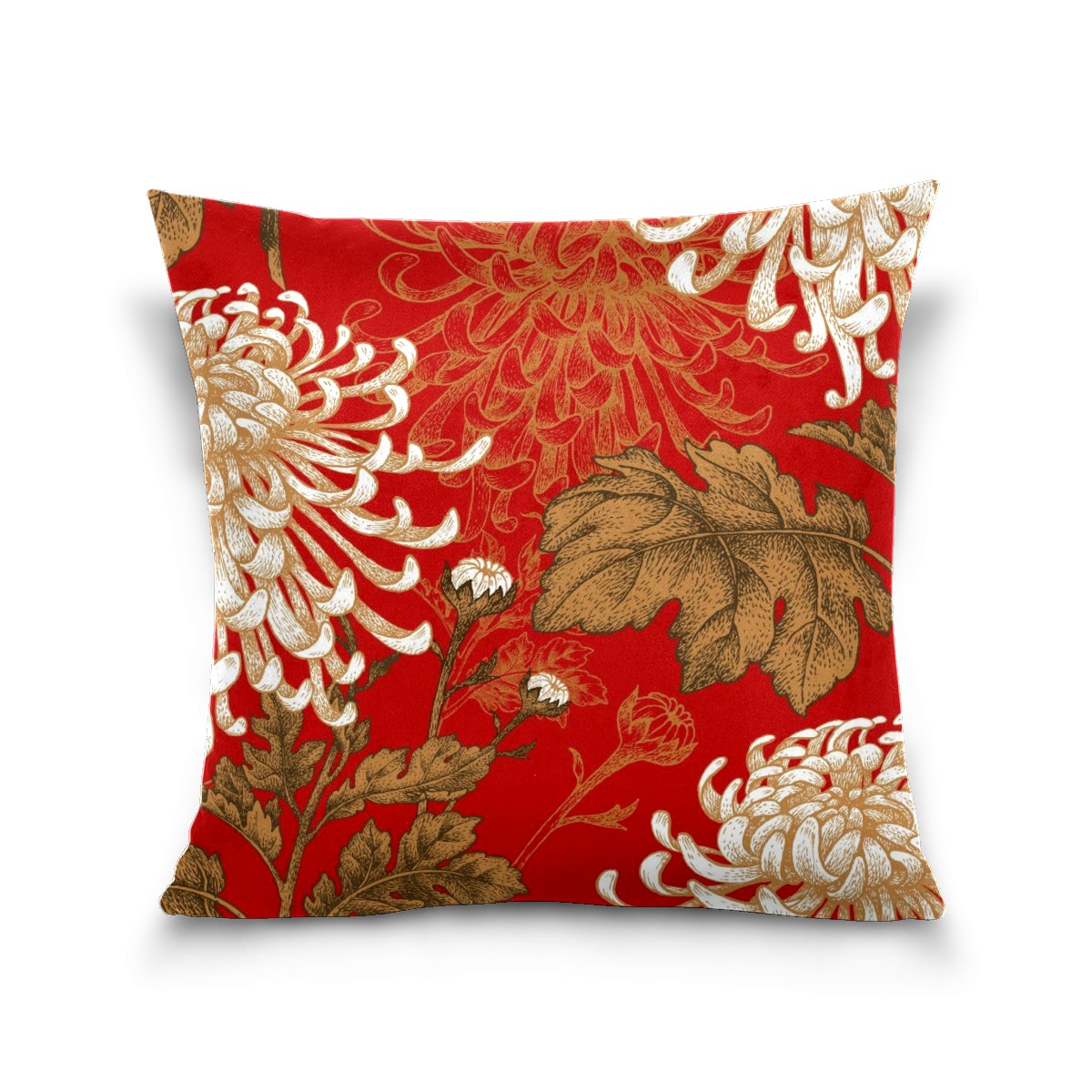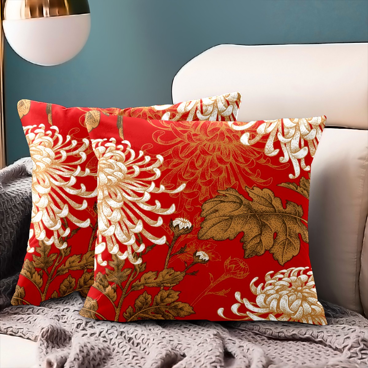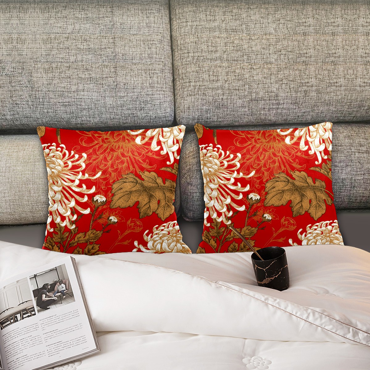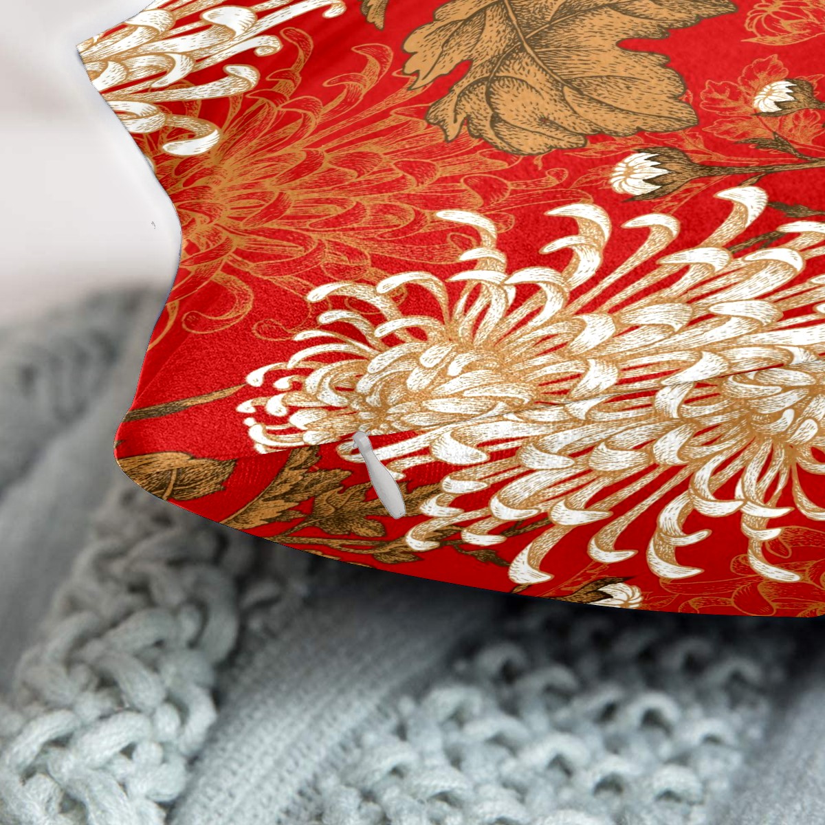 Flower Chrysanthemum Vintage Red Pillow Covers 16x16 Square Decorative Throw Pillow Cover Case Soft Velvet Cushion Cover for Couch Sofa Bed Living Room Car Home Decoration Set of 2