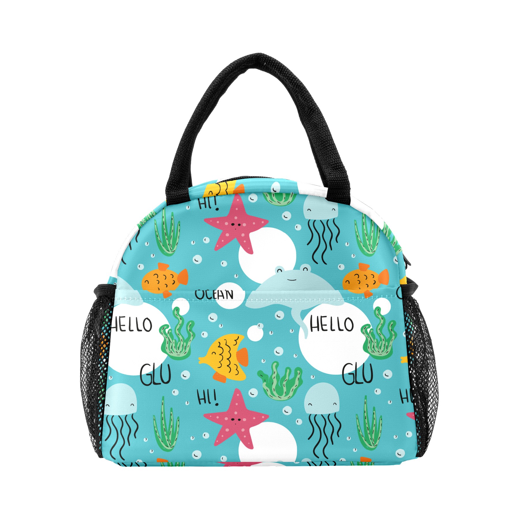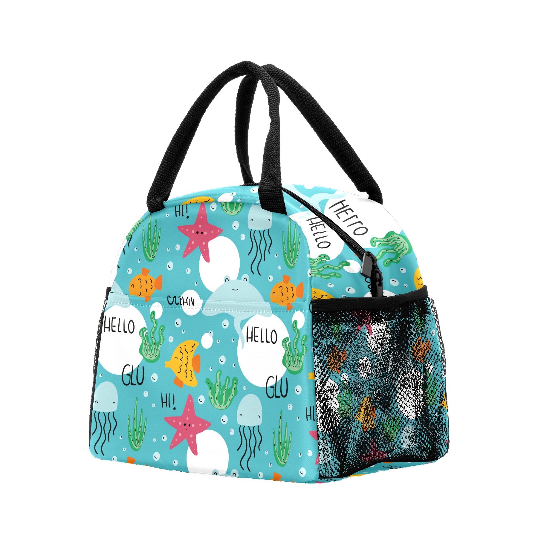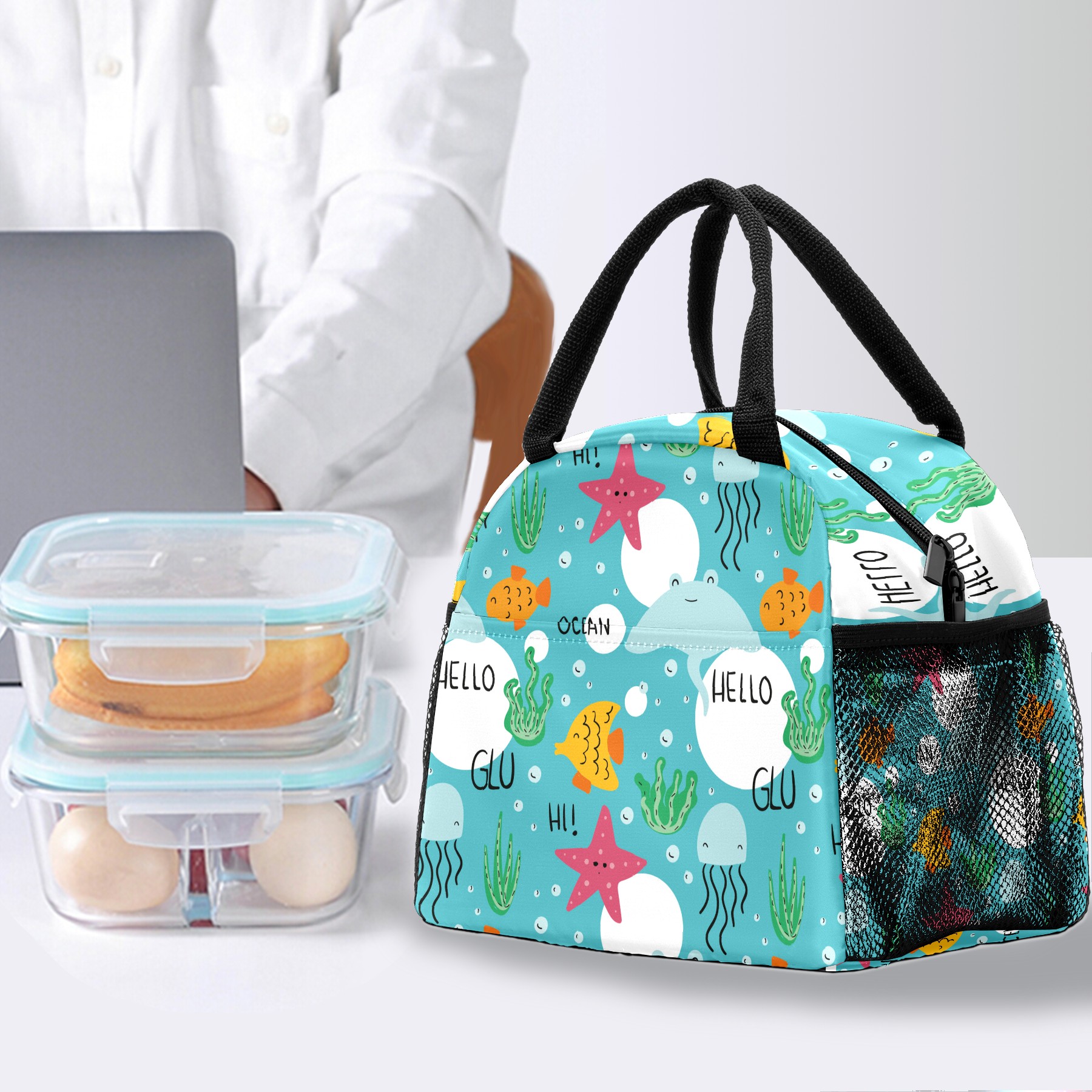 Reusable Lunch Bag Insulated Lunch Box Hand Drawn Sea Animals Lunch Tote Bag Durable Snacks Organizer for Office Work Hiking Picnic
