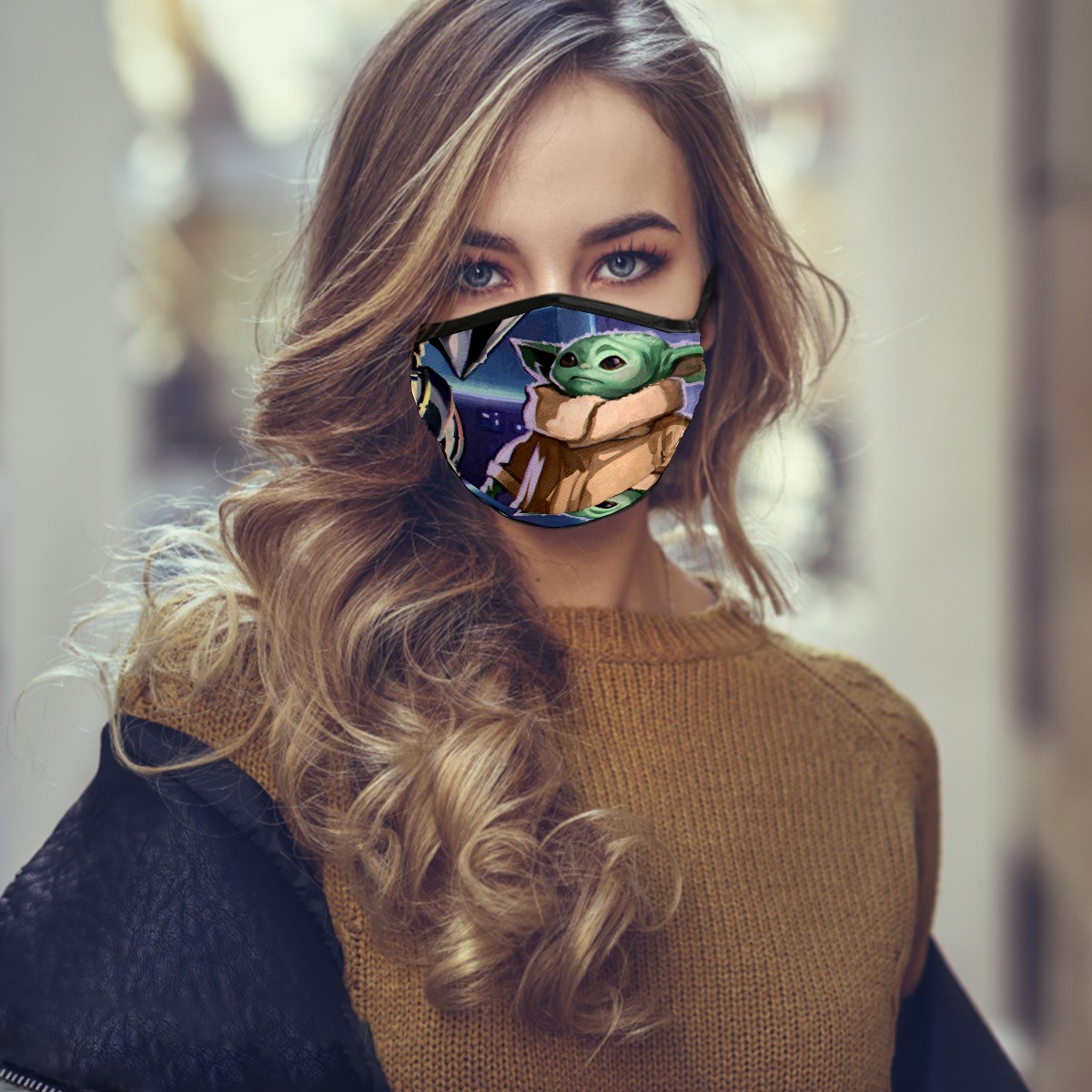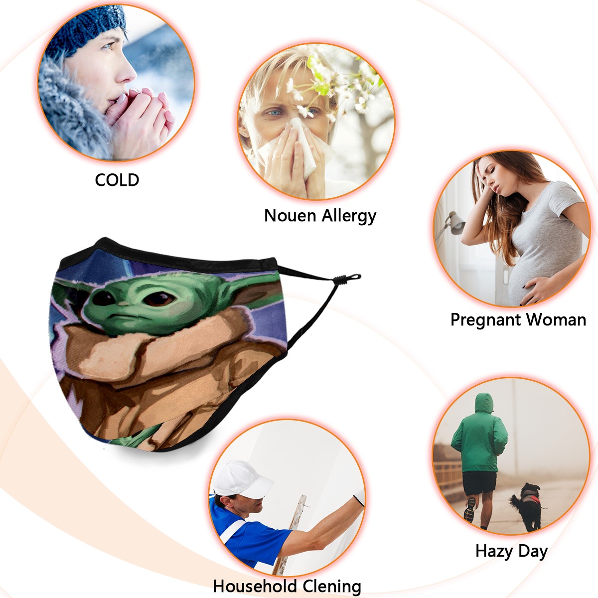 Washable Cloth Face Cover Mask Green Baby Yoda Reusable Dust Windproof Mask Face Protection Adjustable Ear Loops & Nose Wire Bandana with 6 Pcs Filter for Women Men Kids