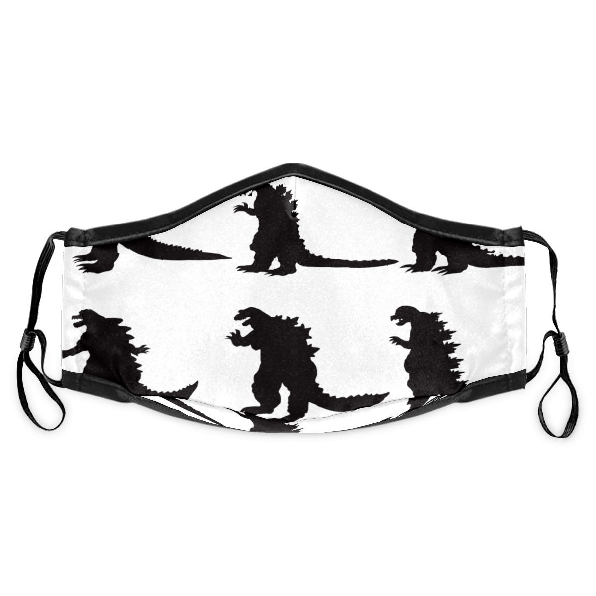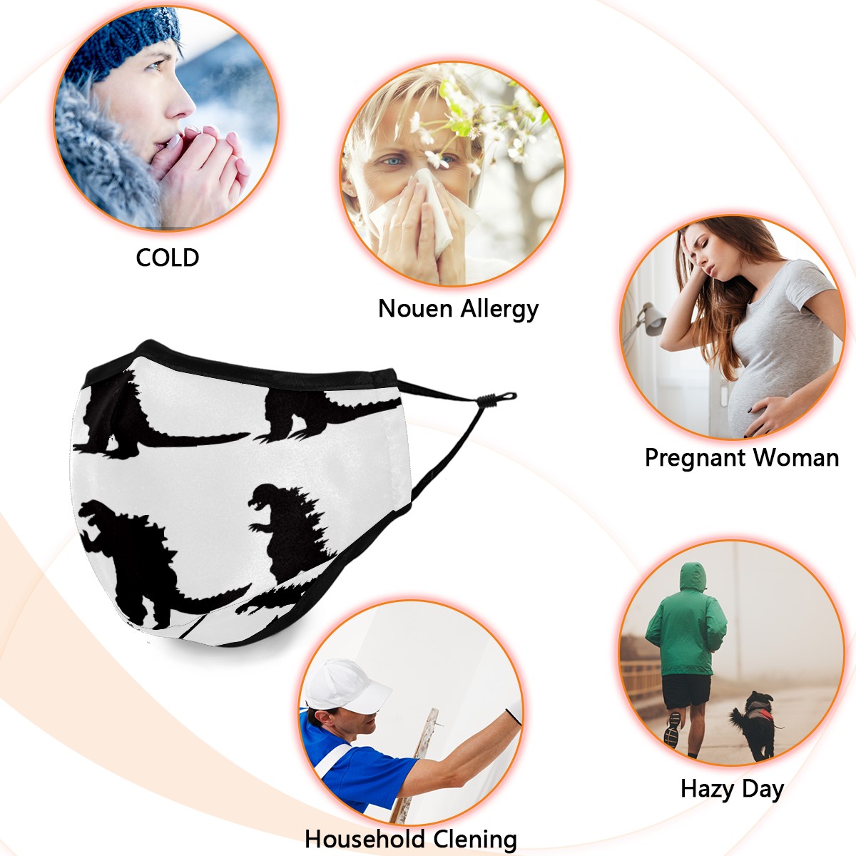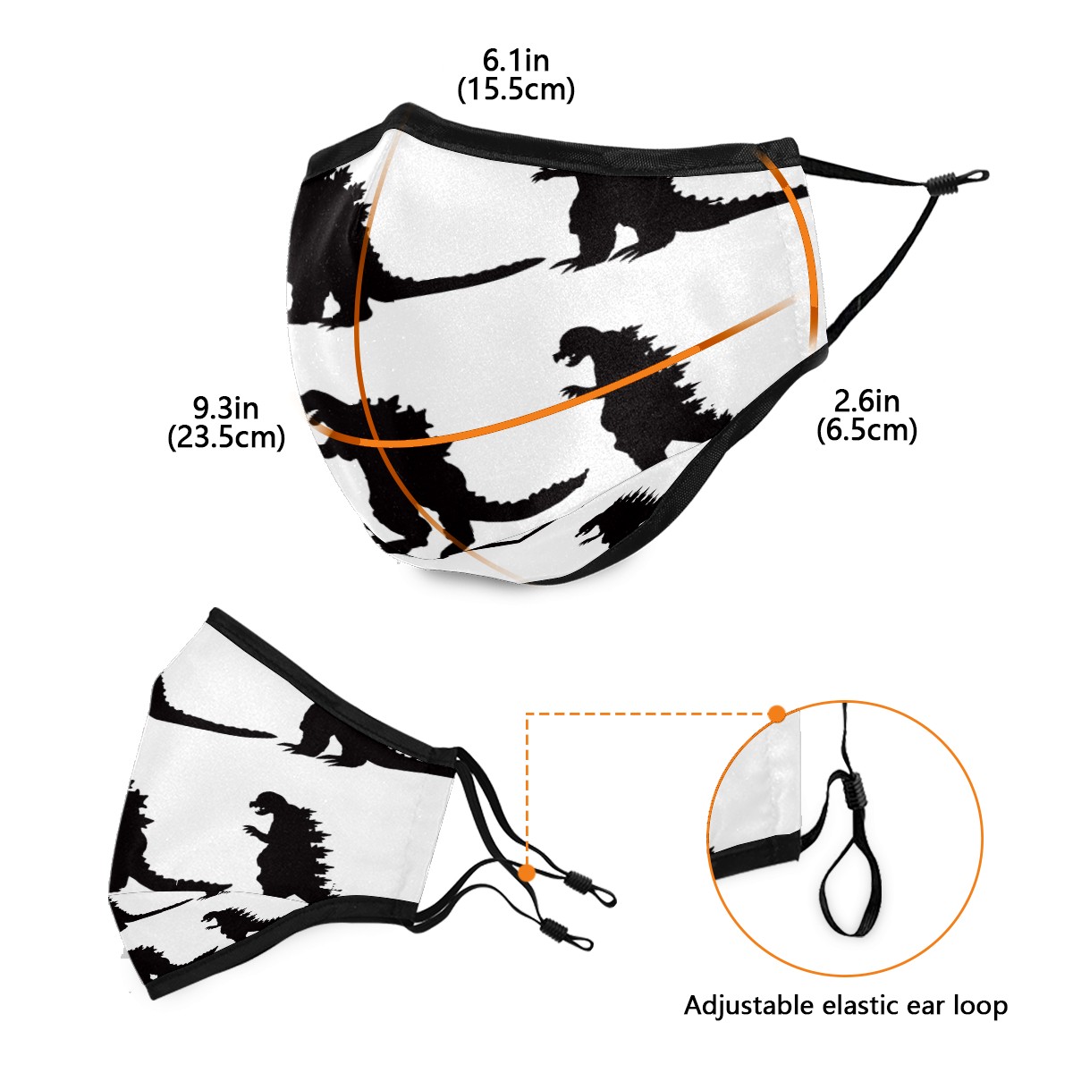 Washable Cloth Face Cover Mask Black Godzilla Dinosaur Silhouette Reusable Dust Windproof Mask Face Protection Adjustable Ear Loops & Nose Wire Bandana with 6 Pcs Filter for Women Men Kids