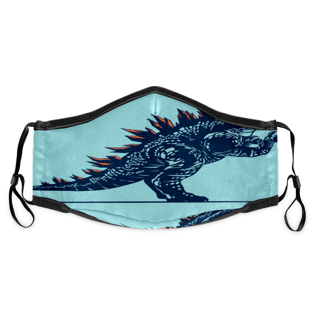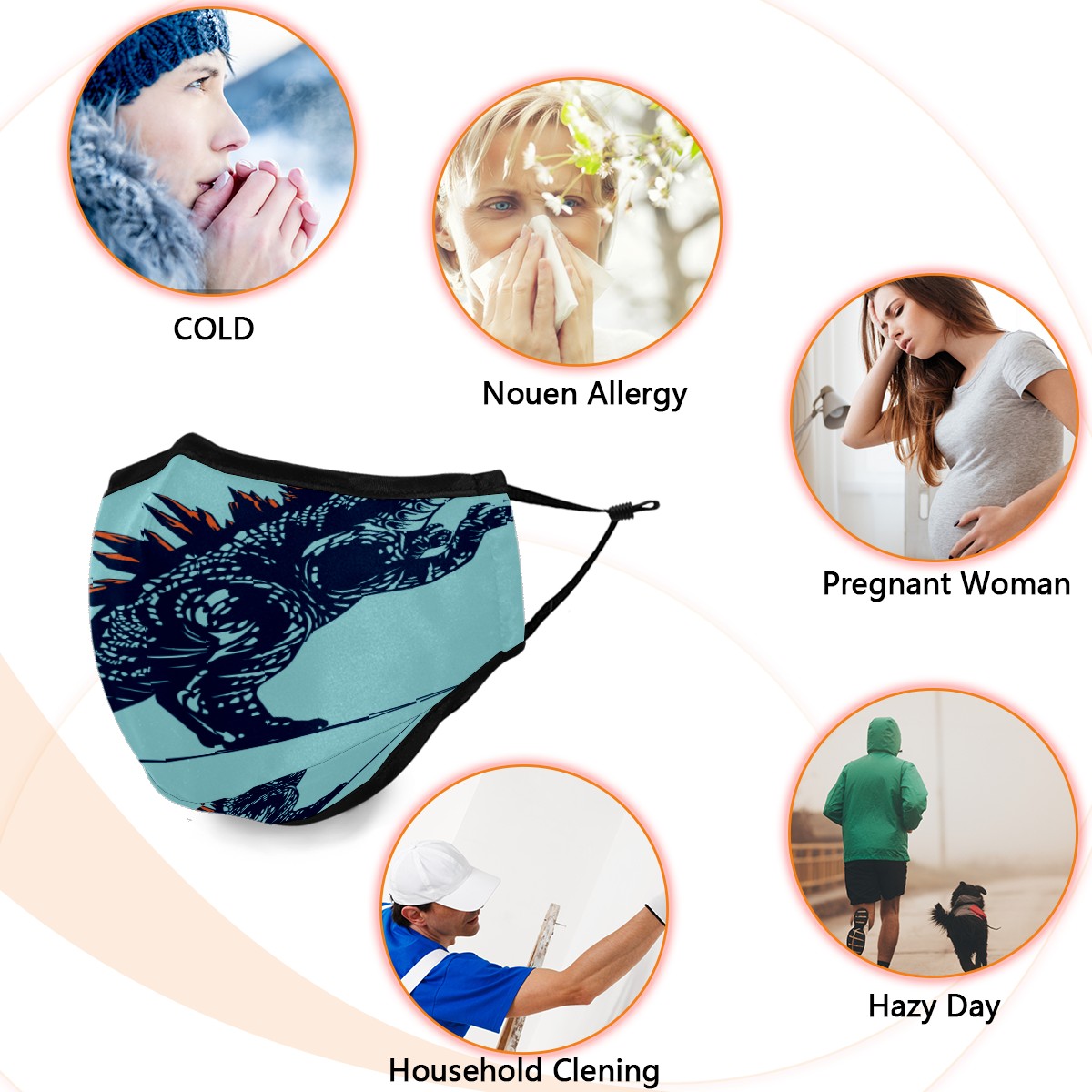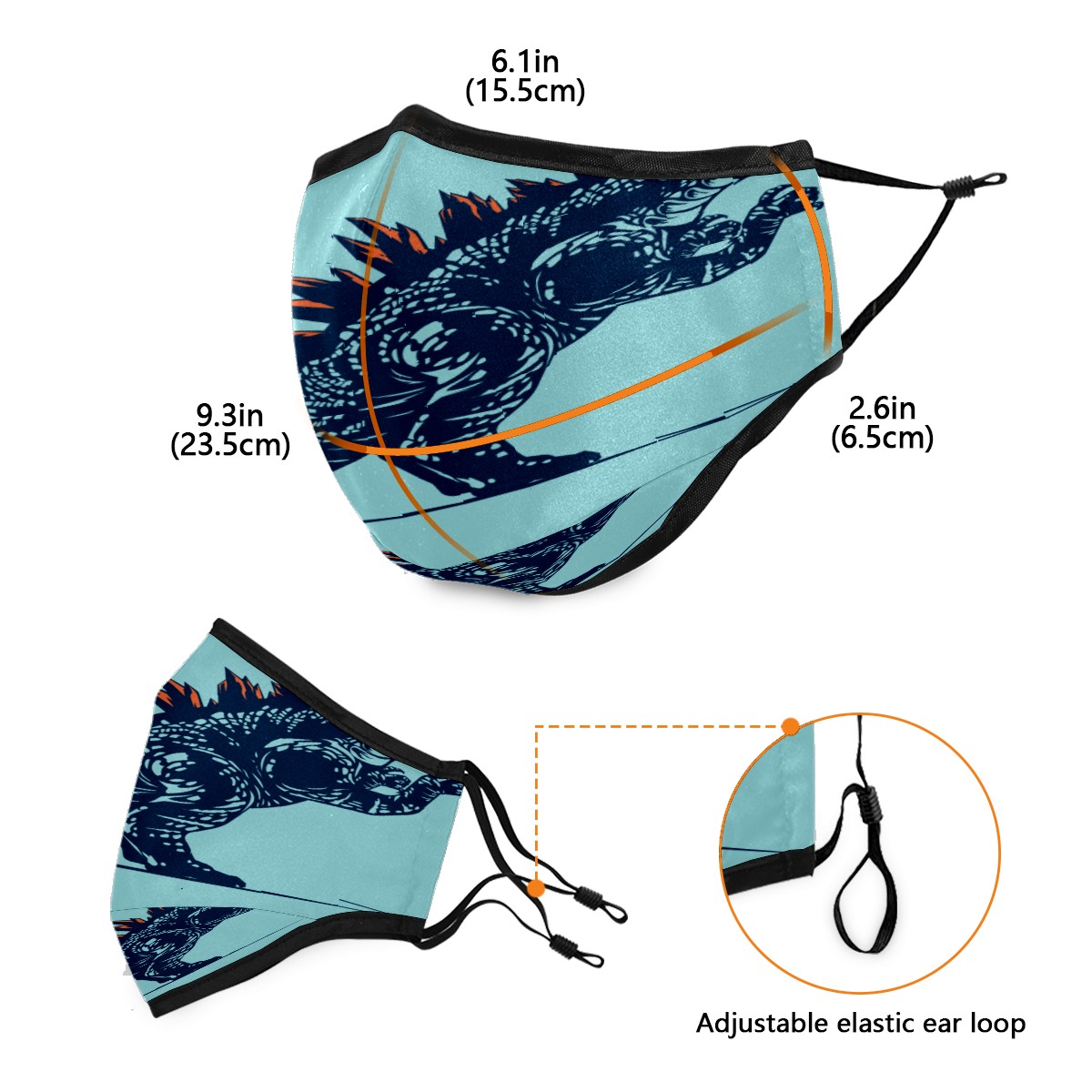 Washable Cloth Face Cover Mask Bulky Godzilla Dinosaur Blue Reusable Dust Windproof Mask Face Protection Adjustable Ear Loops & Nose Wire Bandana with 6 Pcs Filter for Women Men Kids