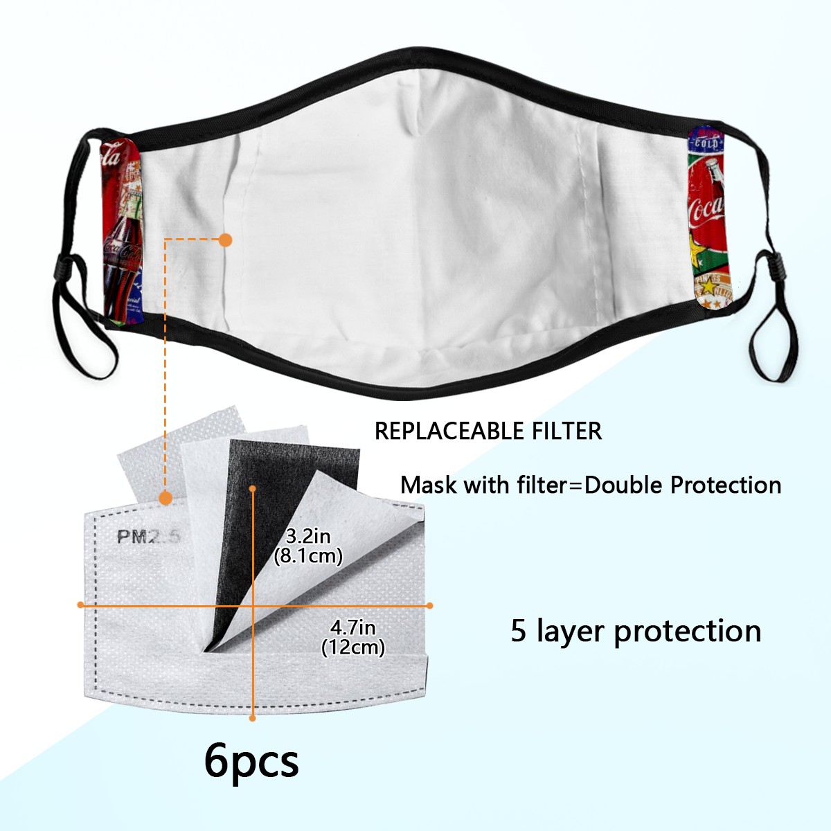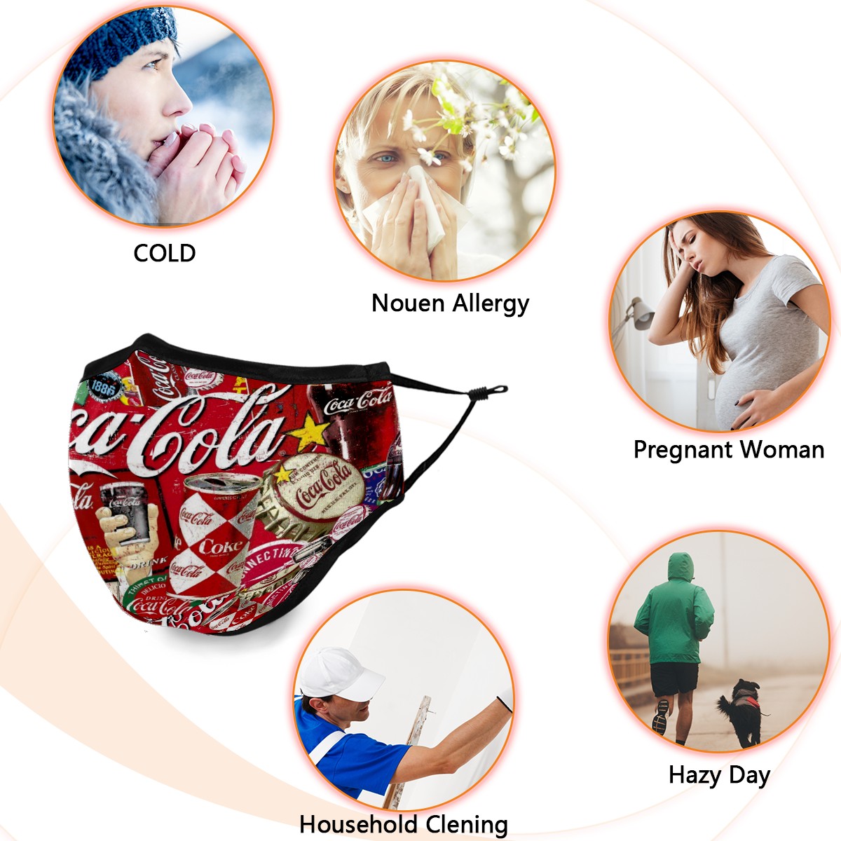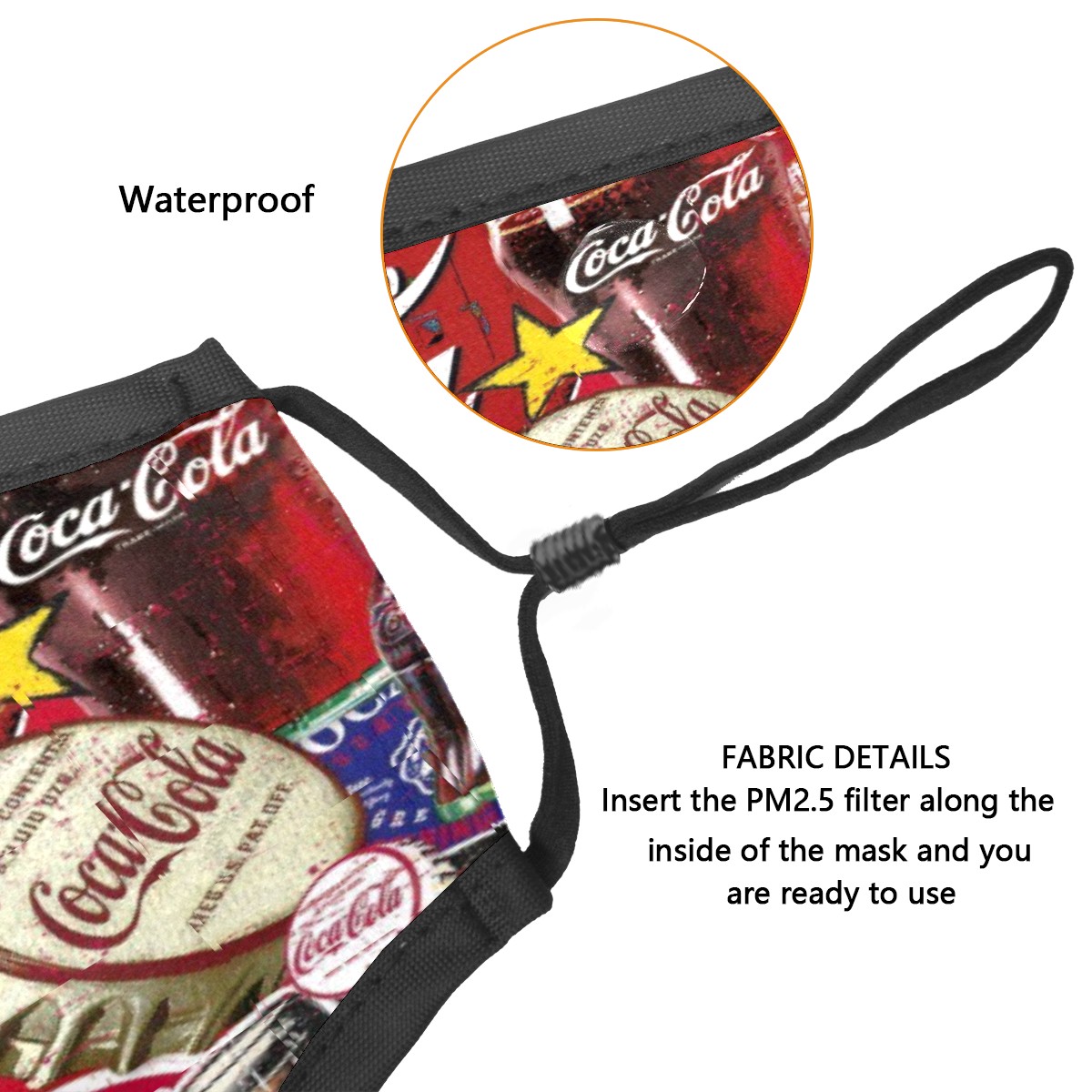 Washable Cloth Face Cover Mask Classic Coca Cola Poster Reusable Dust Windproof Mask Face Protection Adjustable Ear Loops & Nose Wire Bandana with 6 Pcs Filter for Women Men Kids